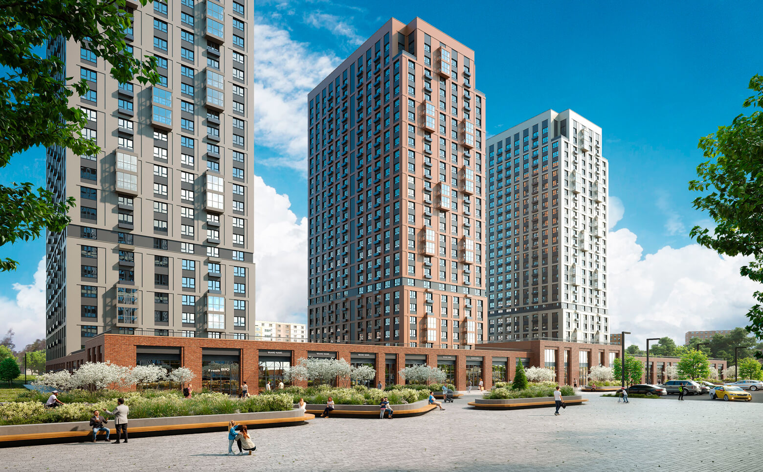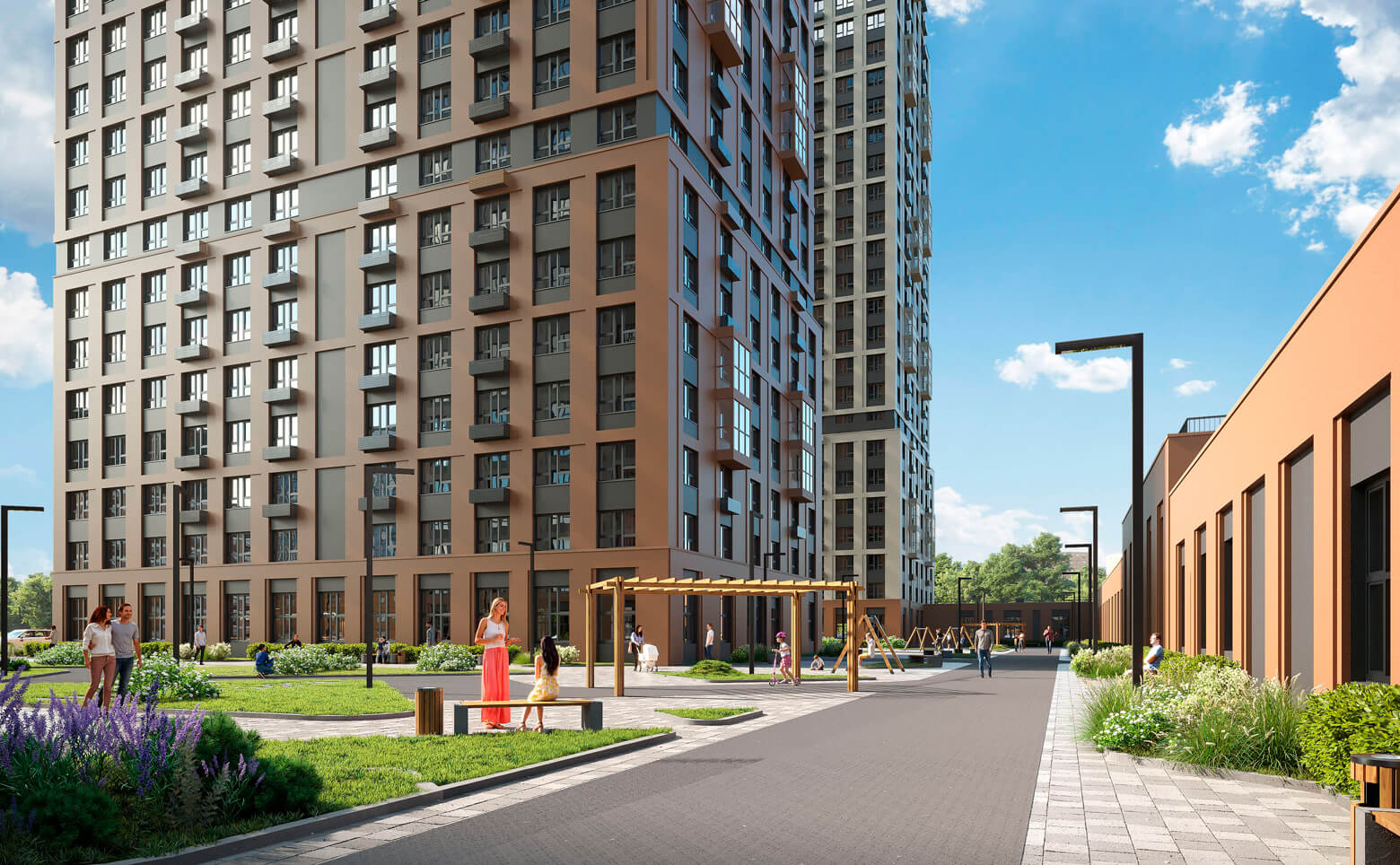 Внутренний двор имеет концепцию двор без машин. Пространство оформлено в едином стиле с лаунж-зонами, велоинфраструктурой и зелеными изгородями из цветов. Ведется круглосуточное видеонаблюдение. Для владельцев автомобилей предусмотрен подземный паркинг.