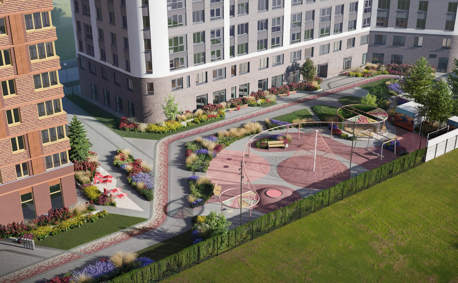 Территория комплекса закрыта от посторонних и благоустроена для комфорта жильцов разных возрастов. Для детей оборудованы игровые площадки, для взрослых — зона с шезлонгами и скамейками в окружении зелени. Во дворе действует концепция без машин, благодаря чему пространство безопасно для прогулок с детьми. Автомобилистам доступен подземный паркинг.