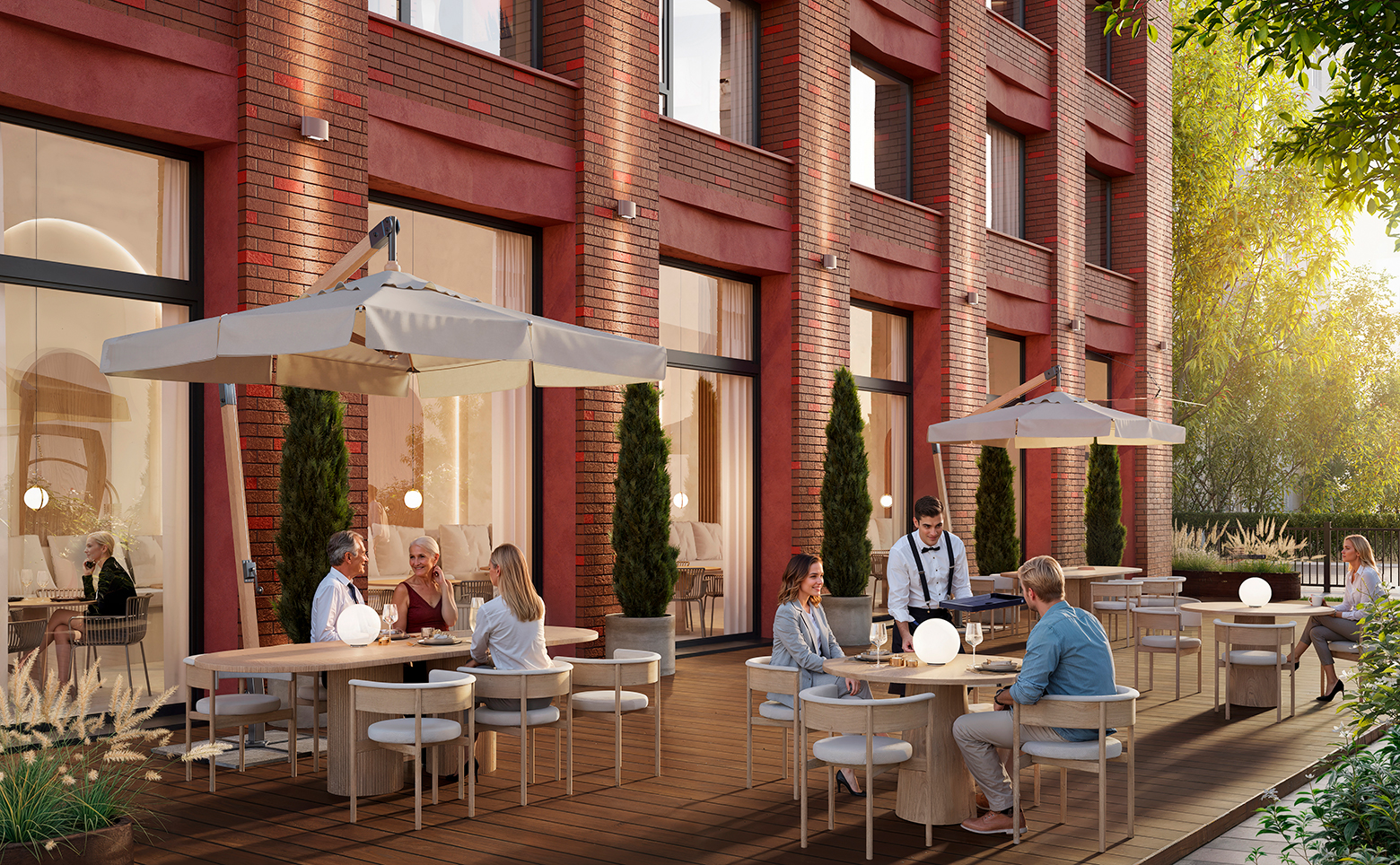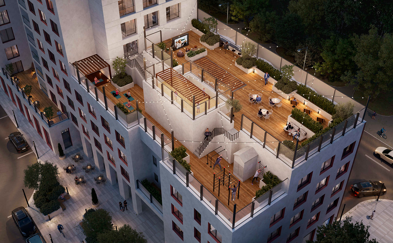 Во внутреннем дворе озелененная территория с лавочками, расположена детская площадка. Обустроен многоуровневый двор на крыше с площадками для воркаута, шезлонгами и зоной коворкинга. На первом этаже расположен семейный ресторан. В комплексе ведется круглосуточное видеонаблюдение. Вход в дом осуществляется по ключ-карте. Для владельцев автомобилей предусмотрен подземный паркинг. Въезд в паркинг осуществляется по радиометке и автоматическому считывателю номеров.