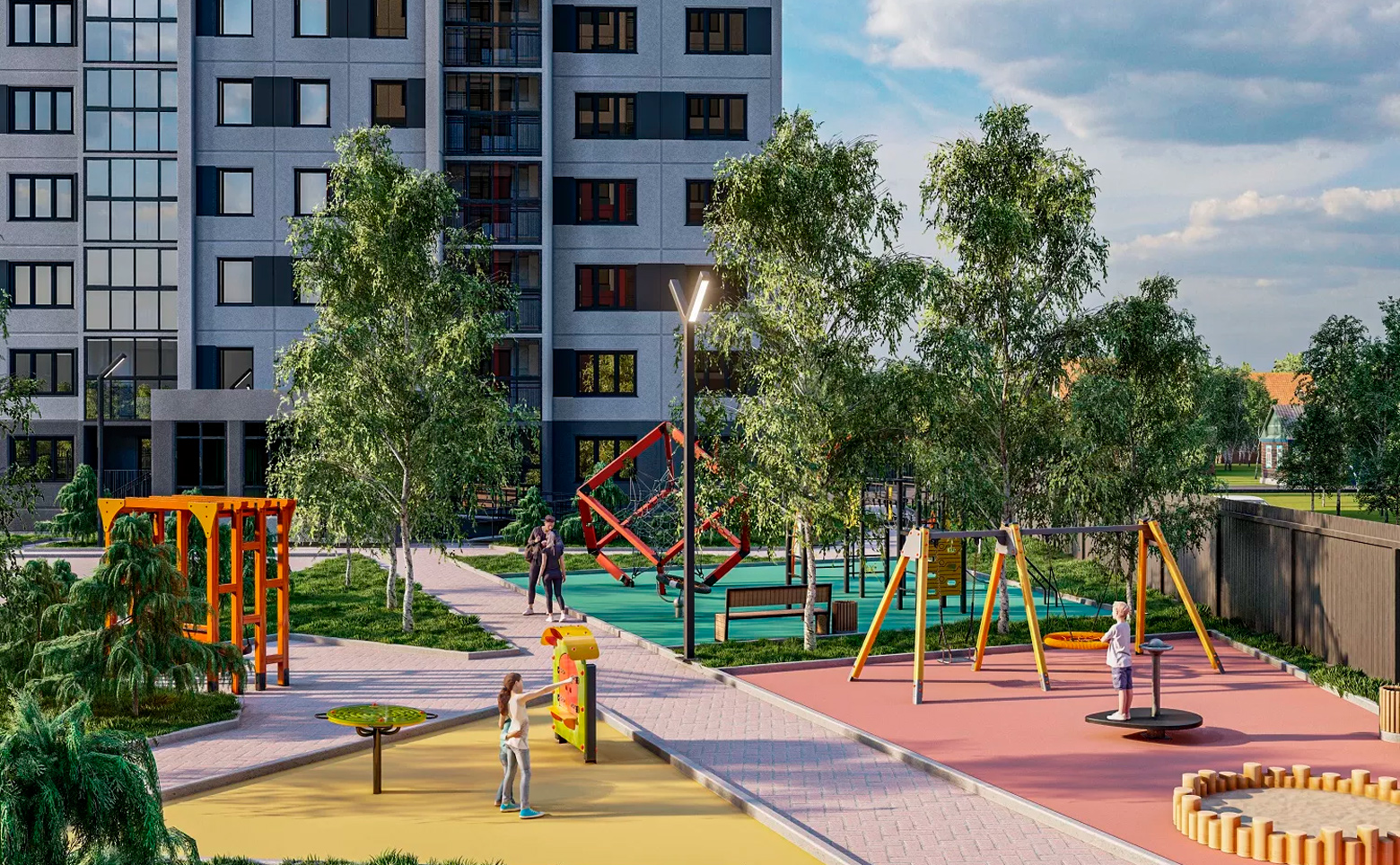Придомовая территория проекта огорожена и благоустроена. Во дворах выполнен ландшафтный дизайн, установлены детские и спортивные площадки, организованы места для отдыха. Территория комплекса спроектирована по концепции двор без машин, для владельцев автомобилей продуманы многоуровневый паркинг и гостевая стоянка.