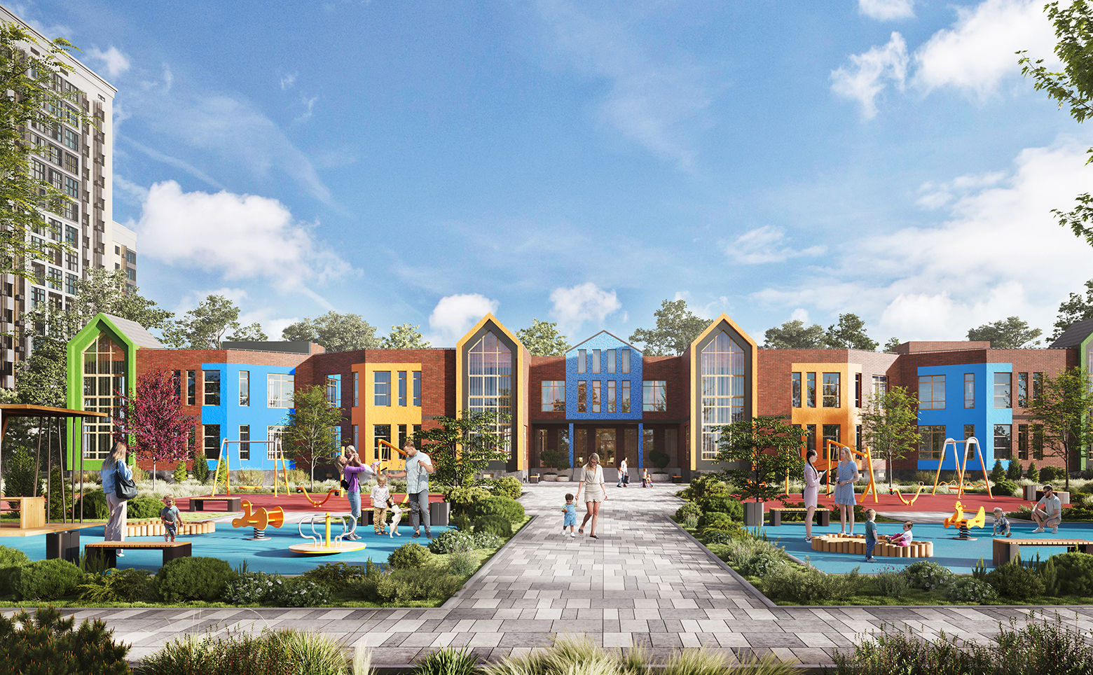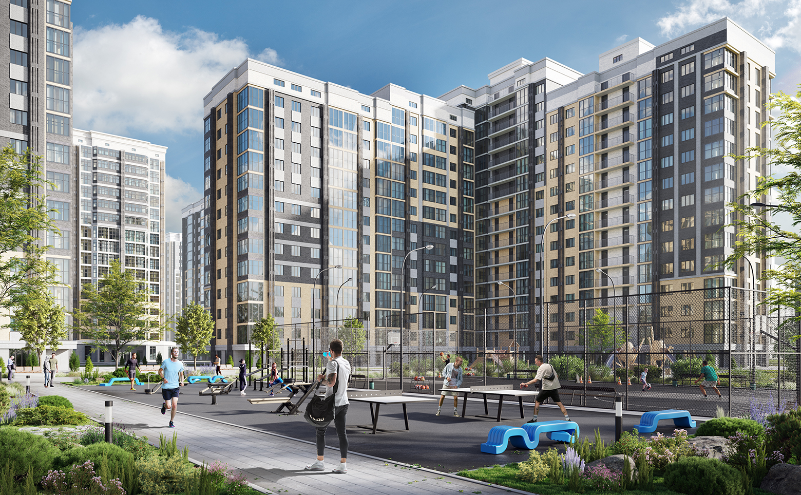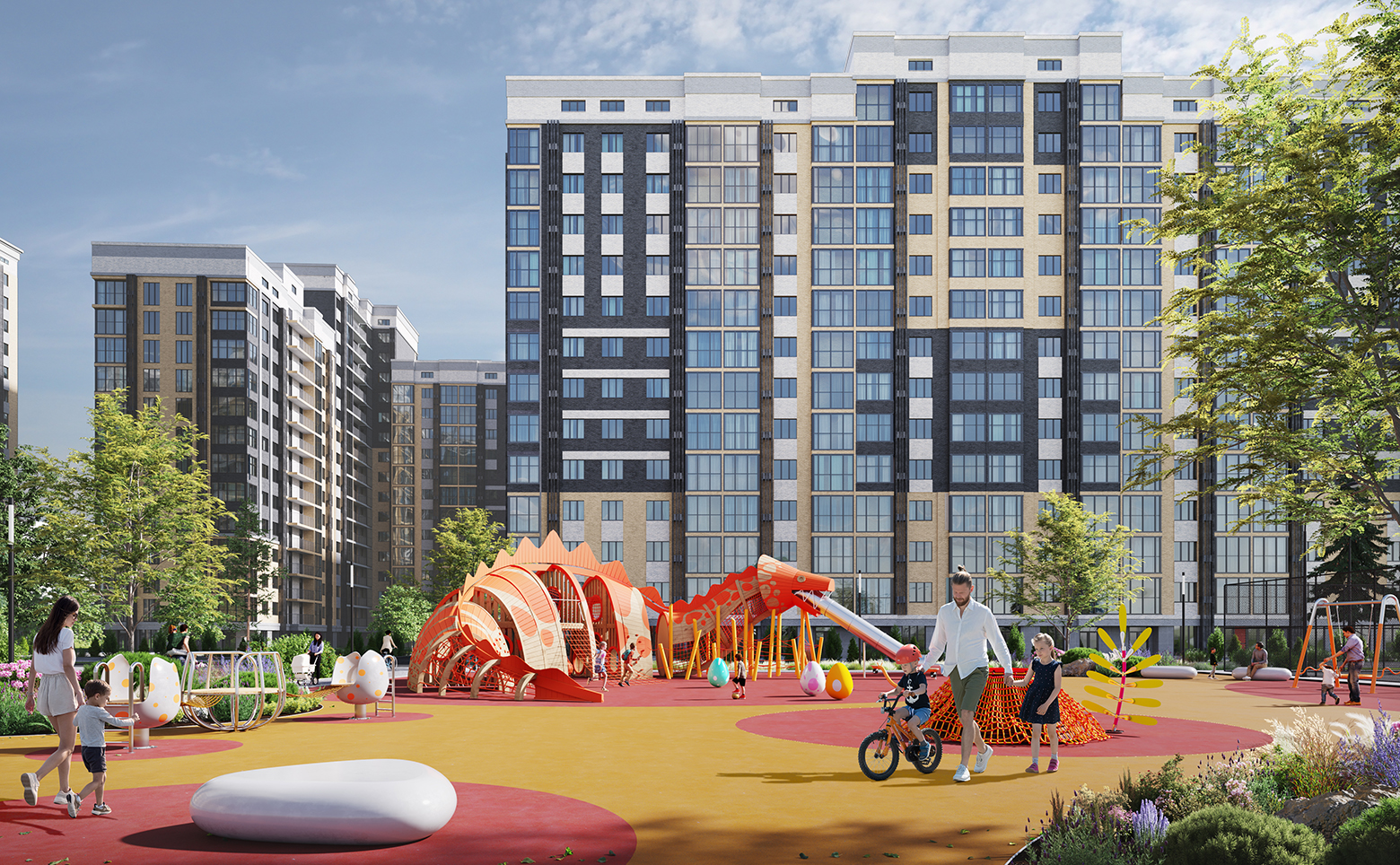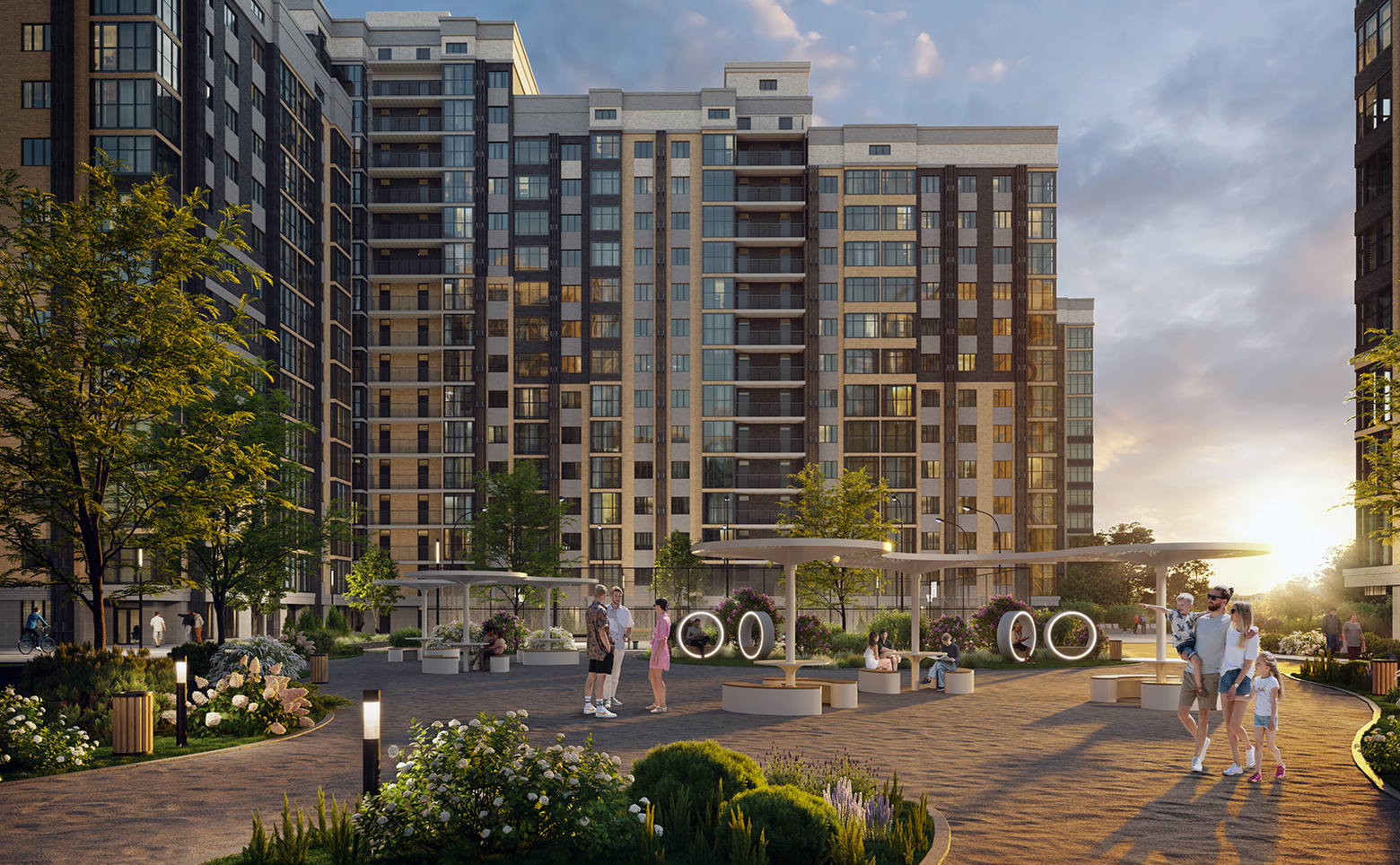 Внутренняя инфраструктура жилого комплекса ориентирована на обеспечение комфортного проживания жильцов. Территория комплекса обустроена детскими и спортивными площадками. По периметру всего комплекса располагается сквер с зонами отдыха, беседками и скамейками. Жилой комплекс обустроен по концепции «Город в городе». Также на закрытой территории расположены детский сад и школа. Для владельцев автомобилей предусмотрены отдельный многоуровневый паркинг и стоянка