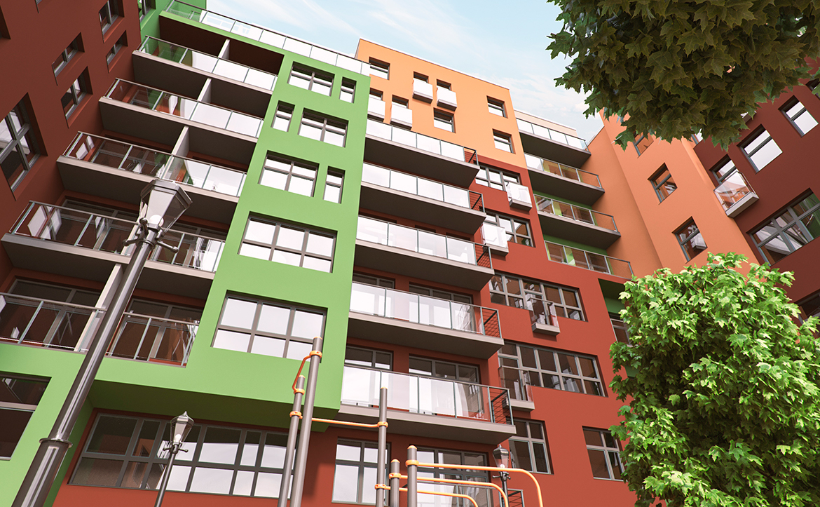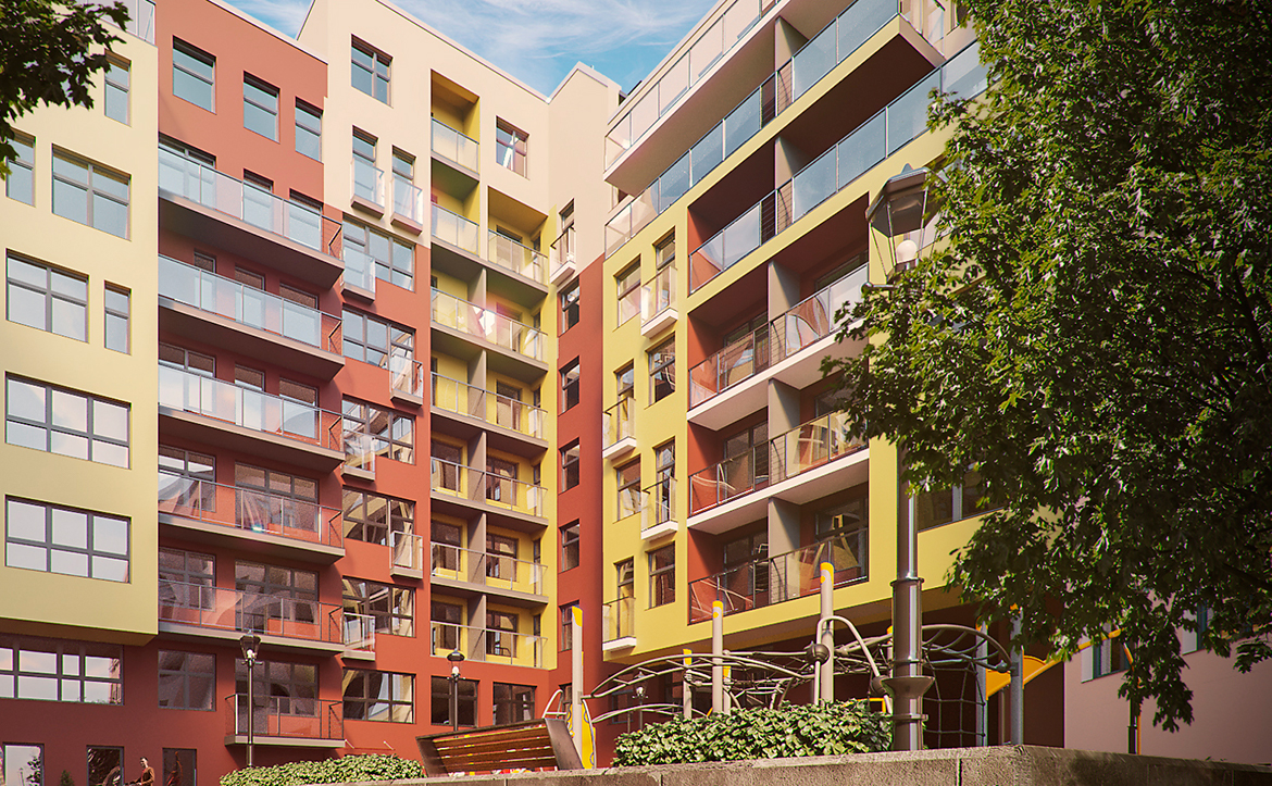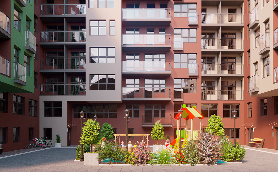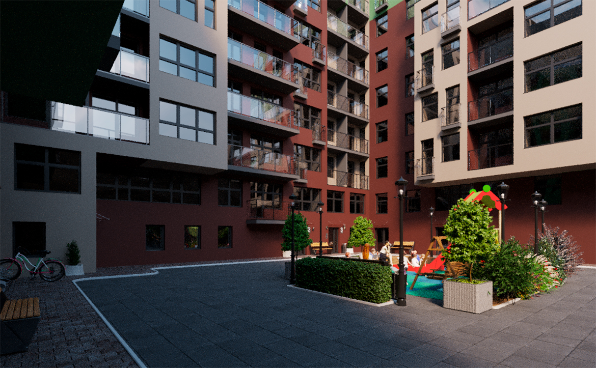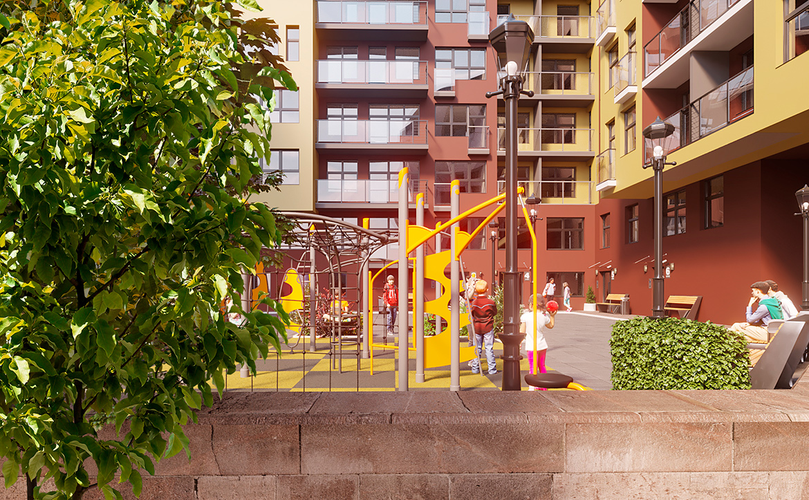 Территория комплекса закрыта от посторонних, внутренние дворы организованы без машин. Оборудованы детские игровые площадки, зоны для отдыха и занятий спортом. Работают видеонаблюдение и круглосуточный пост охраны. Запроектирован двухуровневый подземный паркинг на 163 машиноместа. Кладовые помещения расположены на подземных и первом этажах.