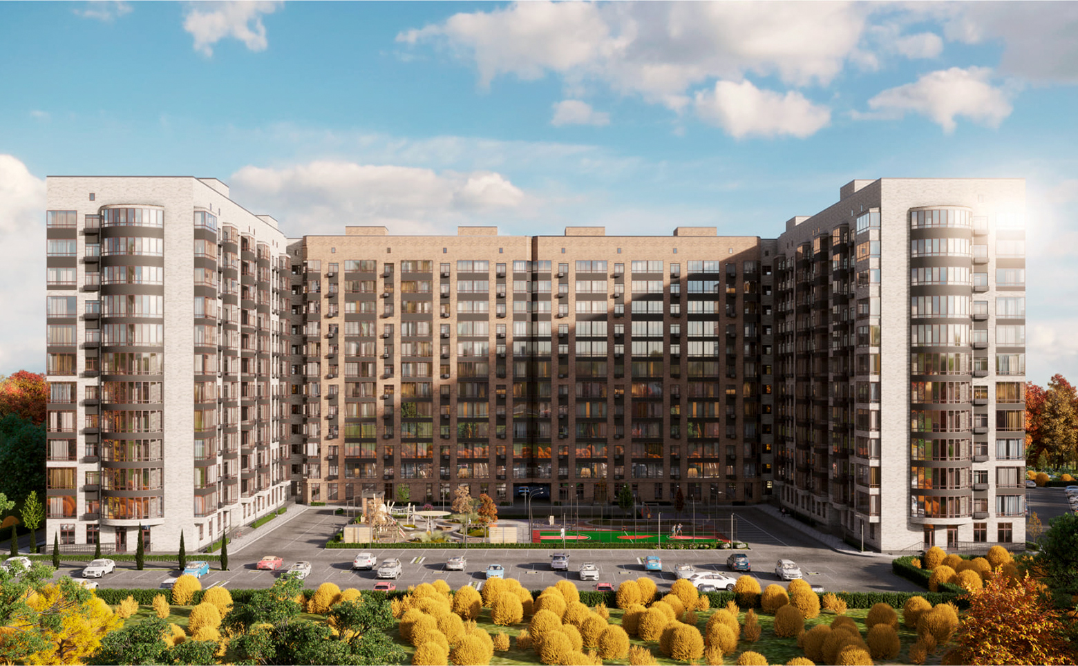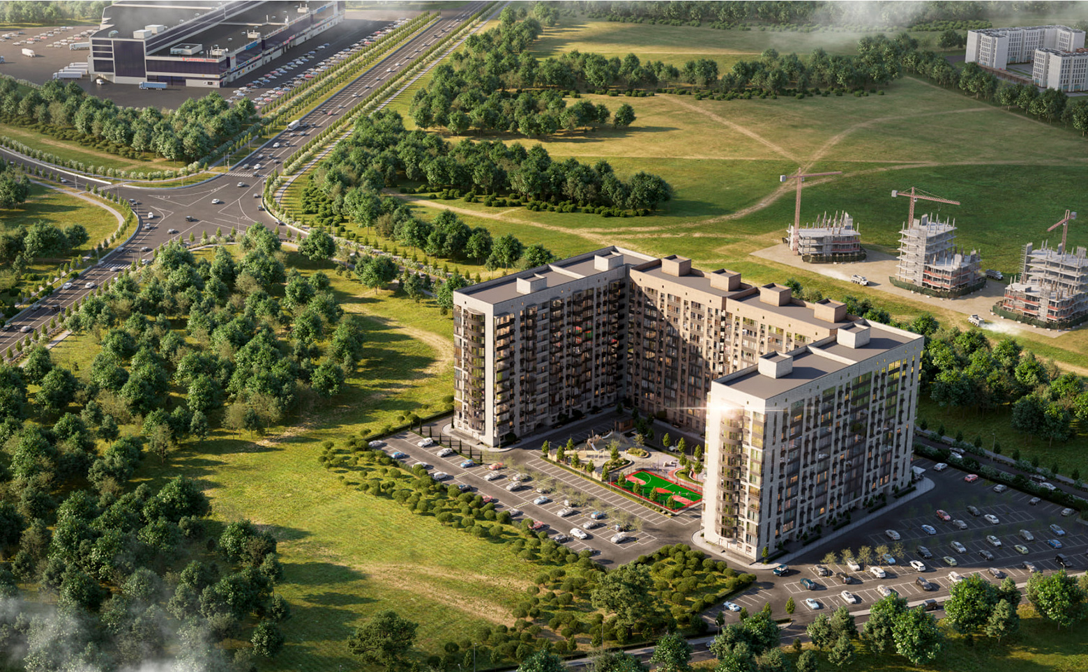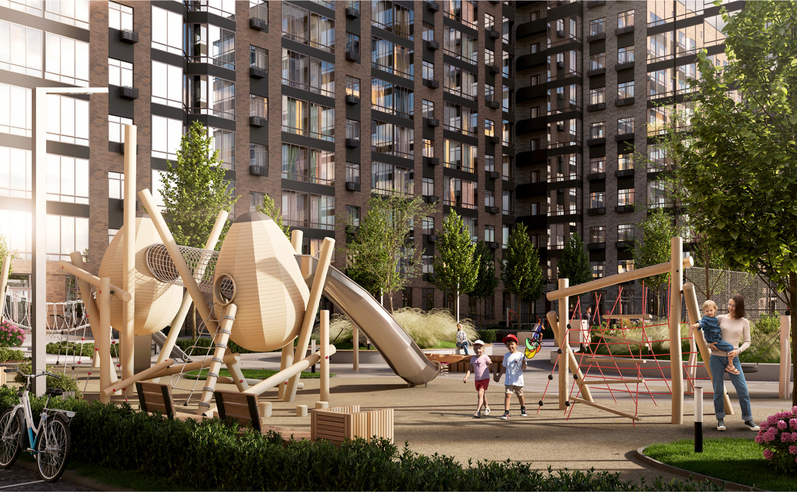 На территории комплекса выполнен ландшафтный дизайн: ухоженные газоны, цветочные клумбы и зоны отдыха. Предусмотрены современные детские площадки с безопасным покрытием и многофункциональные спортивные площадки, оснащенные профессиональными силовыми тренажерами. Рядом с подъездами установлены велопарковки. Первый этаж дома занимают коммерческие помещения. Для владельцев автомобилей предусмотрен подземный паркинг.