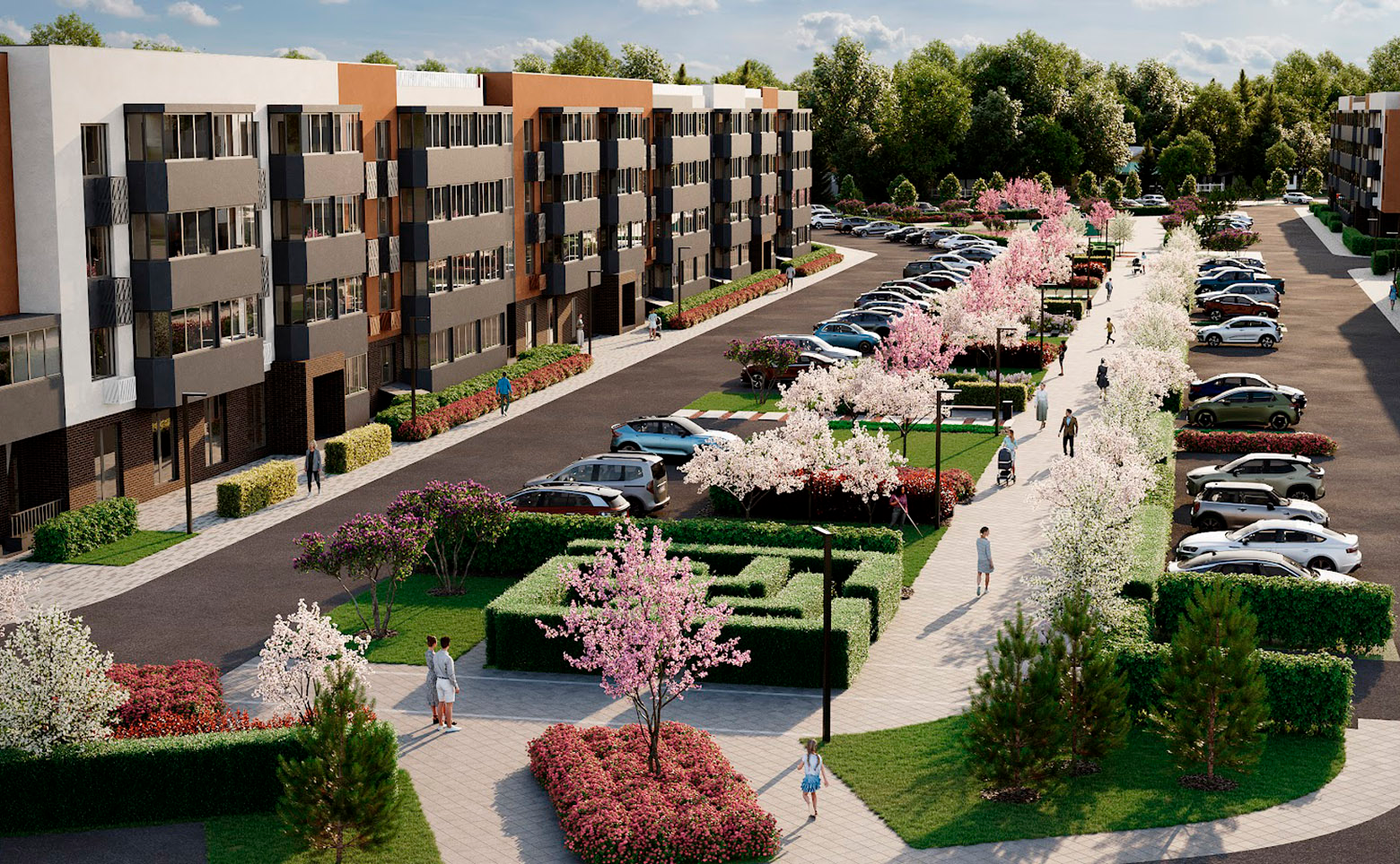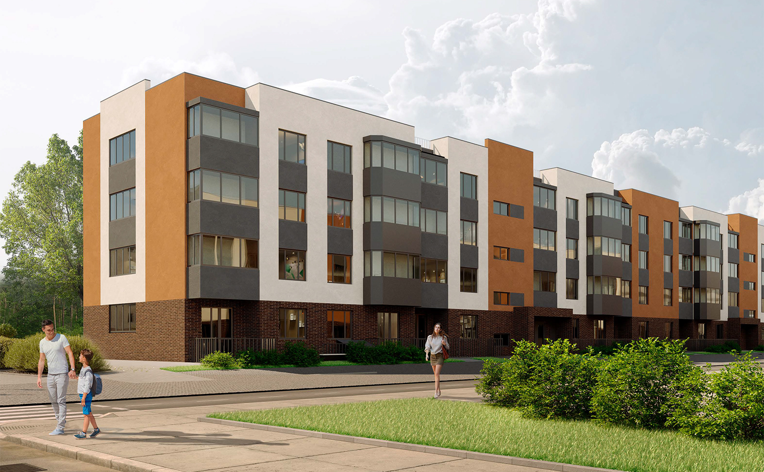 Жилой комплекс включает в себя 10 четырехэтажных корпусов. Дома возведены по долговечной кирпично-монолитной технологии, фасады украшены штукатуркой терракотовых и молочных оттенков. В ЖК сделана дизайнерская отделка входных групп, установлены современные высокоскоростные бесшумные лифты. На первых этажах расположены колясочные и велосипедные.