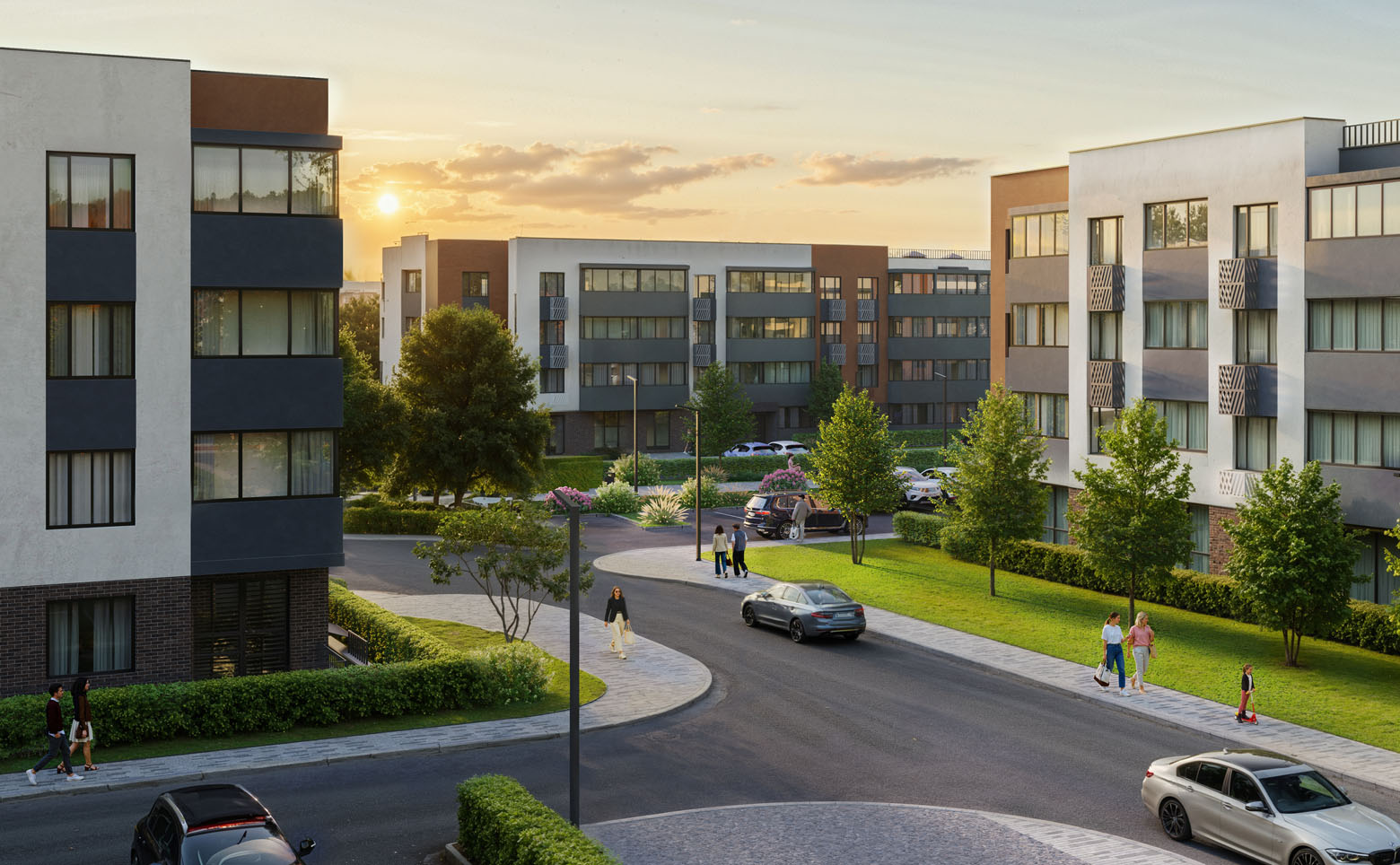На закрытой территории комплекса предусмотрено видеонаблюдение. Во дворах расположены детские площадки для разных возрастов, спортивные площадки и зоны отдыха. Вдоль всего комплекса проложена аллея с масштабным озеленением. Внутри комплекса предусмотрены школа, спортивный комплекс и эко-маркет. На первых этажах расположены коммерческие помещения. Для владельцев автомобилей предусмотрена стоянка.