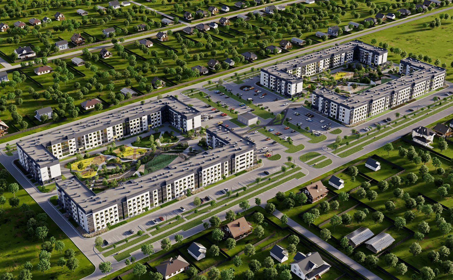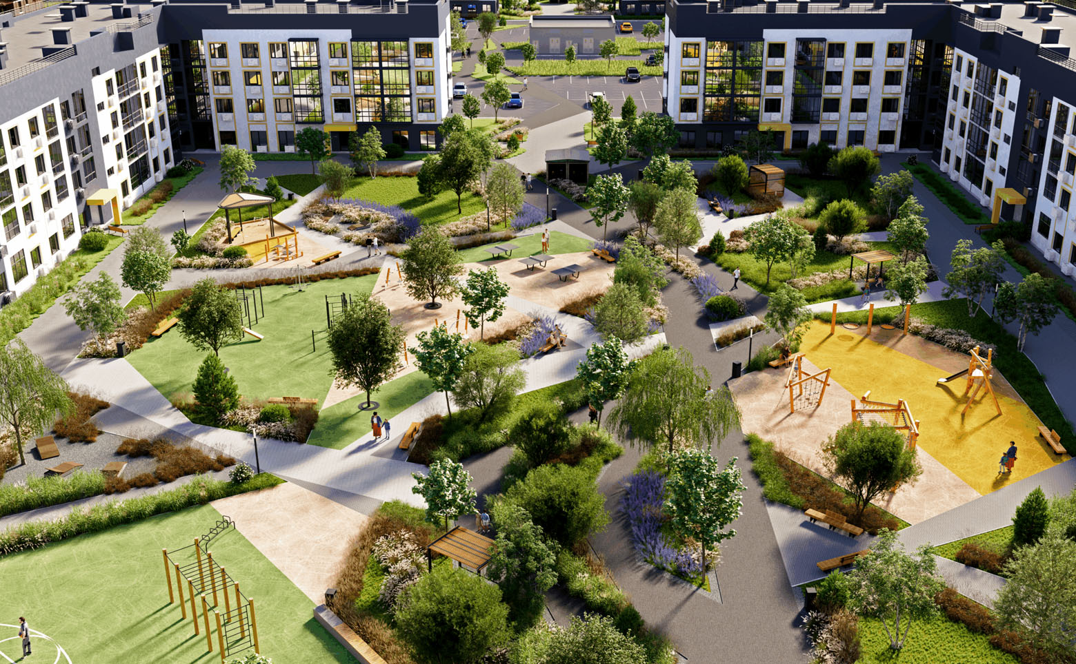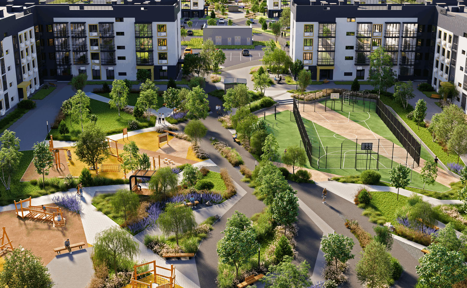 Внутренняя инфраструктура жилого комплекса ориентирована на обеспечение комфортного проживания жильцов. Территория комплекса обустроена детскими и спортивными площадками и зонами отдыха. Для владельцев автомобилей предусмотрена придомовая стоянка.
