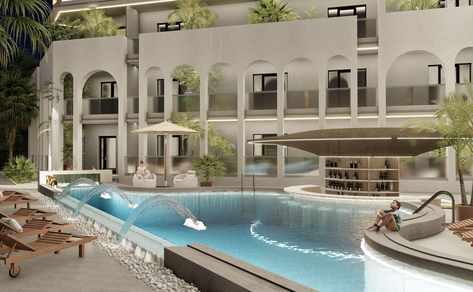 На территории апарт-отеля обустроен всесезонный бассейн с подогревом и водным баром. Из можжевеловой сауны, хаммама, детской комнаты и зоны кардио открываются панорамные виды на бассейн. Жителям доступны террасы с барами на 3 уровне и открытая терраса на крыше, а также ресторан на 1 этаже. Для автомобилей предусмотрены стоянка и подземный паркинг. Здание обслуживается управляющей компанией, за помощью с повседневными задачами можно обратиться в консьерж-сервис.