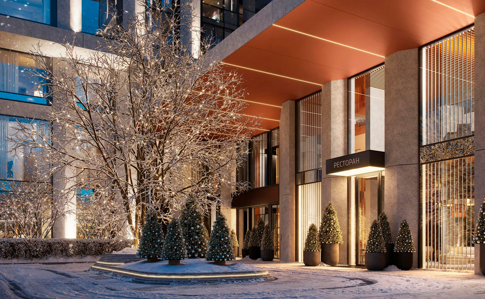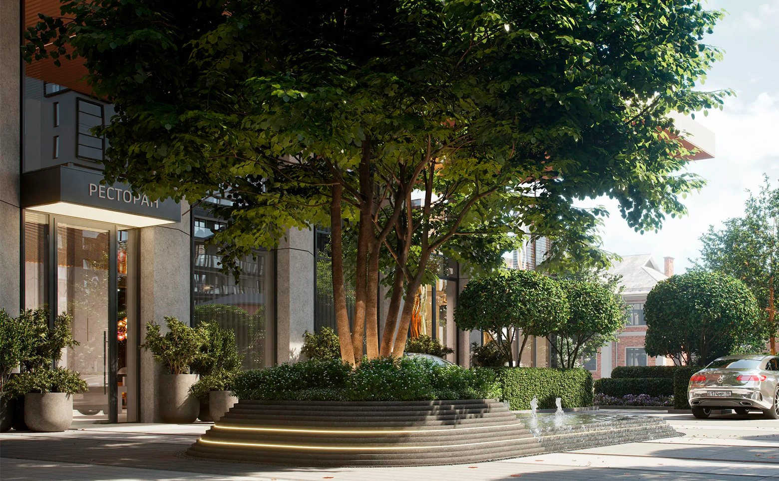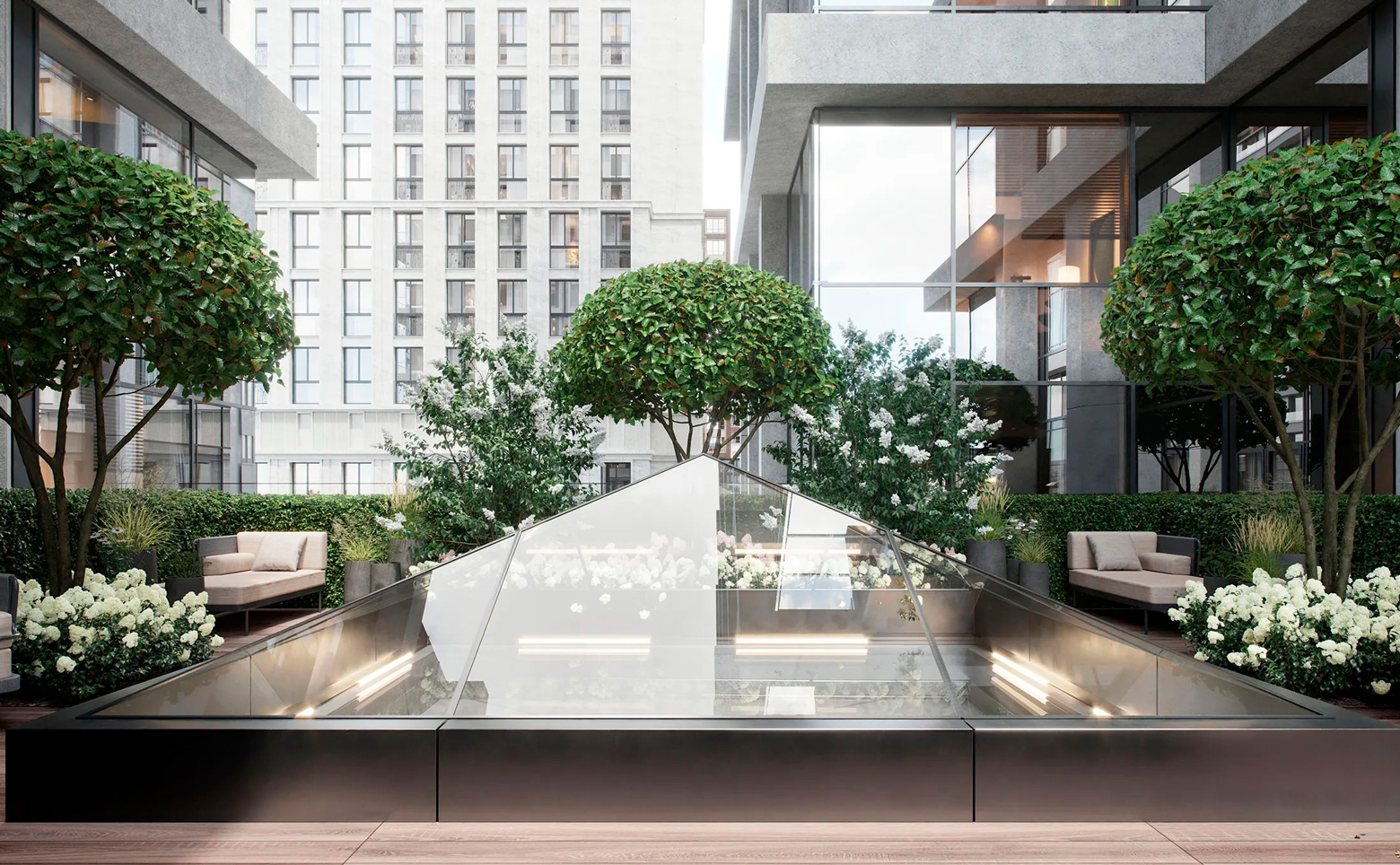 На первых 4 этажах комплекса размещены зоны для отдыха, спорта и общения. На втором этаже находятся студия пилатеса и библиотека. Третий этаж объединяет клубную гостиную с камином, кинозал, фитнес-рум для персональных тренировок и переговорные комнаты с кофе-пойнтом, которые можно арендовать через приложение. На четвертом этаже расположены детская игровая, комната для праздников с кухней и фуршетными столами, а также двор-терраса, где можно отдыхать и проводить встречи. Для владельцев авто предусмотрен подземный паркинг.