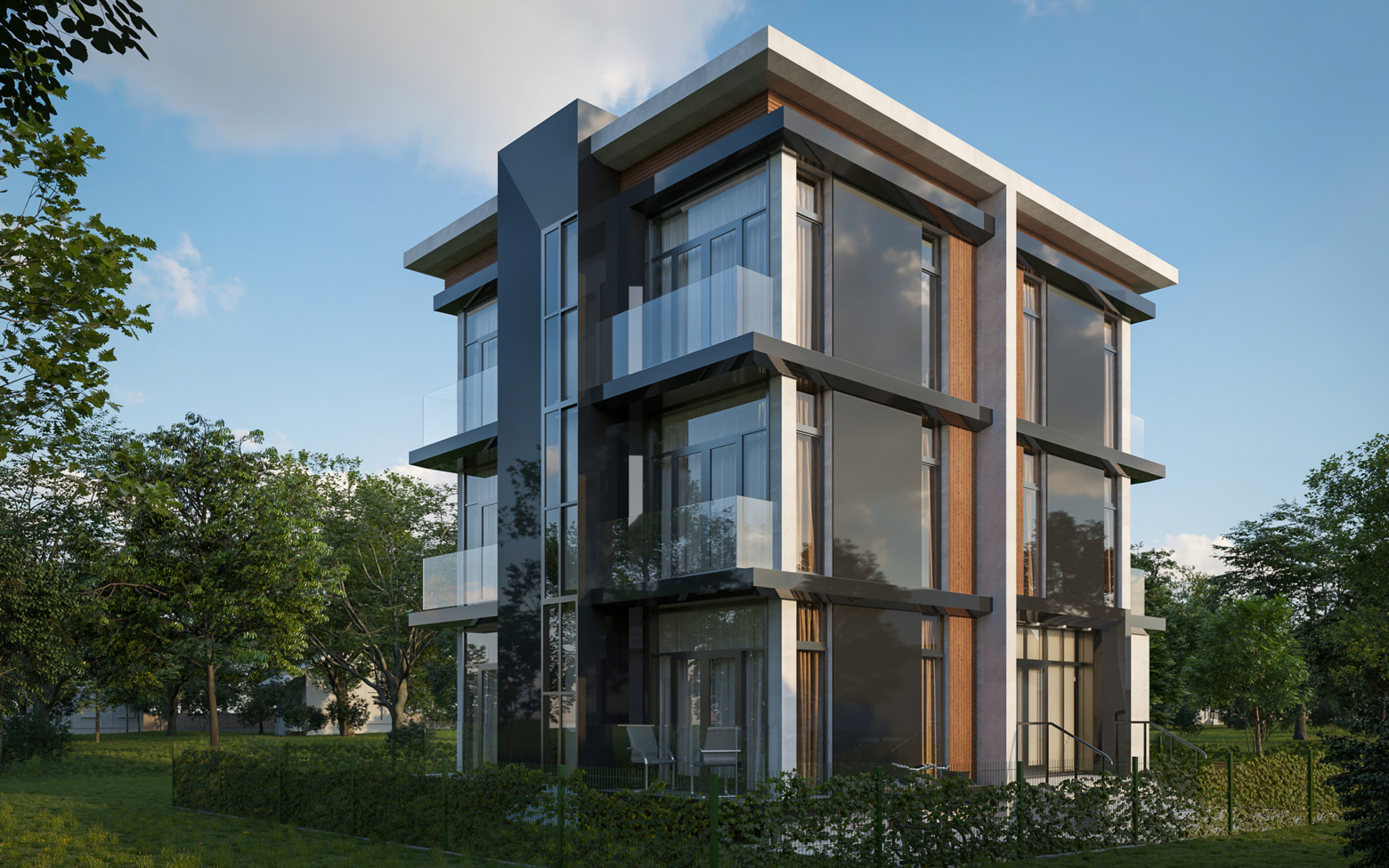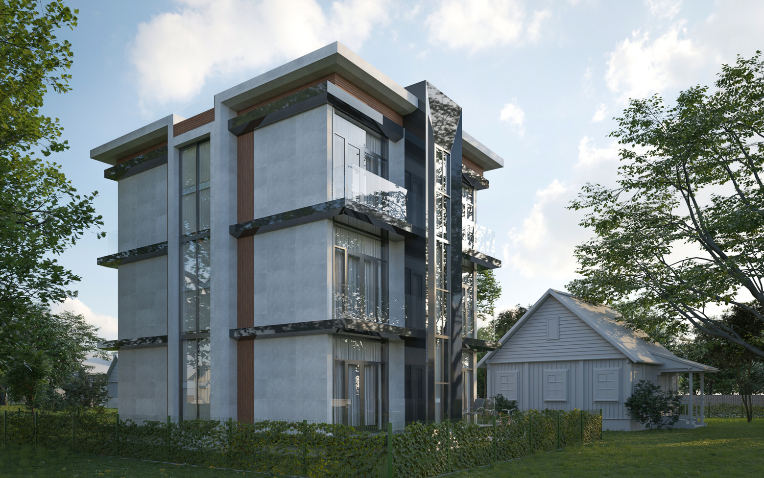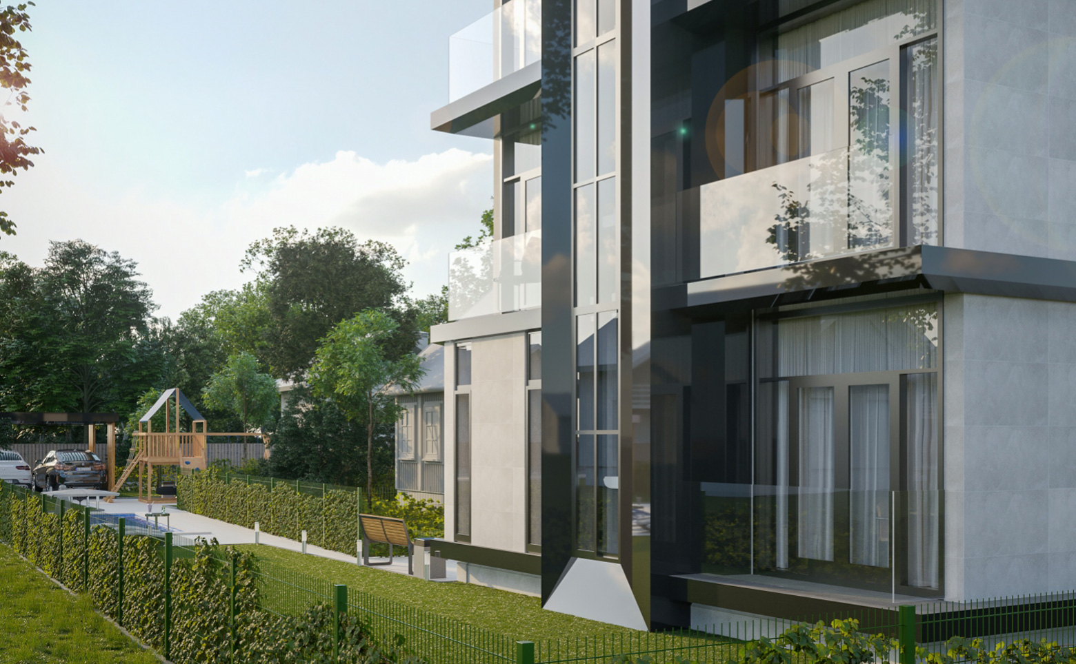 В проекте предлагается к покупке участок площадью 6 соток с 2 зданиями высотой 2 и 3 этажа. Вид разрешенного использования земли — ИЖС с возможностью оформить постоянную регистрацию. Здания выполнены по монолитной технологии с керамзитоблочным заполнением стен. Фасады оформлены декоративной штукатуркой с элементами керамогранитной плитки и натурального дерева.