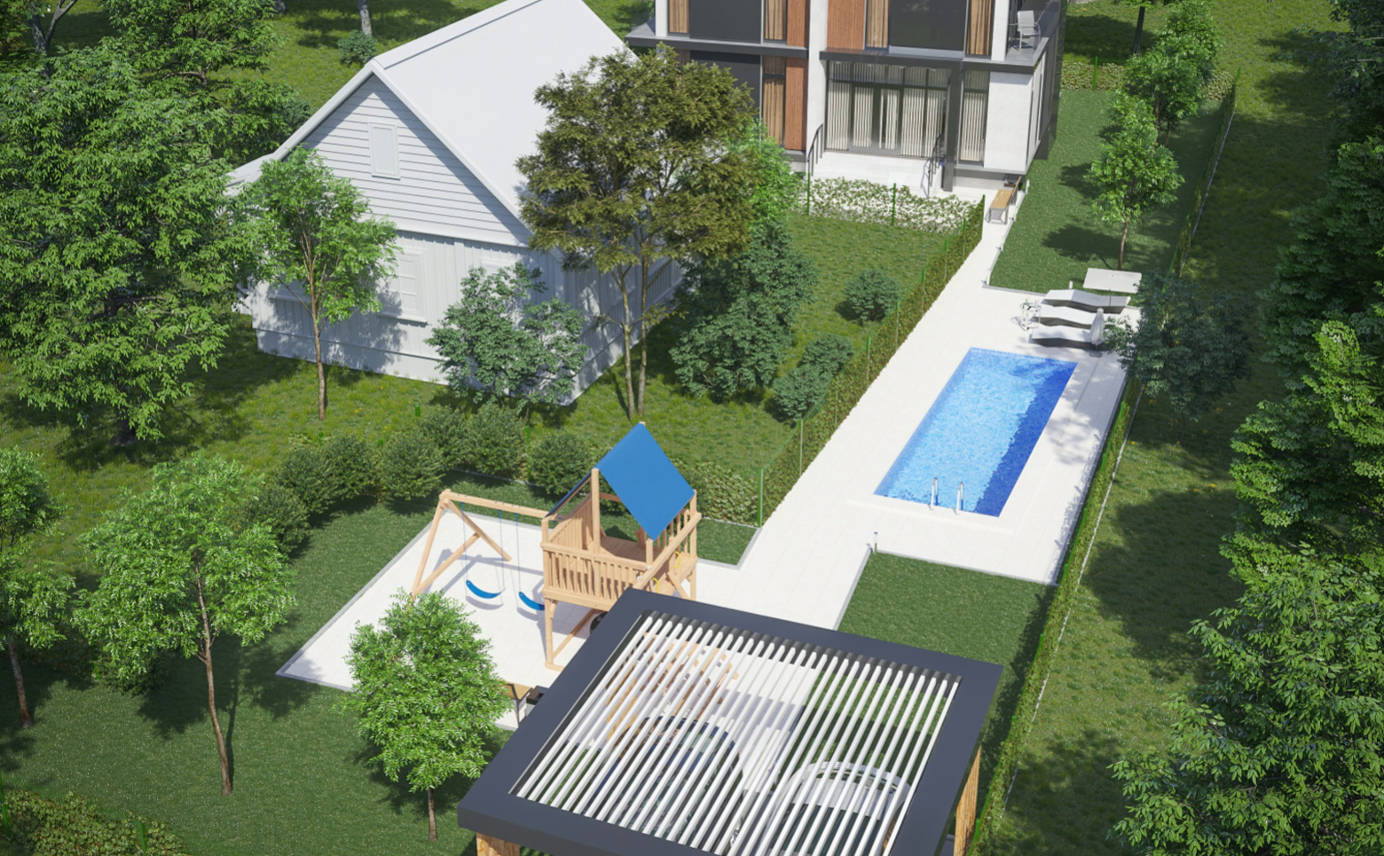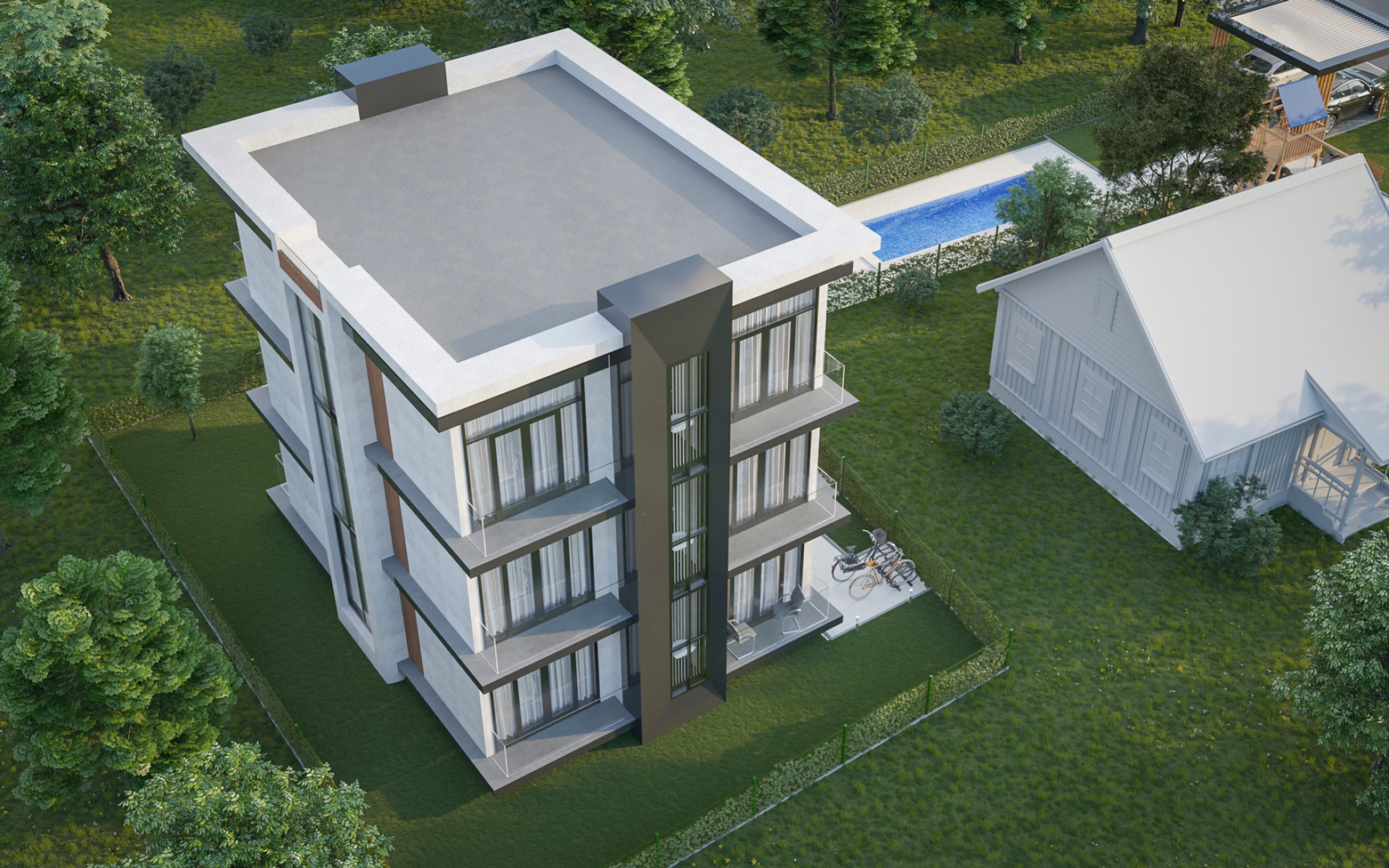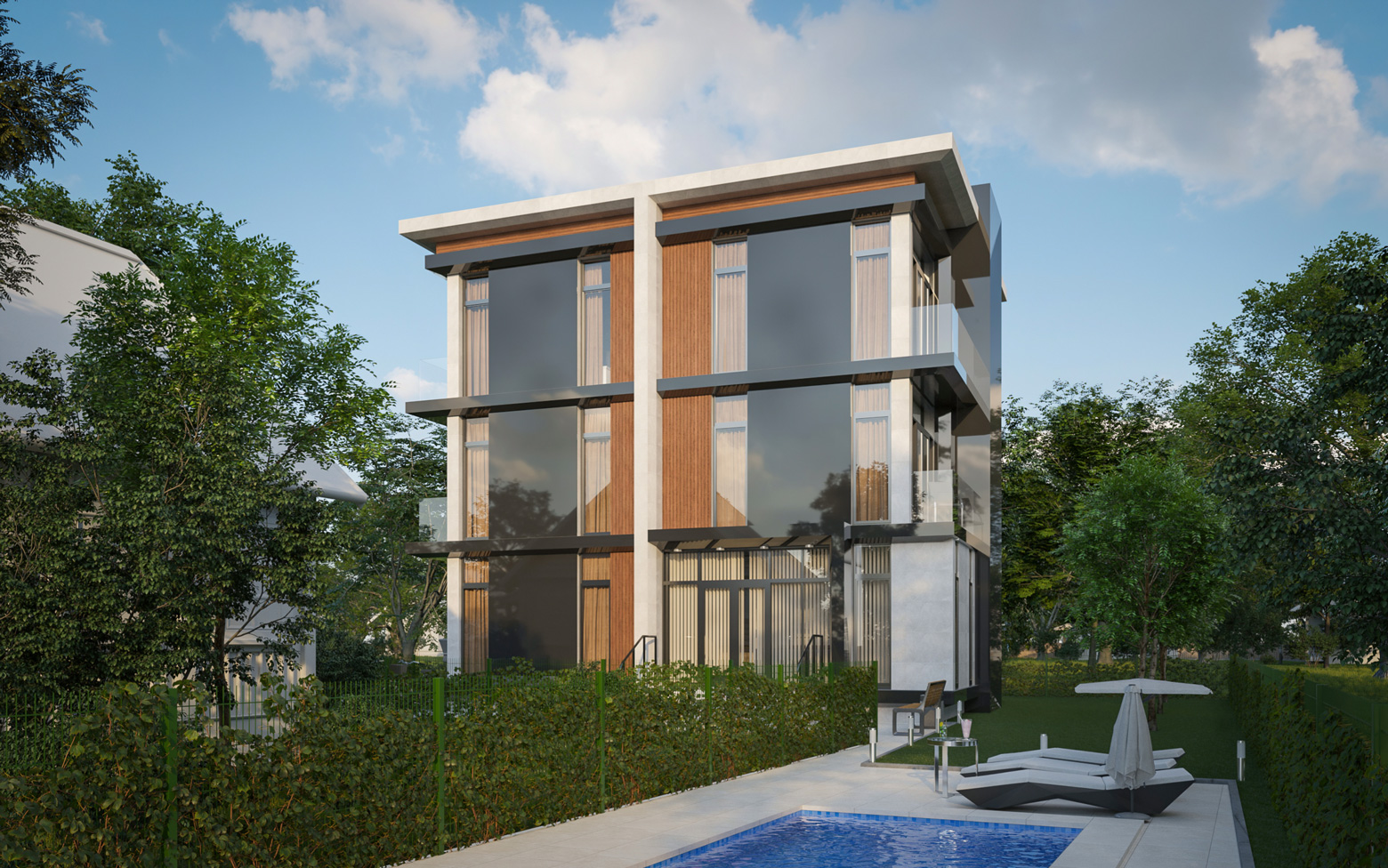В проекте предлагается к покупке участок площадью 6 соток с 2 зданиями высотой 2 и 3 этажа. Вид разрешенного использования земли — ИЖС с возможностью оформить постоянную регистрацию. Здания выполнены по монолитной технологии с керамзитоблочным заполнением стен. Фасады оформлены декоративной штукатуркой с элементами керамогранитной плитки и натурального дерева.