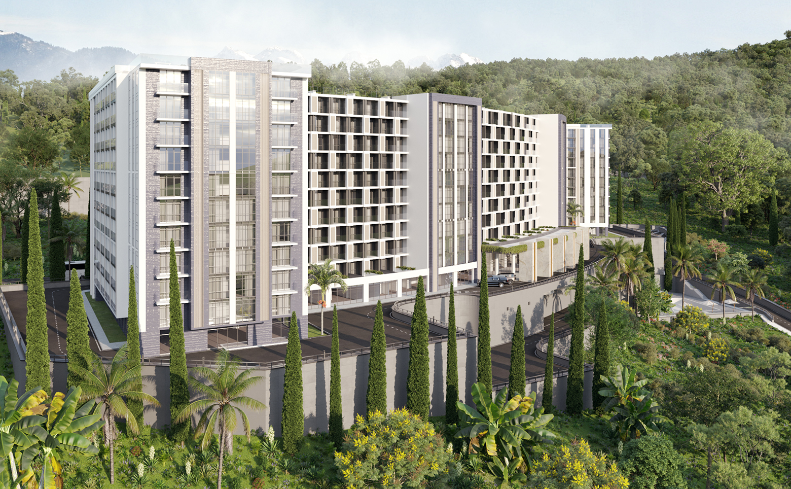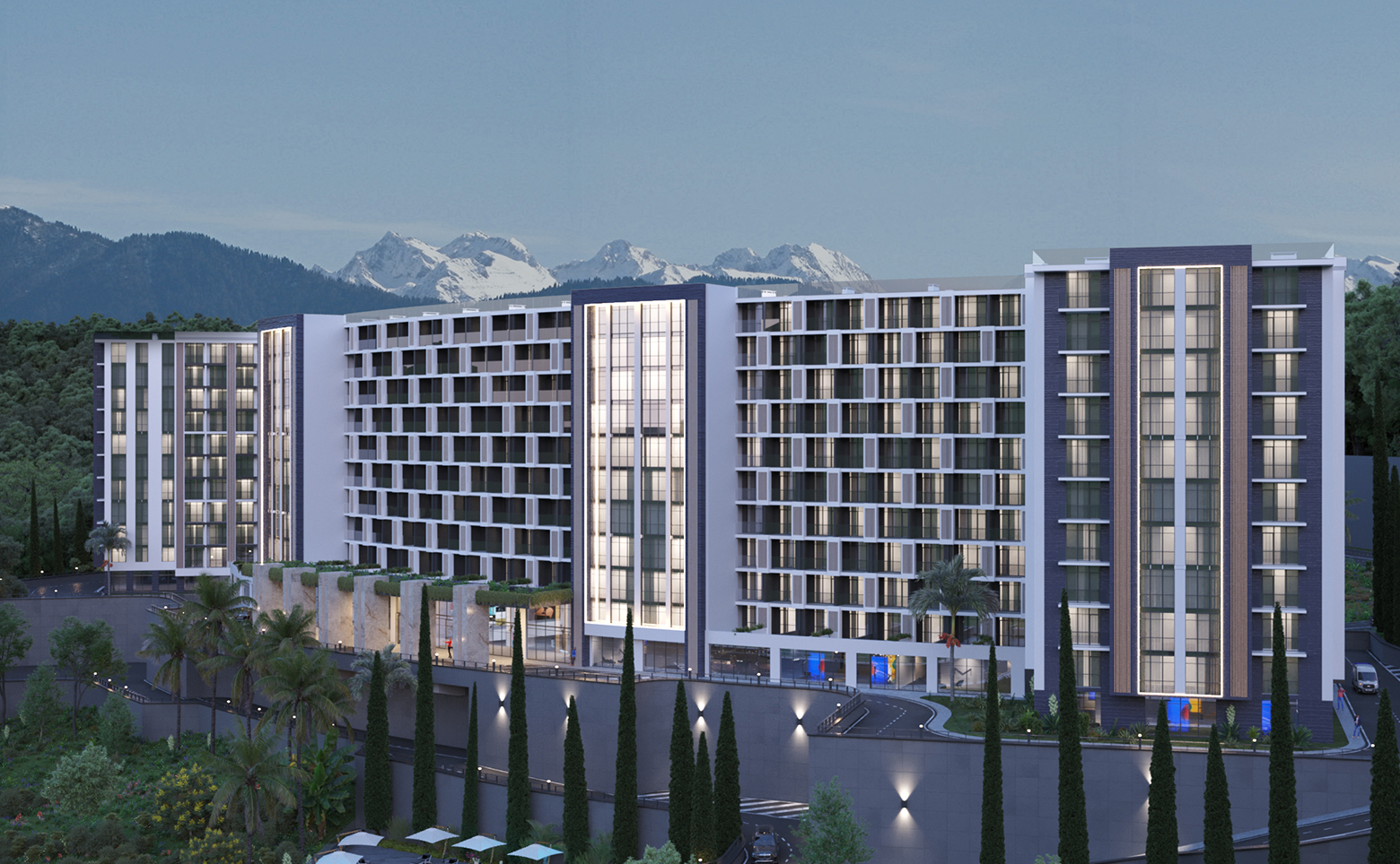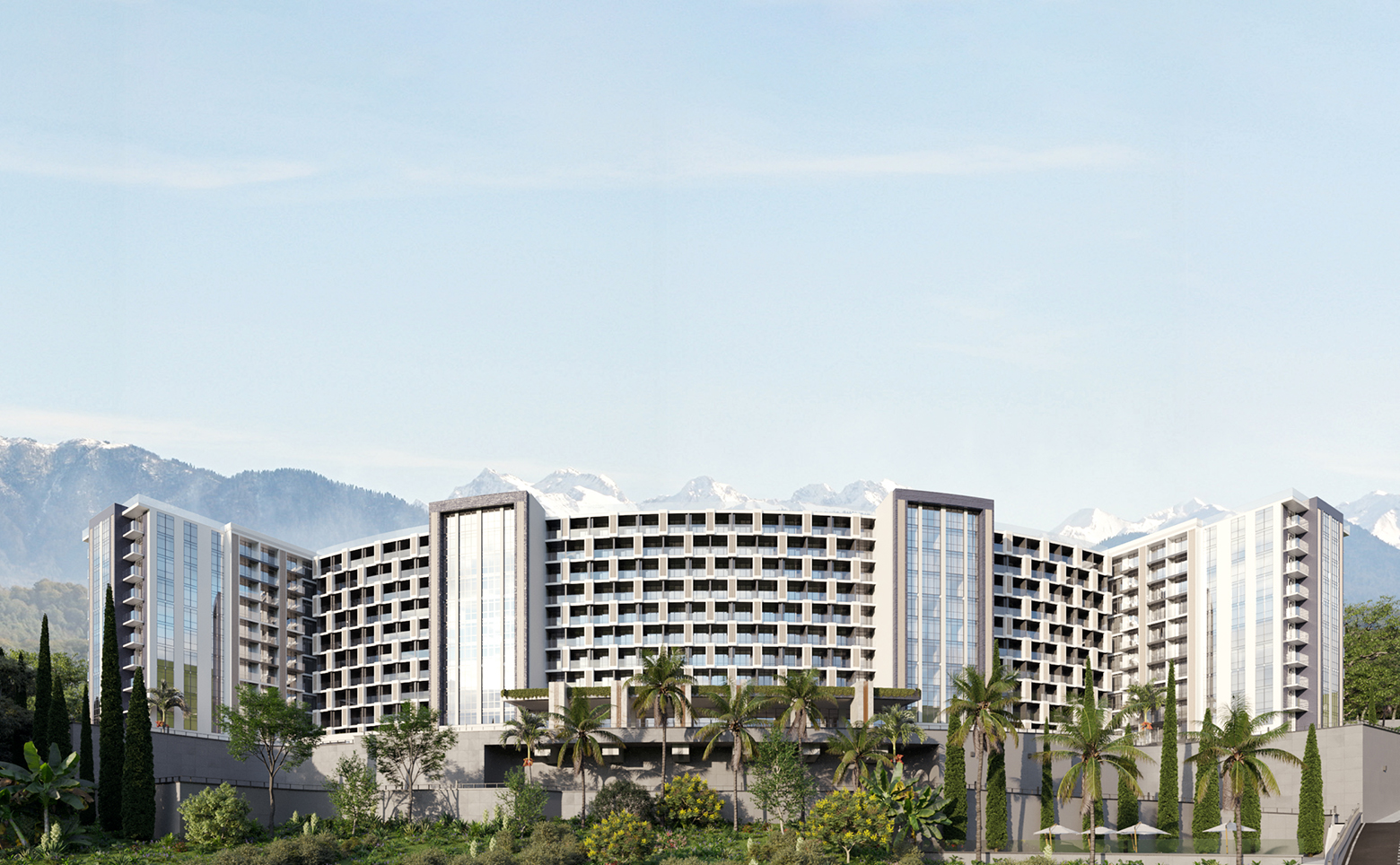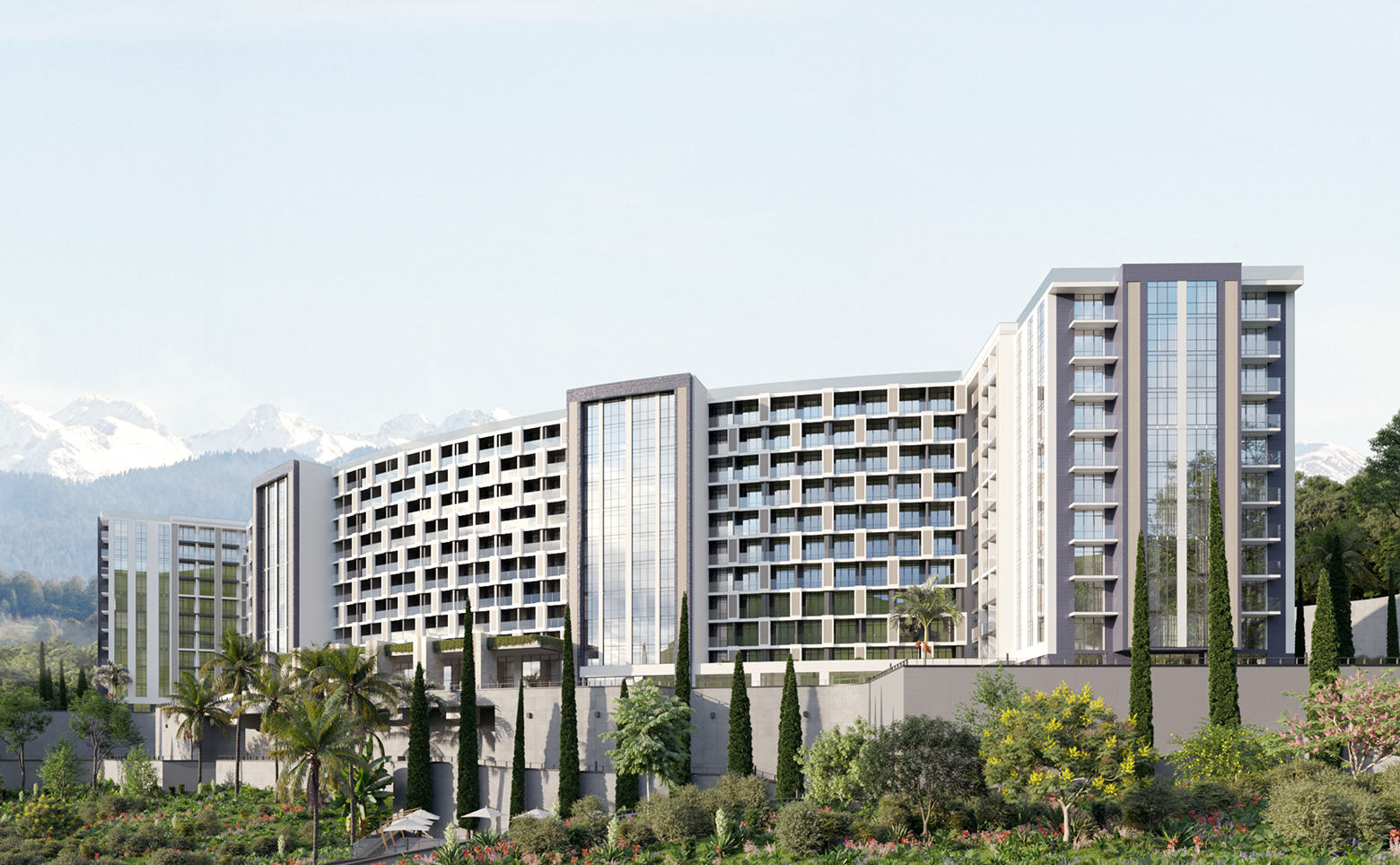 В проекте представлены номера площадью от 24.7 до 66.7 кв.м. Сдаются они с панорамными окнами, высотой потолков 3 метра и мебелью. Все апартаменты имеют вид на море или горы.
