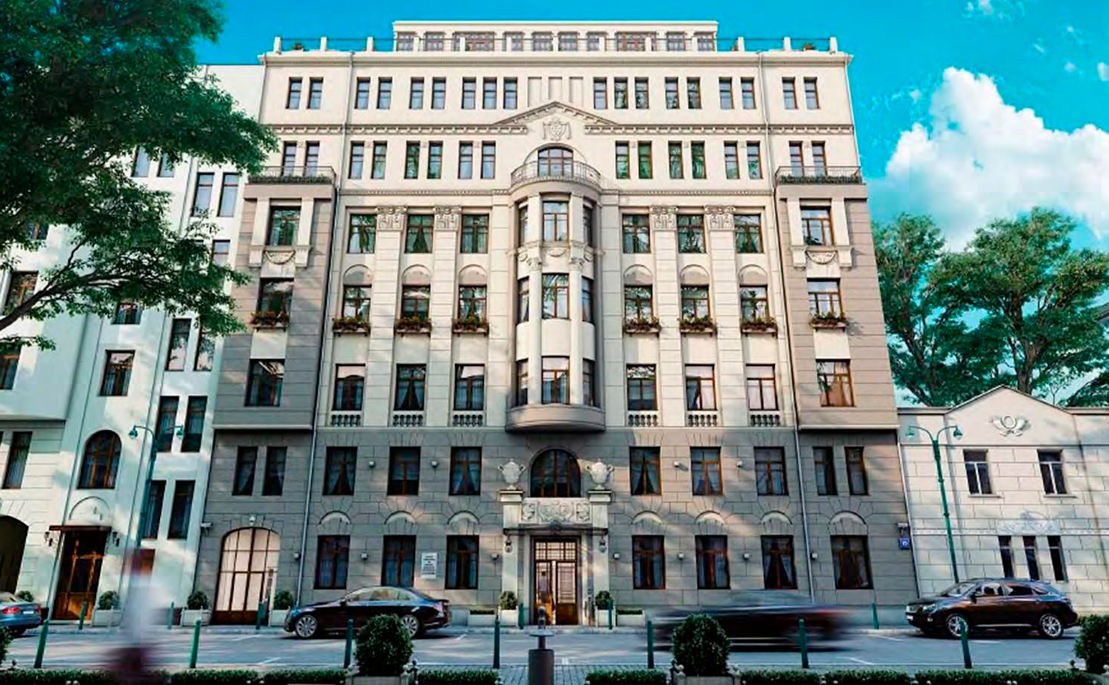 Клубный дом класса делюкс представляет собой отреставрированный доходный дом начала XX века в стиле неоклассицизма. Здание высотой 8 этажей построено из кирпича и включено в список памятников архитектуры. Фасад оформлен декоративным камнем, лепниной и скульптурами. Интерьеры лобби отделаны мрамором, гранитом и натуральным деревом, оборудован дизайнерский лифт от бренда ThyssenKrupp с коваными элементами.