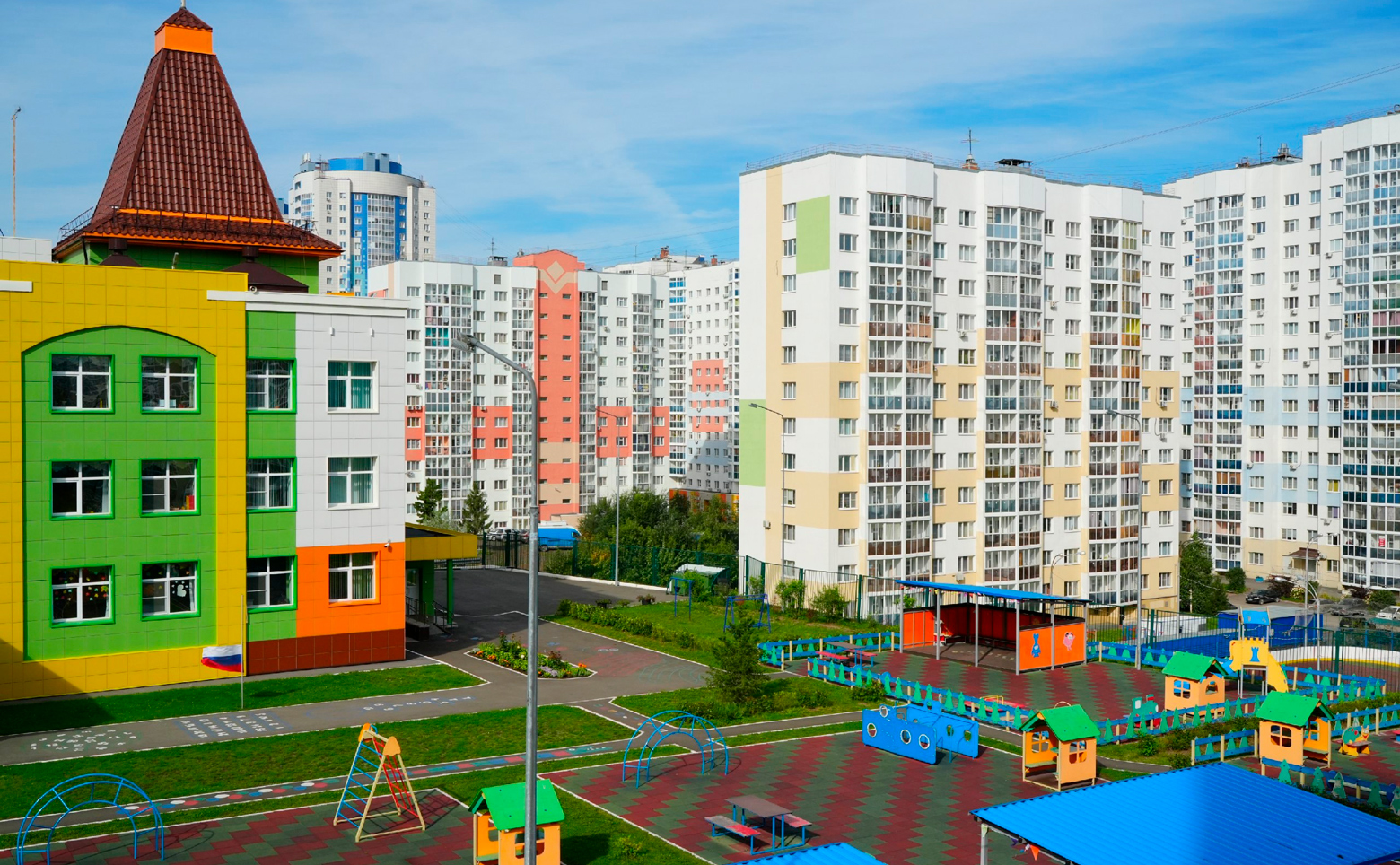 На территории комплекса предусмотрены благоустроенные дворы с детскими и спортивными площадками, зелеными зонами и пешеходными аллеями. Входные группы оформлены по индивидуальному дизайн-проекту. Для жителей предусмотрены помещения для хранения велосипедов и колясок. Ведется круглосуточное видеонаблюдение, обеспечена безбарьерная среда.