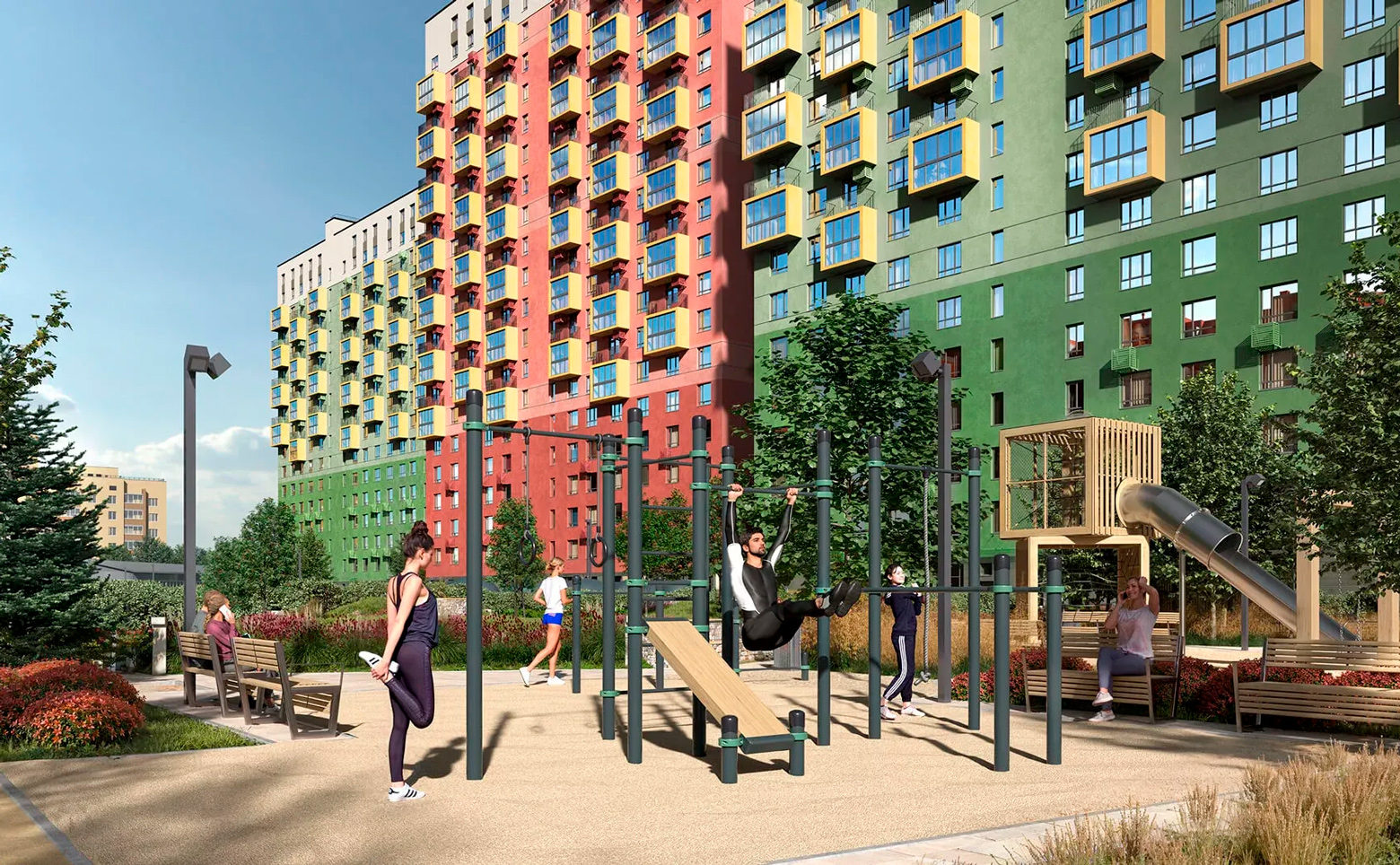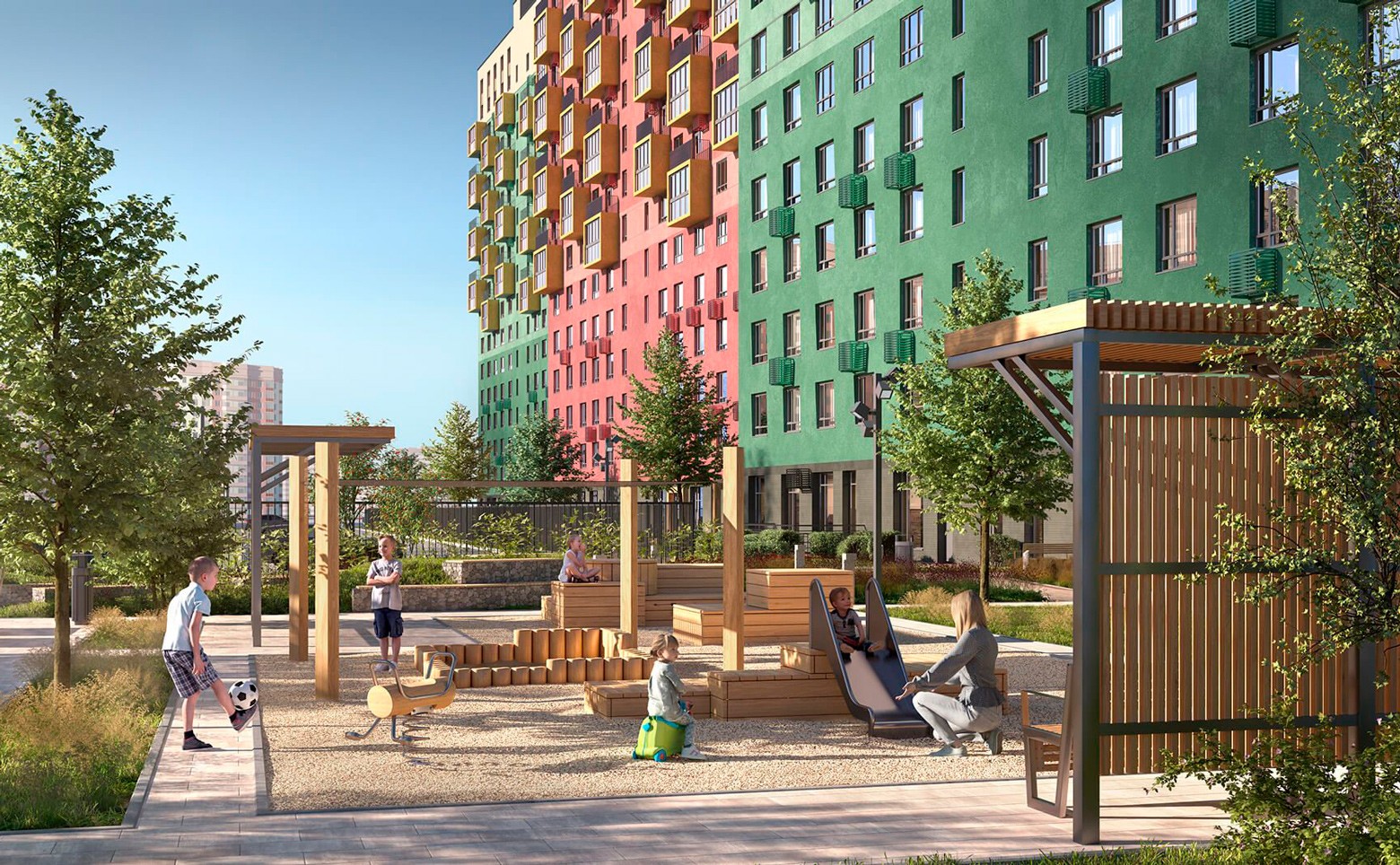 Территория комплекса закрыта для посторонних и свободна от машин. Войти можно только с помощью электронного ключа или через видеодомофон. Ландшафтный дизайн имеет многоуровневое озеленение и геопластику. Пространство внутренней территории разделено на функциональные зоны: детские игровые и спортивные площадки, зоны отдыха с перголами. Ведется круглосуточное видеонаблюдение. Для владельцев автомобилей предусмотрена стоянка.
