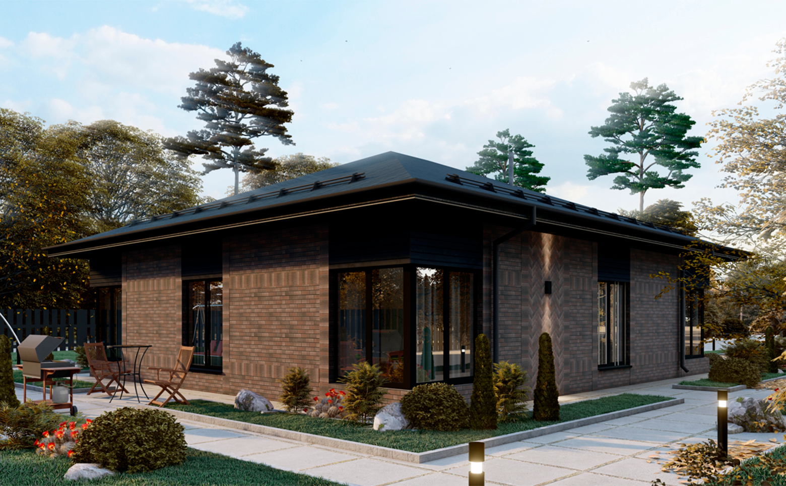 В проекте предложены типовые планировки домов площадью от 103 до 136 кв. м. Сдаются они без отделки, с панорамными окнами и высотой потолков 3 метра. Есть возможность дозаказать подчистовую отделку. Для владельцев автомобилей предусмотрена придомовая стоянка.