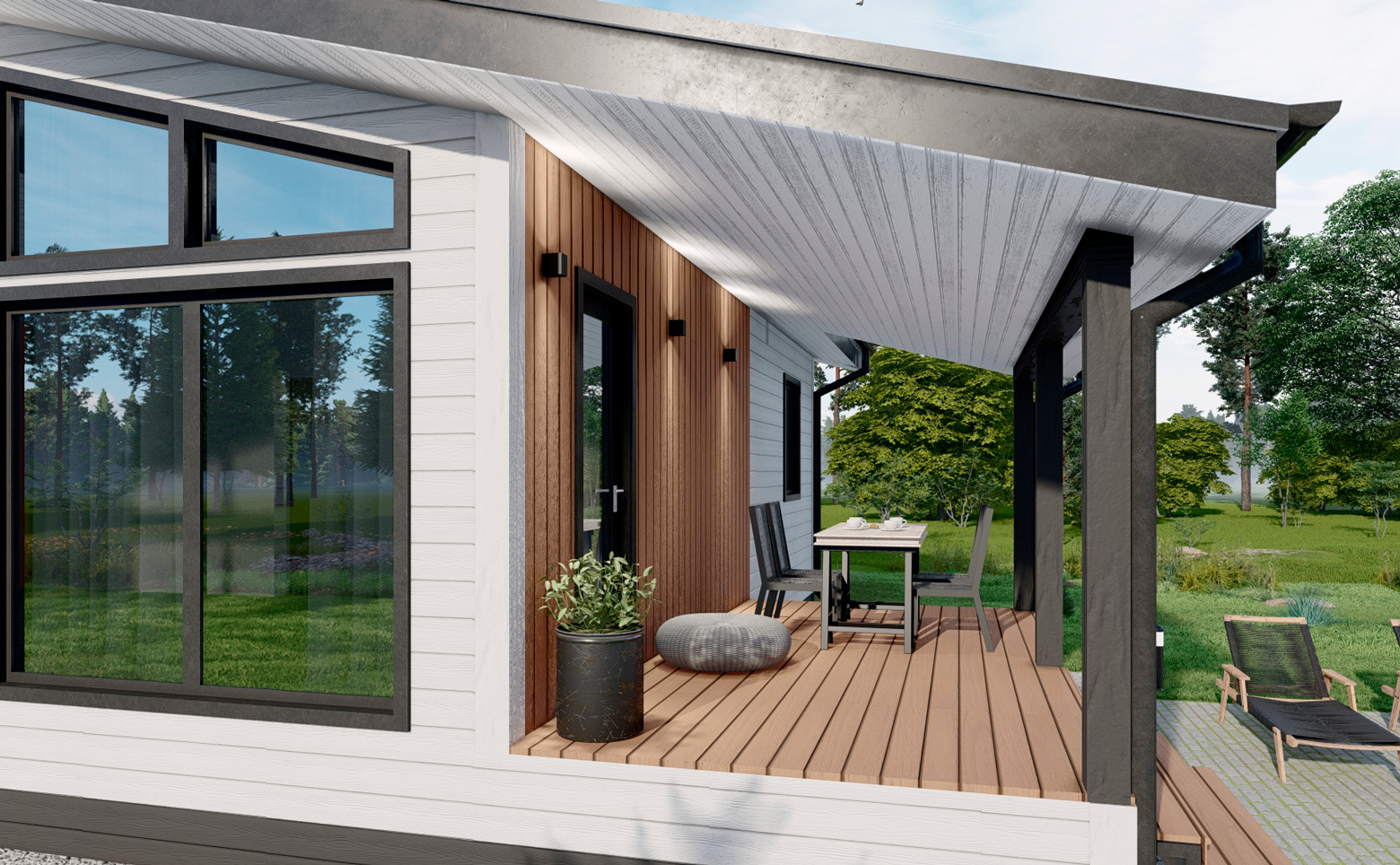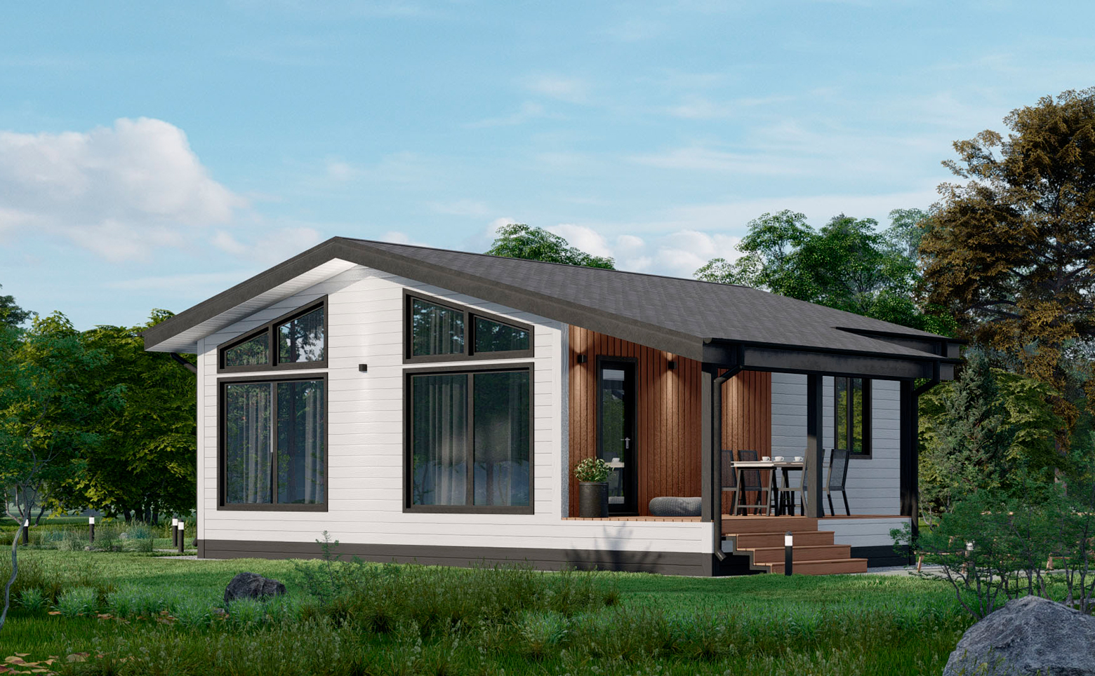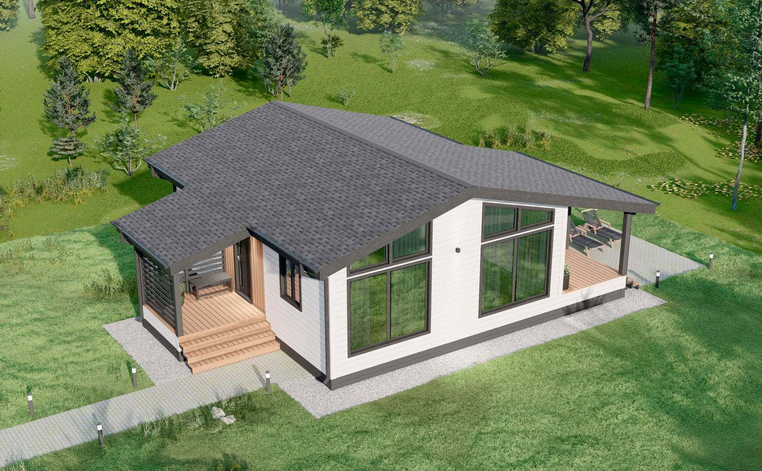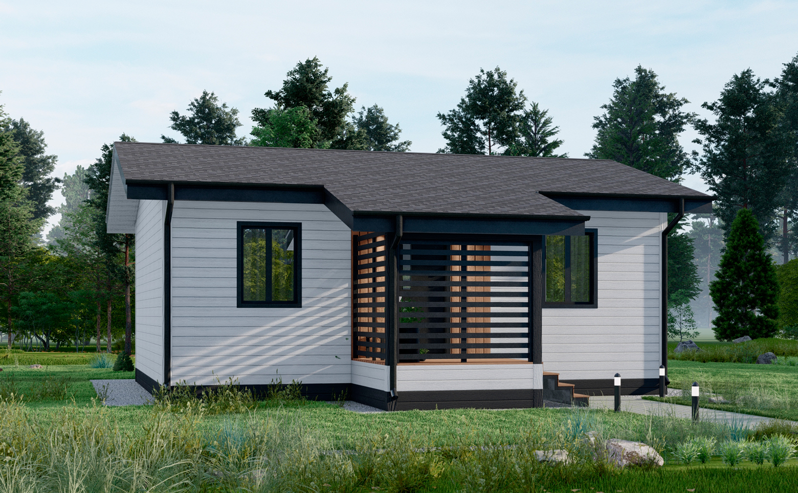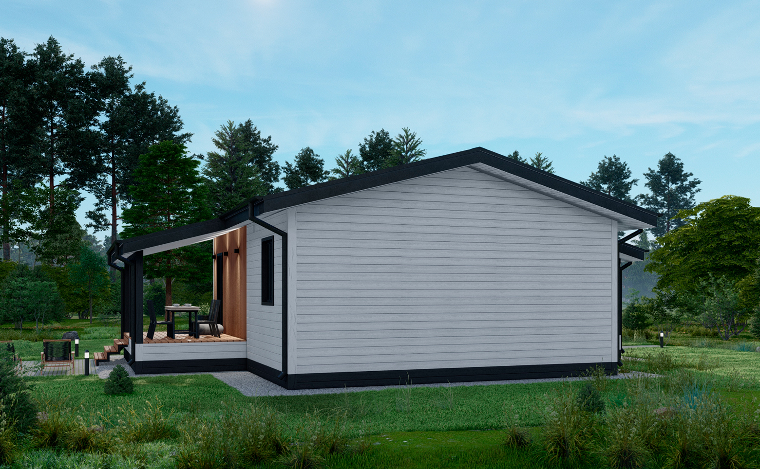 В проекте представлен одноэтажный коттедж площадью 75 кв. м с кухней-гостиной и 2 комнатами. Высота потолков составляет 2,8 м. В доме установлены стандартные и панорамные окна, которые создают комфортное естественное освещение. Отделка — подчистовая, стены обшиты гипсокартоном с заделанными стыками.