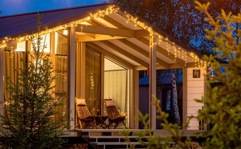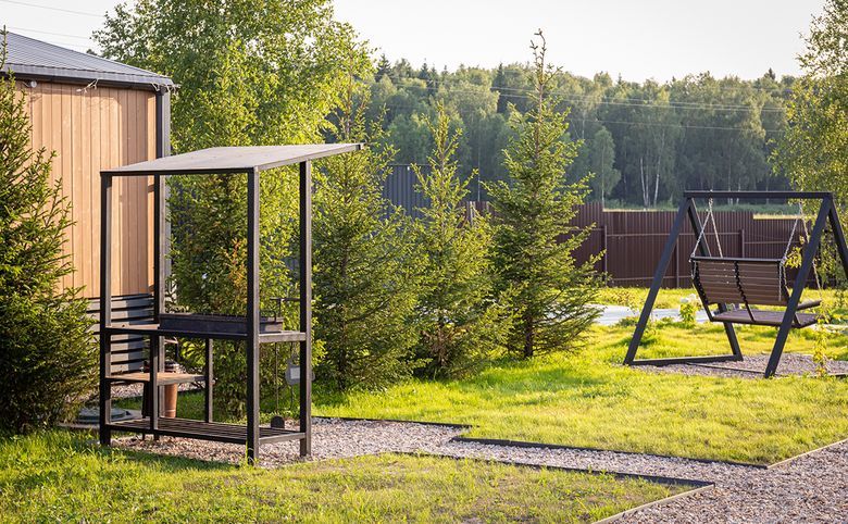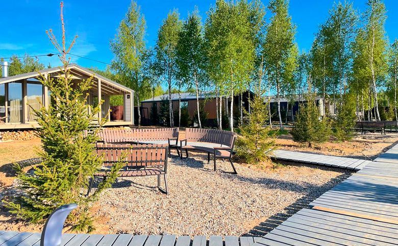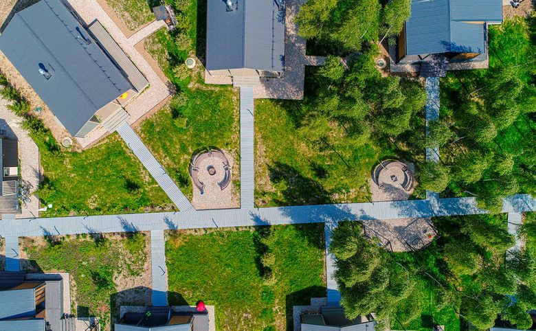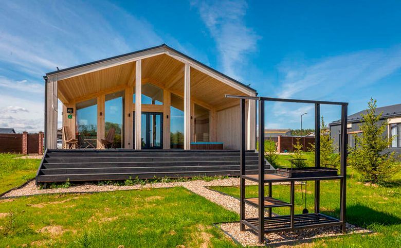 В проекте представлены одноэтажные коттеджи с потолками высотой 4,16 метра и несколькими форматами окон: панорамные, стандартные и окна в ванной. Дома идут с полной меблировкой, кухонным гарнитуром с техникой, сауной, купелью и верандой. На участке предусмотрена стоянка на 2 автомобиля, уличная мебель и крытый мангал.