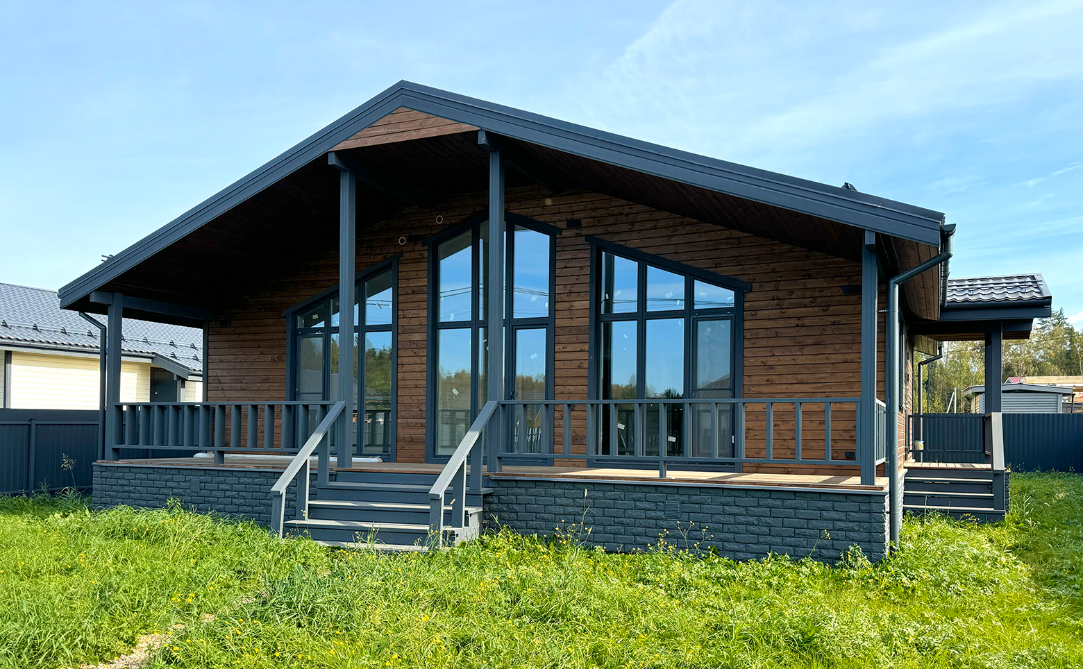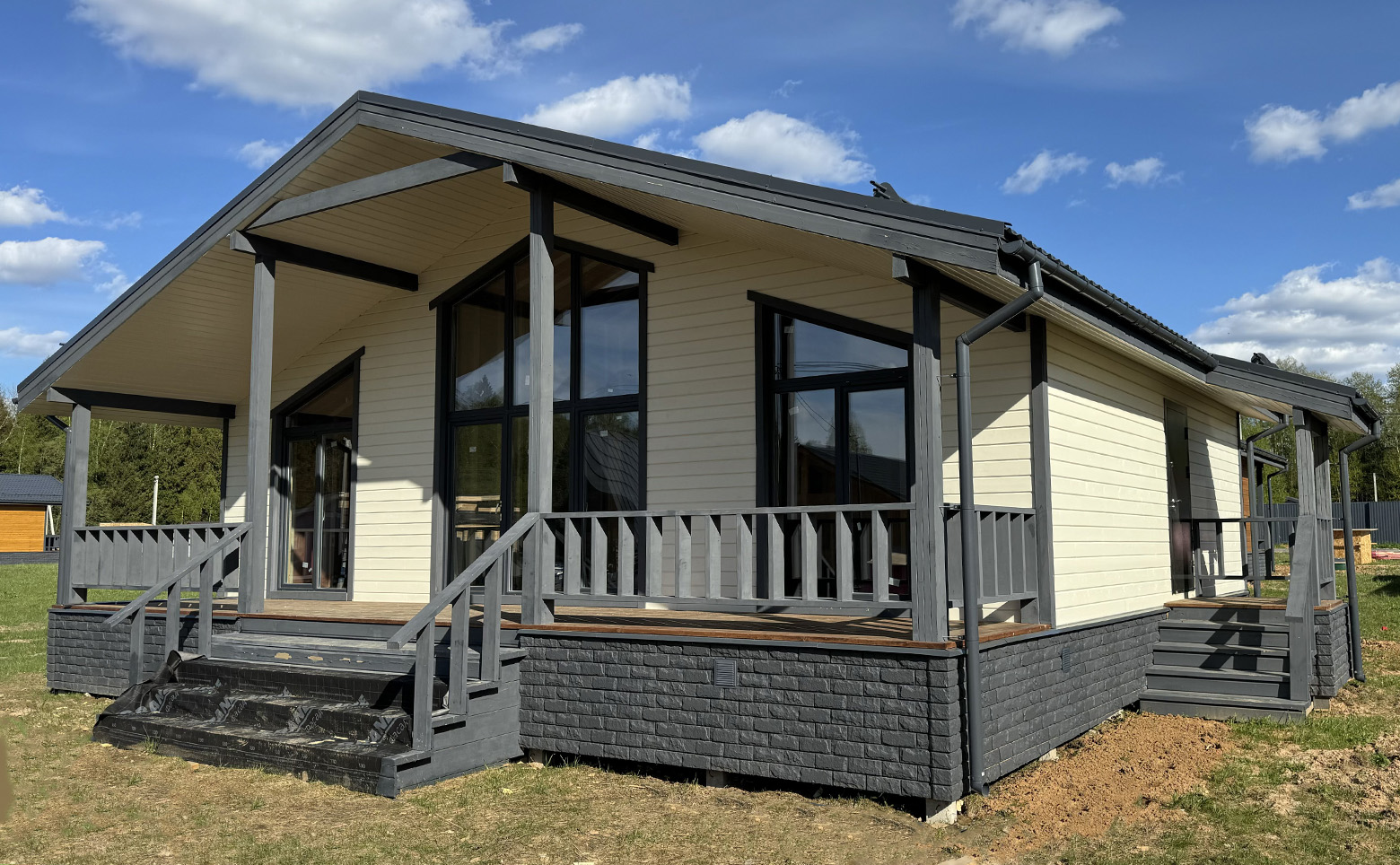В проекте предложено несколько видов планировок одноэтажных коттеджей. В каждом доме предусмотрены терраса, просторная кухня-гостиная. Сдаются лоты с чистовой отделкой, стандартными и панорамными окнами и высотой потолков от 2,5 до 4,5 метра.