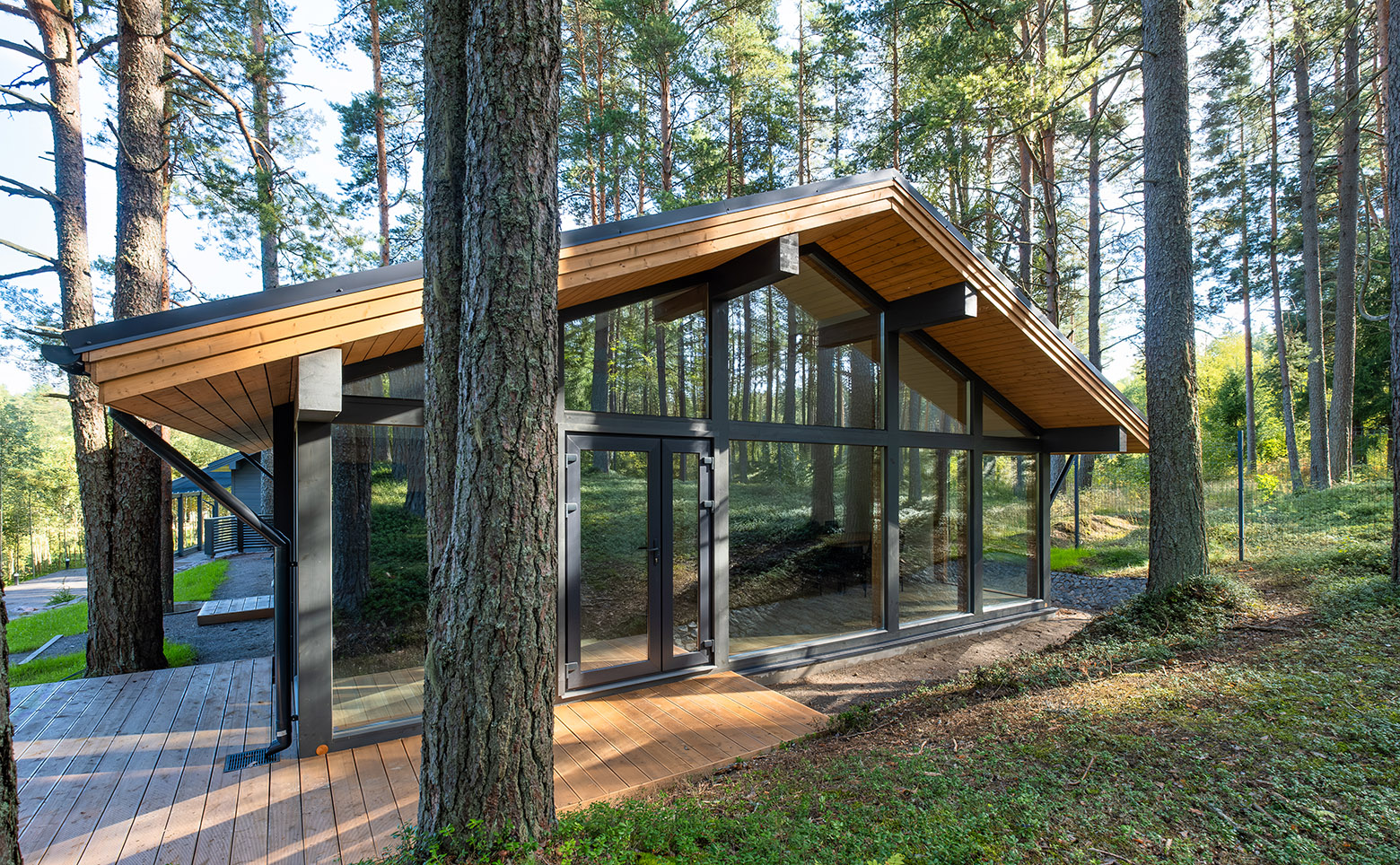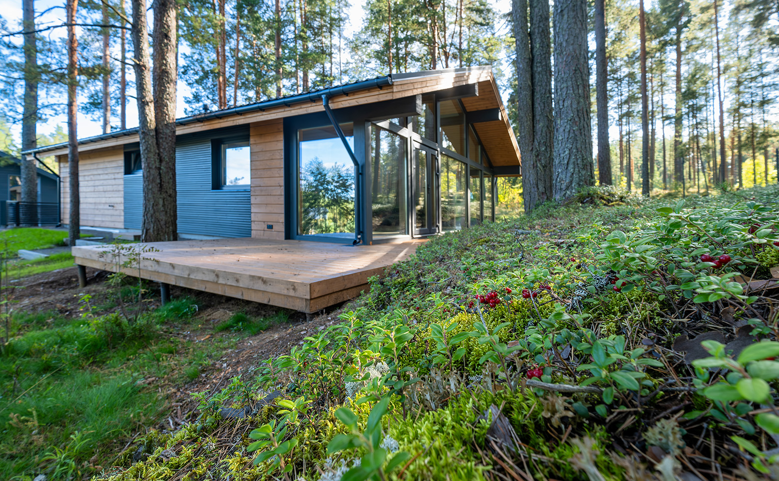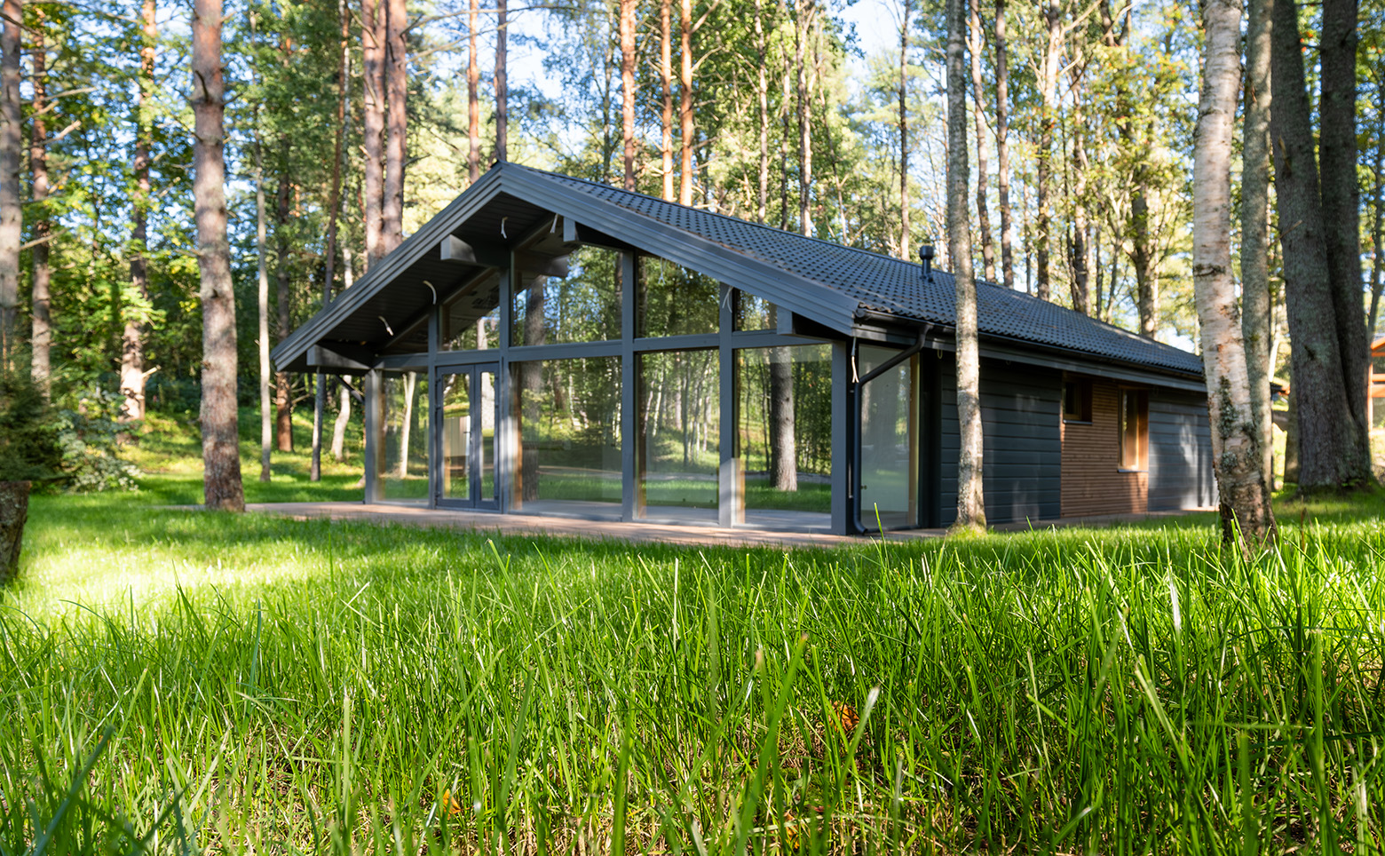 На участках предлагаются коттеджи площадью 128,4 кв. м. Планировки включают 3 спальни, кухню-гостиную, 2 санузла и террасу. В домах предусмотрены панорамные и увеличенные окна, высота потолков составляет 4 м. Доступно 2 варианта отделки: без отделки и подчистовая.