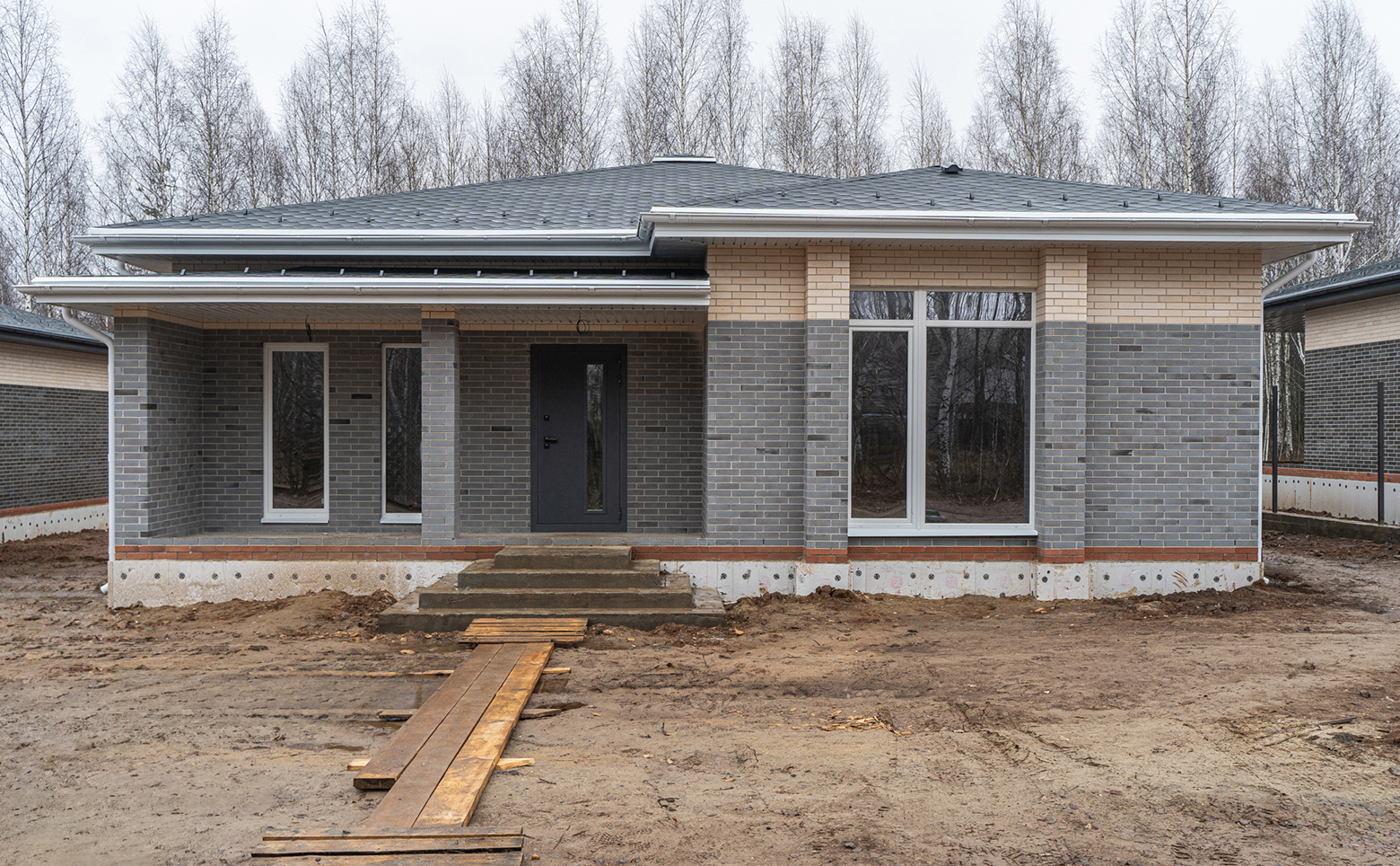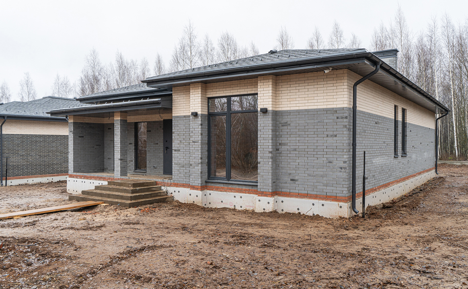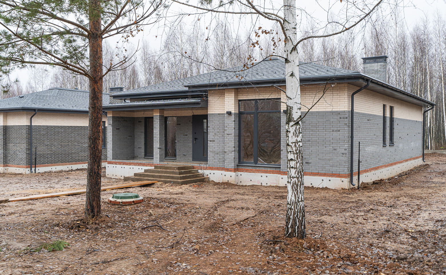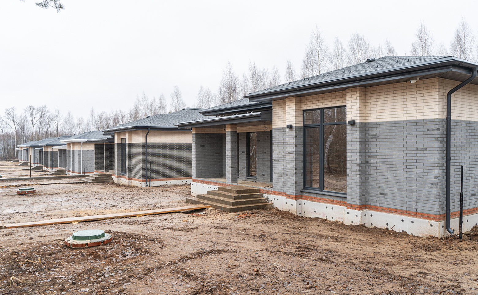 Коттеджный поселок представляет собой современный проект, возведенный по кирпичной технологии строительства с фасадами облицованными кирпичом. Все дома выполнены в едином архитектурном стиле.