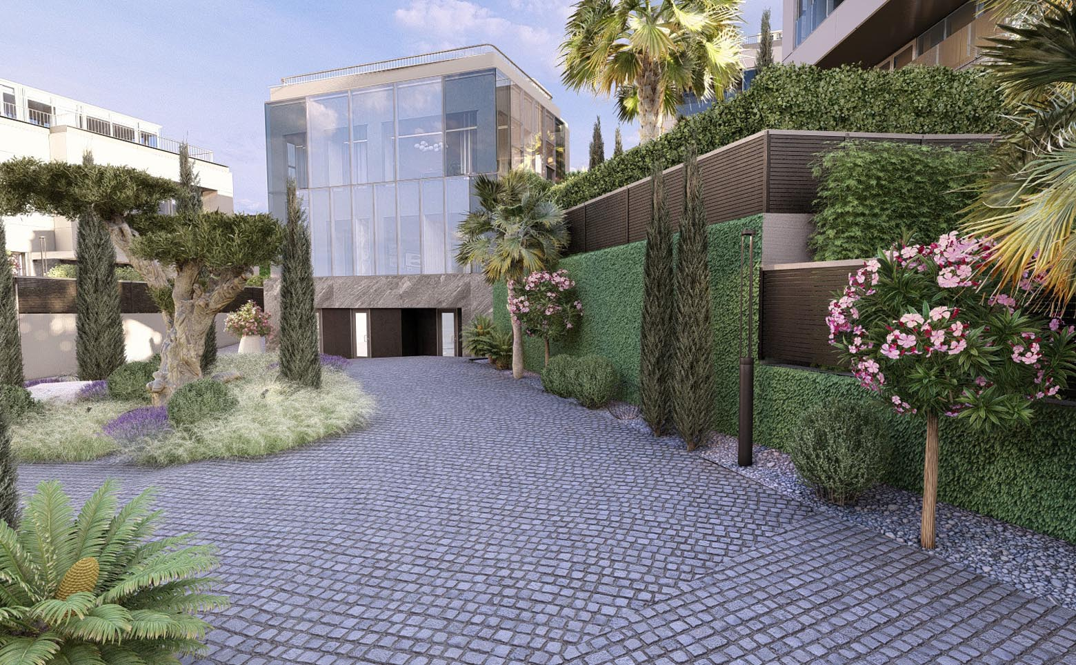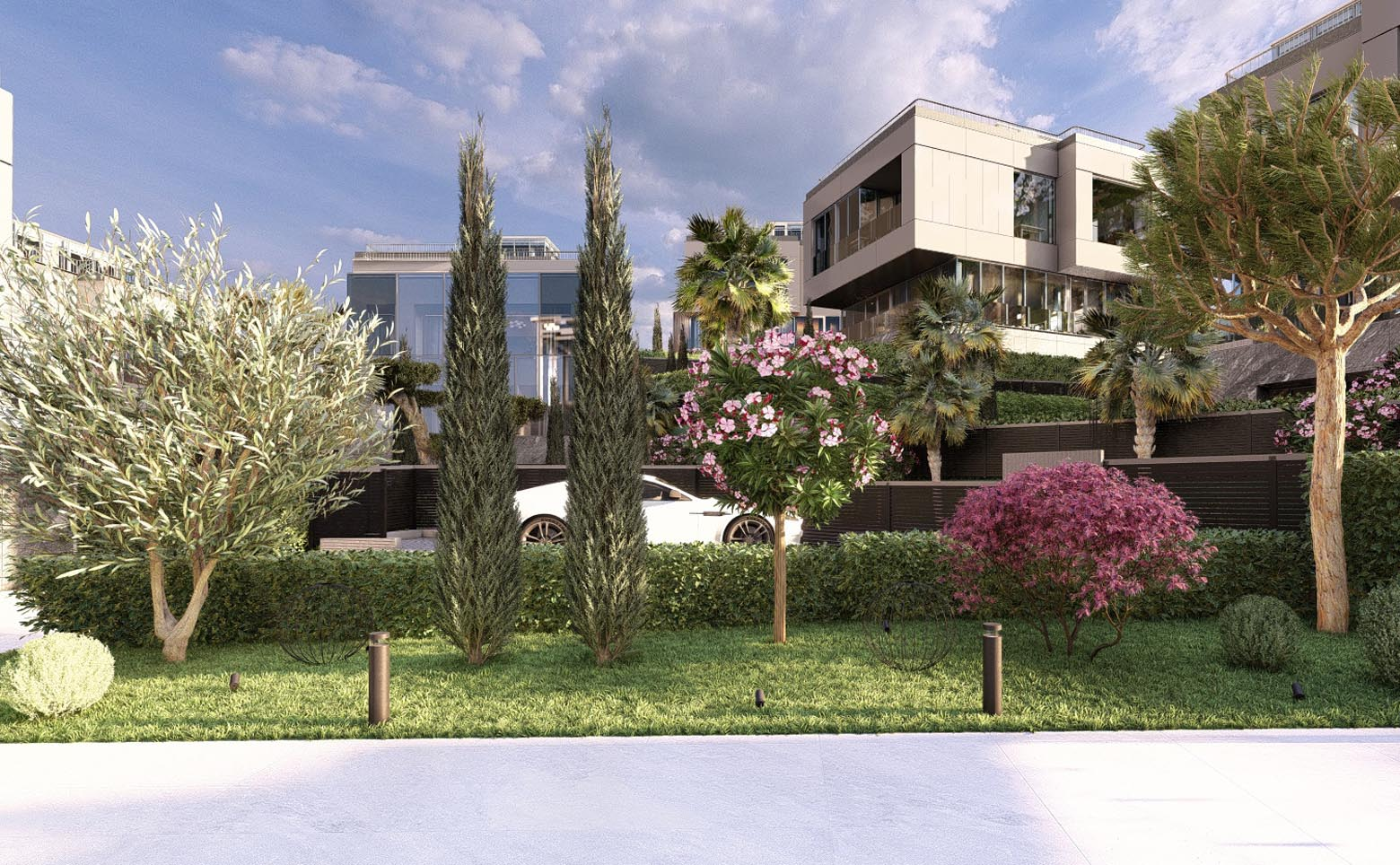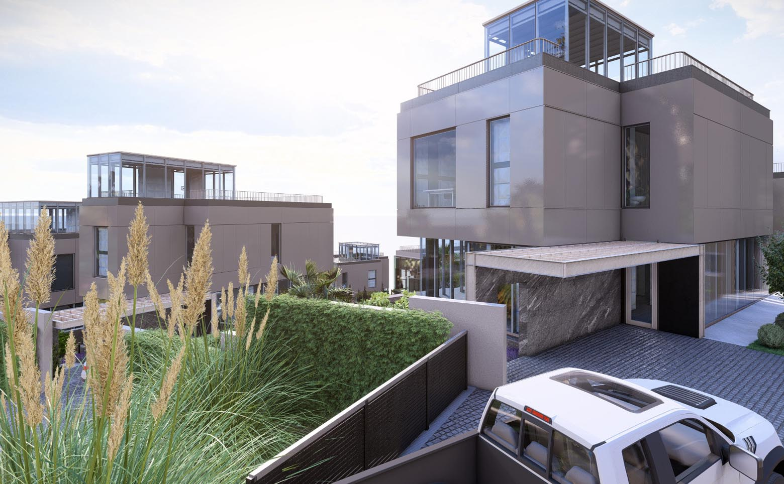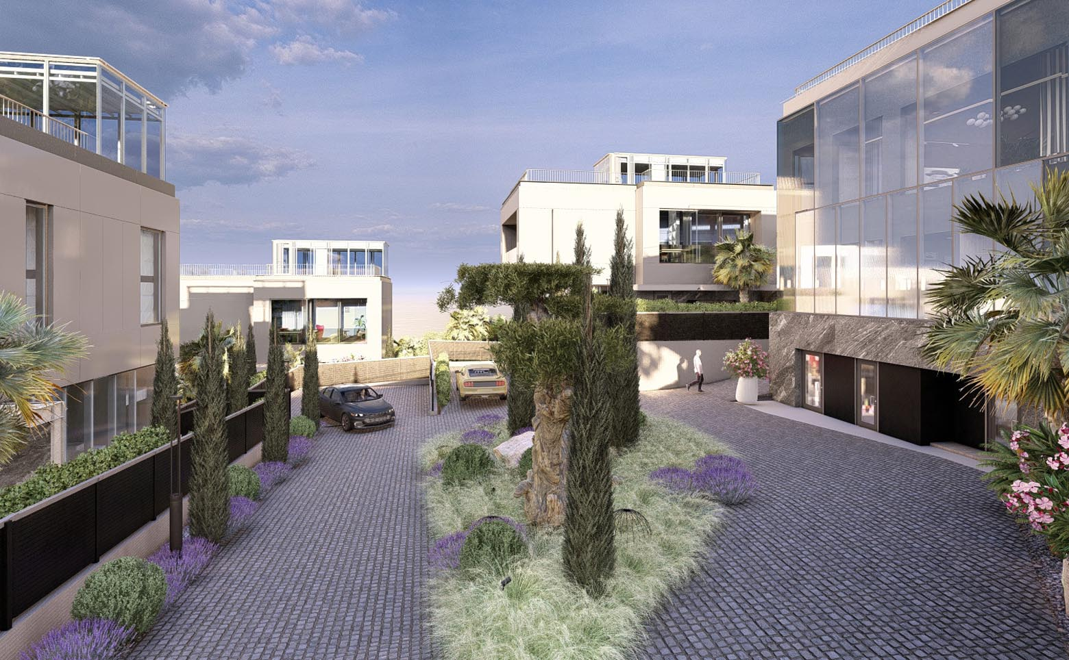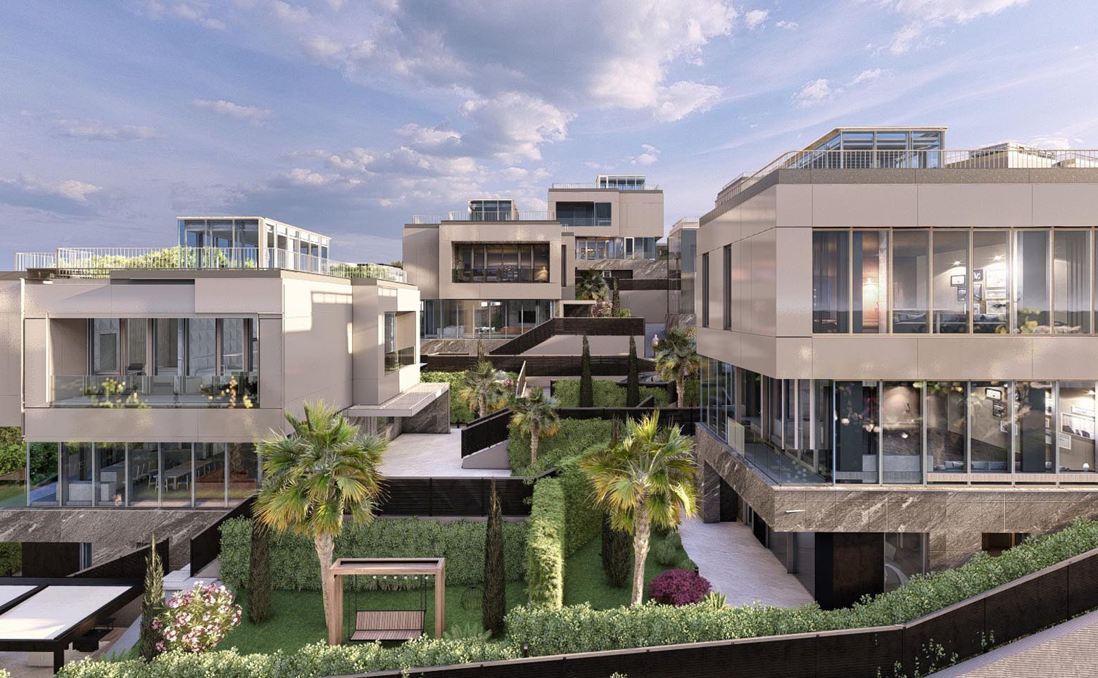 В проекте предлагаются двухэтажные коттеджи площадью 300 кв. м. В домах установлены панорамные окна, из которых открывается вид на национальный парк. Высота потолков достигает 3,8 м. Отделка — подчистовая: стены оштукатурены и готовы к финишным работам.