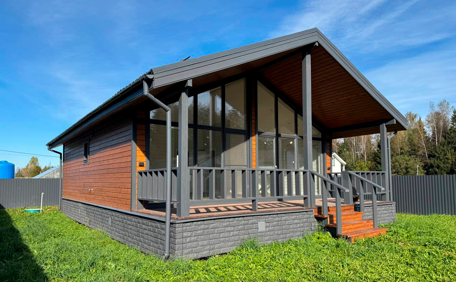 Коттеджный поселок представляет собой каркасные дома с фасадами из дерева.