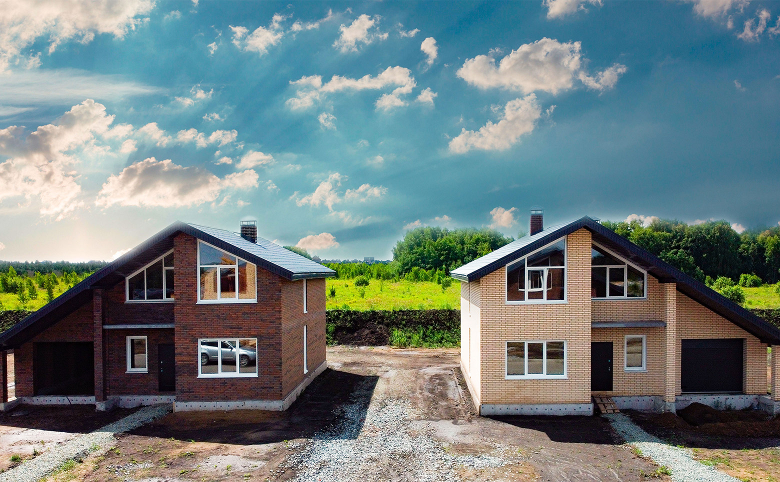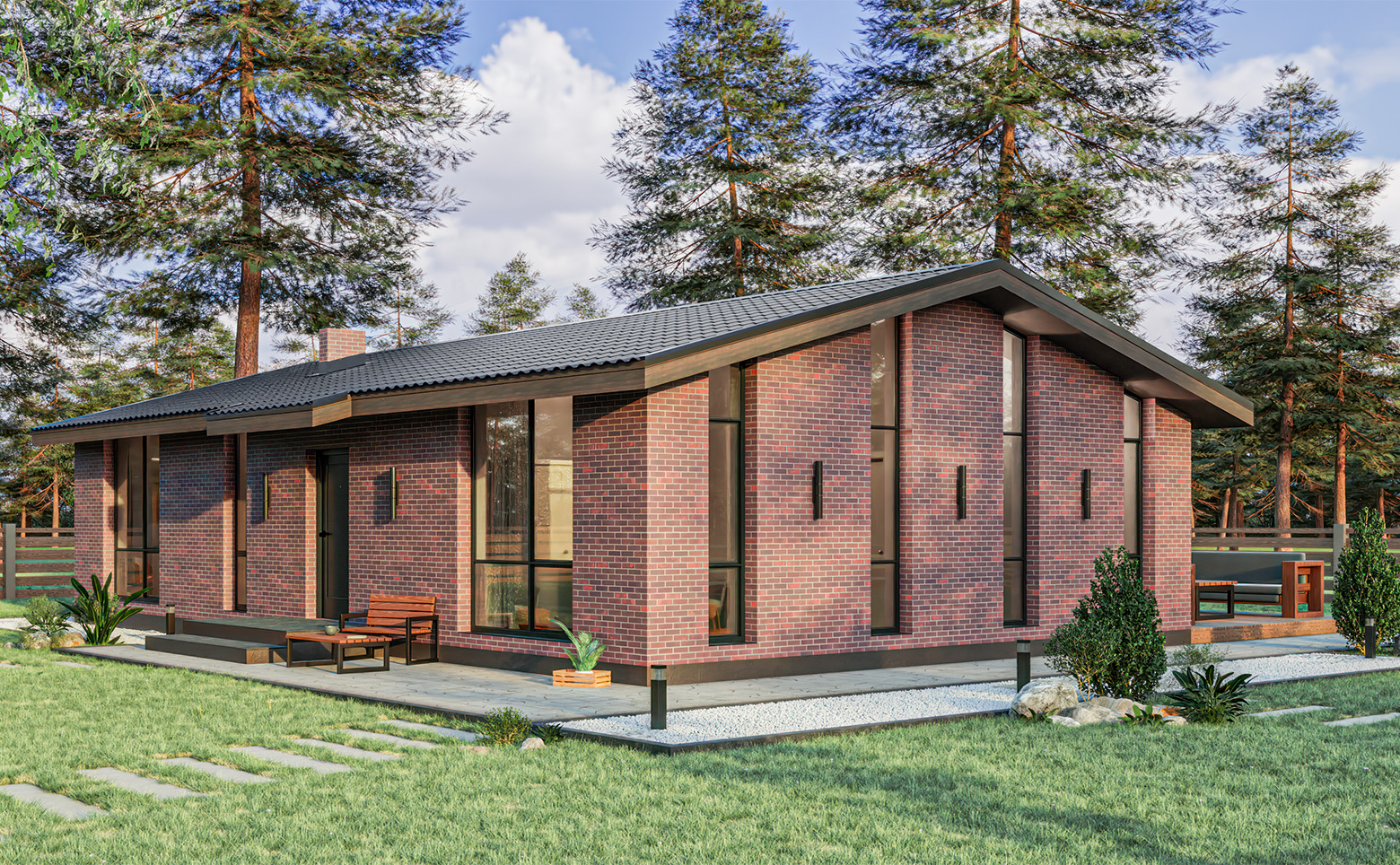 В проекте предложено несколько видов 1- и 2-этажных коттеджей. Дома сдаются с увеличенными окнами, высотой потолков 3 метра и возможностью дозаказать подчистовую отделку.