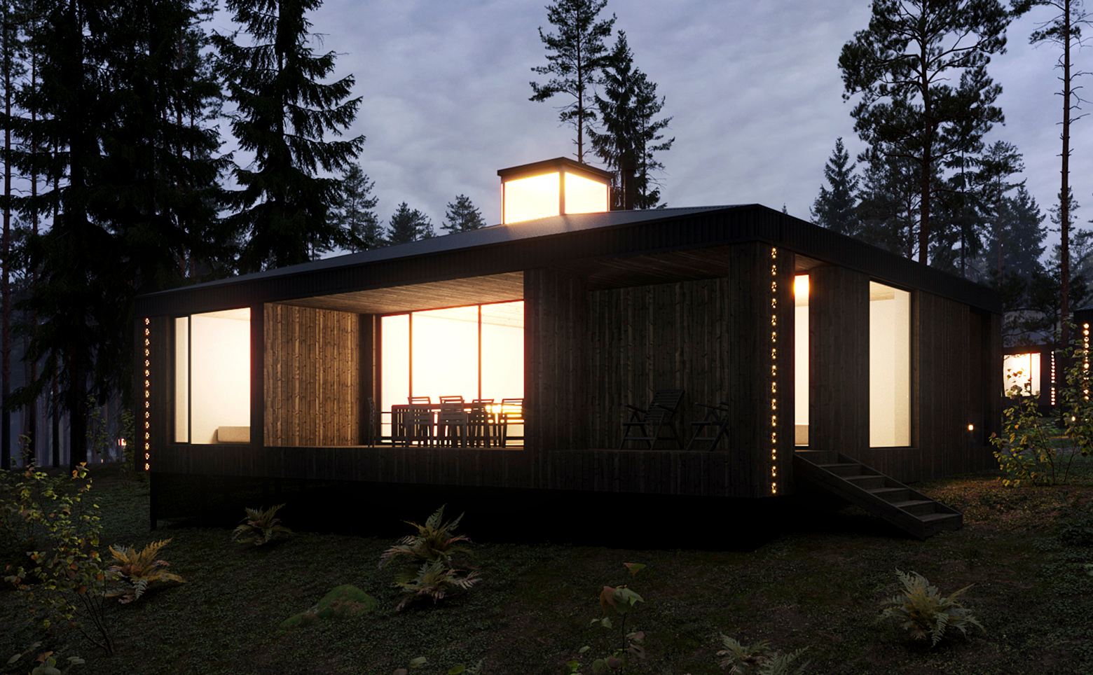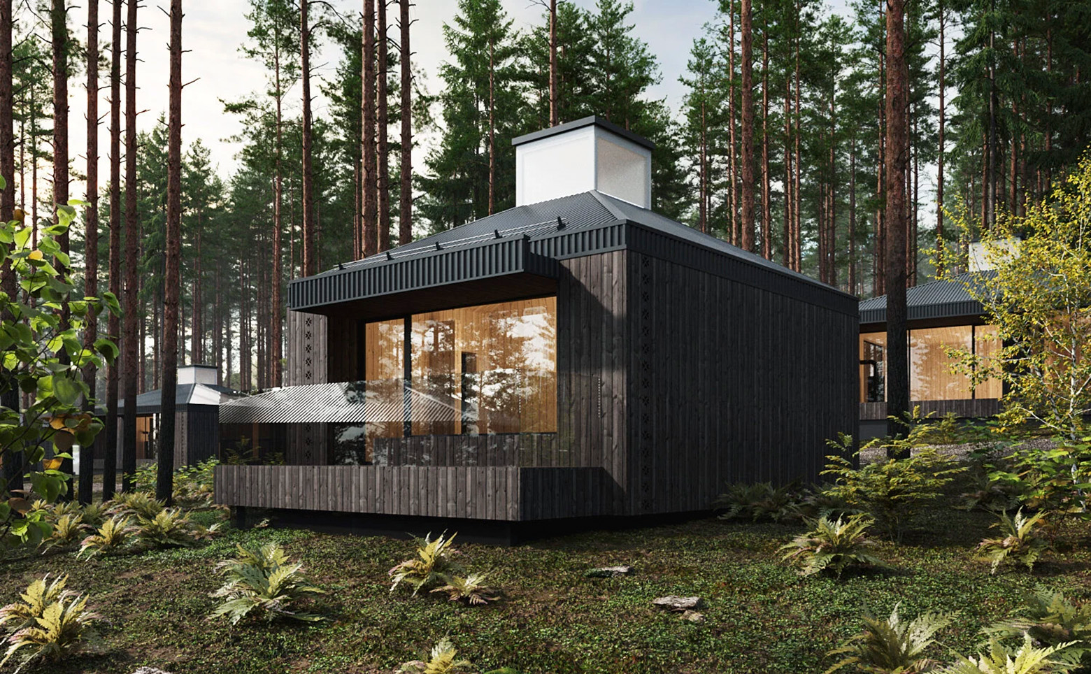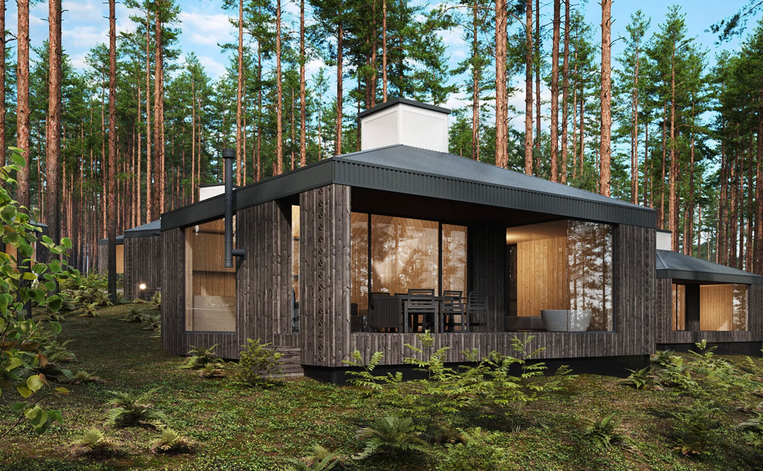 В проекте представлены одноэтажные коттеджи с панорамными окнами и окнами в ванных комнатах. Высота потолков составляет 4,16 метра. Интерьер выполнен в светлой гамме с элементами минимализма и традиционной русской обстановки. Электроснабжение заведено в дом и рассчитано на мощность от 10 до 15 кВт. Водоснабжение осуществляется от скважины, канализация — на базе септика.