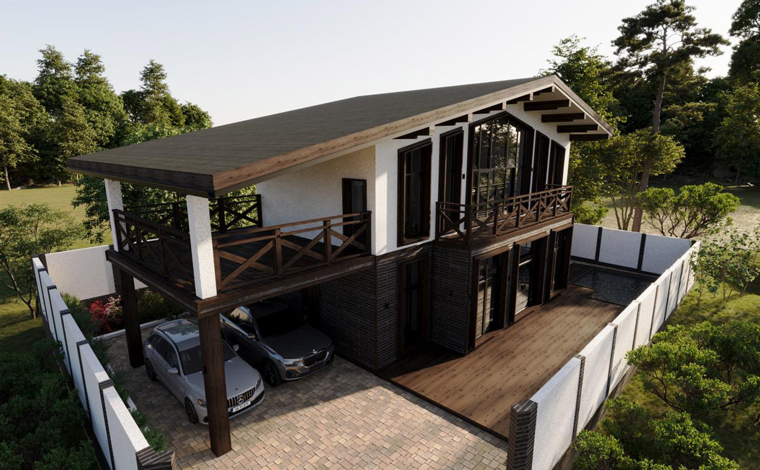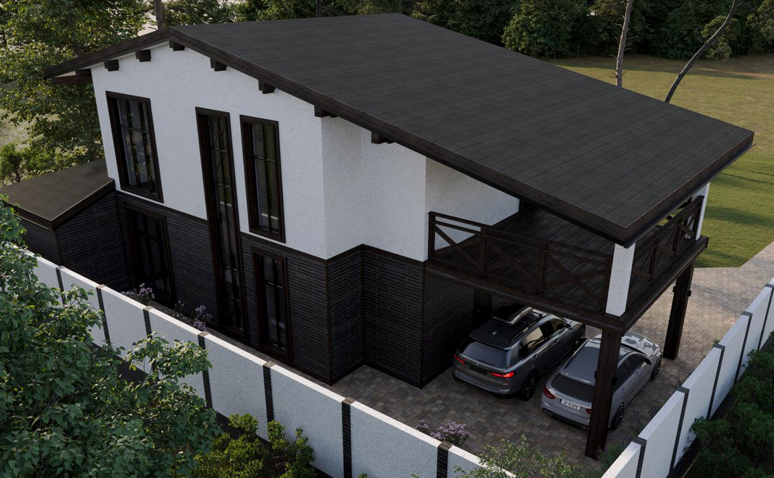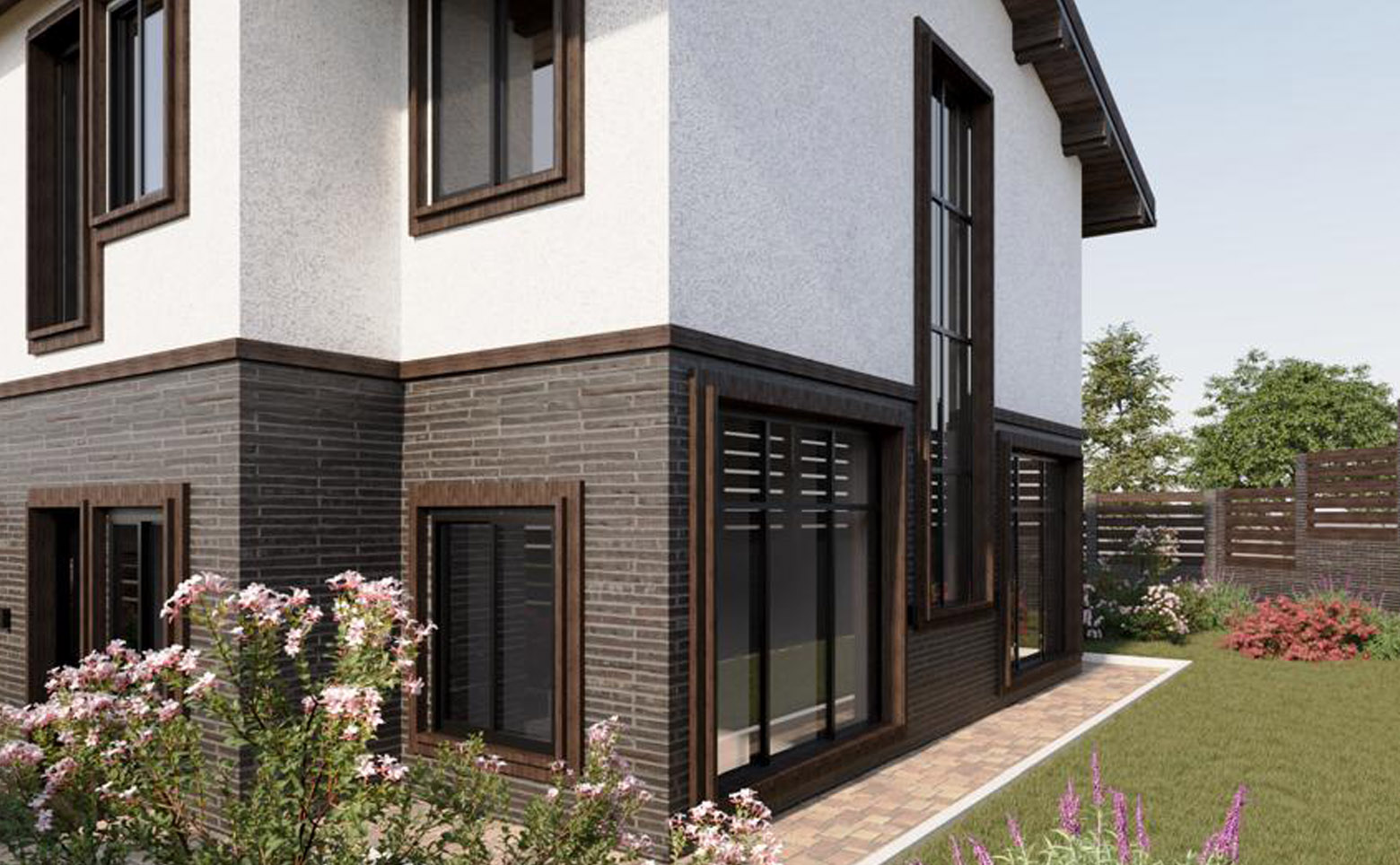 В проекте представлены коттеджи площадью 234,08 кв. м. В домах предусмотрены мастер-спальня и гардеробная, установлены увеличенные и панорамные окна. Высота потолков — 3,4 м. Дома передаются без отделки с возможностью дозаказа чистовой отделки. На участке площадью 5,13 сотки помимо жилого дома предусмотрено комплексное благоустройство: ландшафтное озеленение и ограждение по периметру, крытый гараж на 3 автомобиля площадью 66,05 кв. м, русская баня на дровах площадью 26,53 кв. м, открытый бассейн с подогревом и подсветкой площадью 18 кв. м, а также мангальная зона площадью 9,43 кв. м.