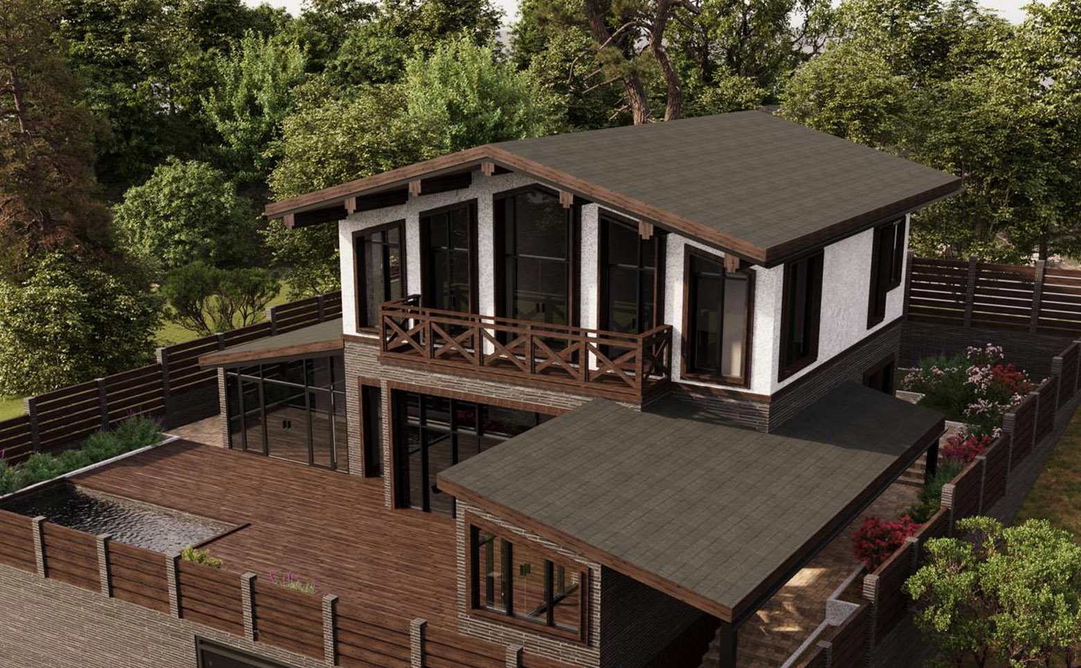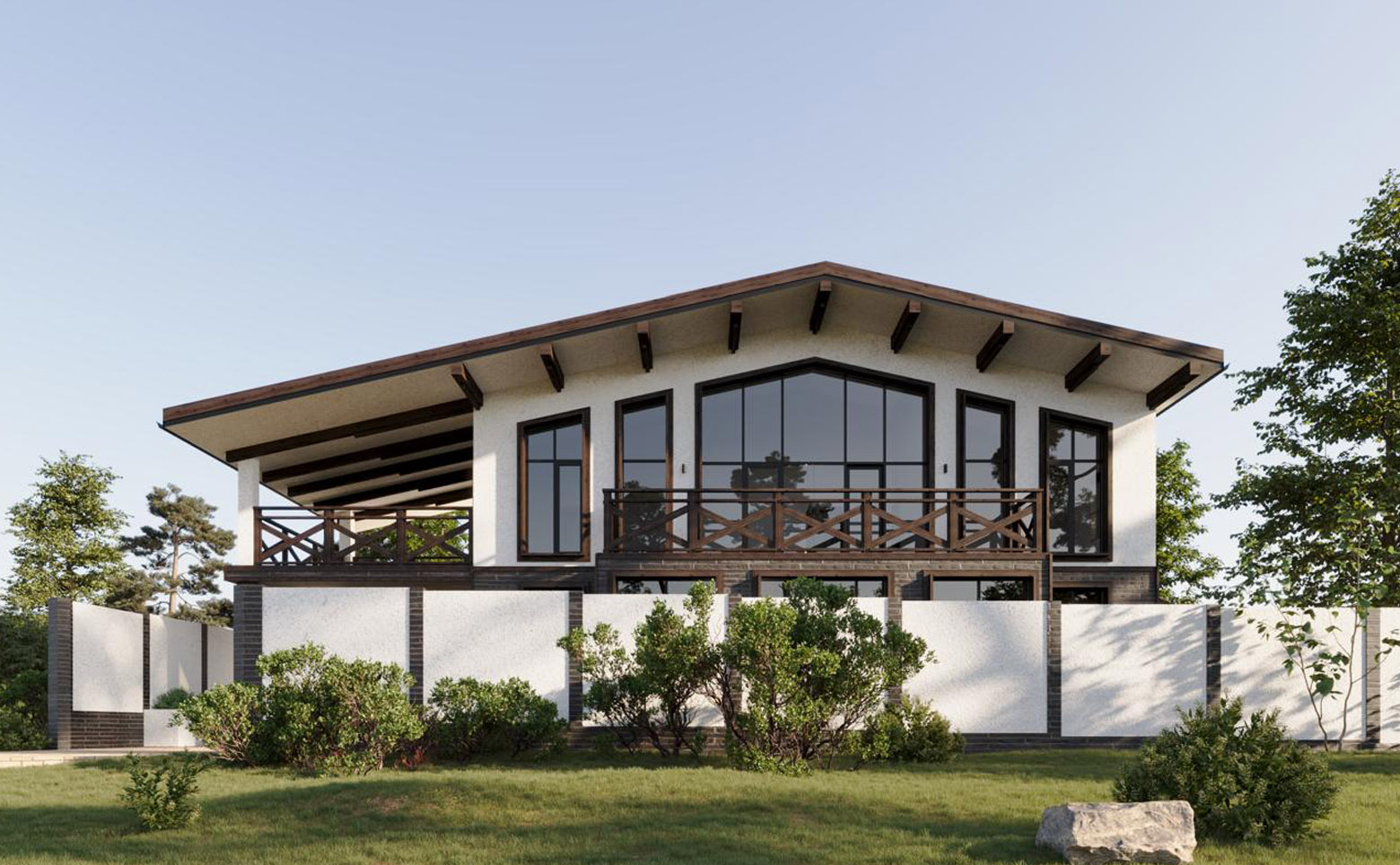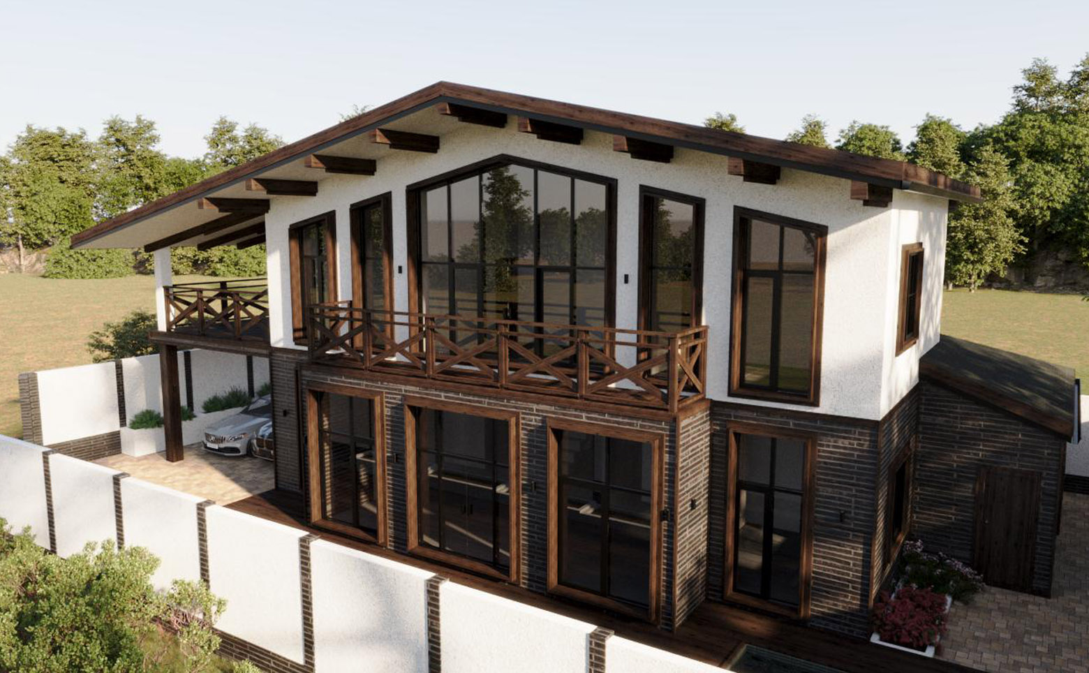 В проекте представлены коттеджи площадью 234,08 кв. м. В домах предусмотрены мастер-спальня и гардеробная, установлены увеличенные и панорамные окна. Высота потолков — 3,4 м. Дома передаются без отделки с возможностью дозаказа чистовой отделки. На участке площадью 5,13 сотки помимо жилого дома предусмотрено комплексное благоустройство: ландшафтное озеленение и ограждение по периметру, крытый гараж на 3 автомобиля площадью 66,05 кв. м, русская баня на дровах площадью 26,53 кв. м, открытый бассейн с подогревом и подсветкой площадью 18 кв. м, а также мангальная зона площадью 9,43 кв. м.