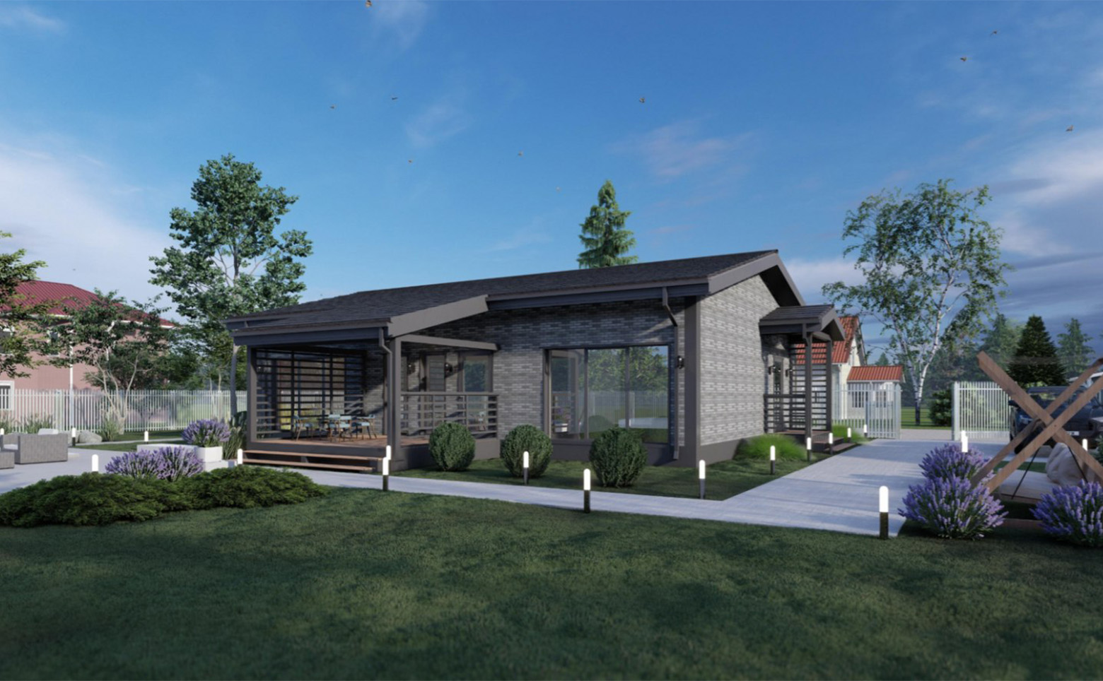 Проект представляет собой коттеджный поселок из участков от 8 до 30 соток. Дома возводятся по каркасной технологии строительства с фасадами из дерева или облицовочного кирпича.