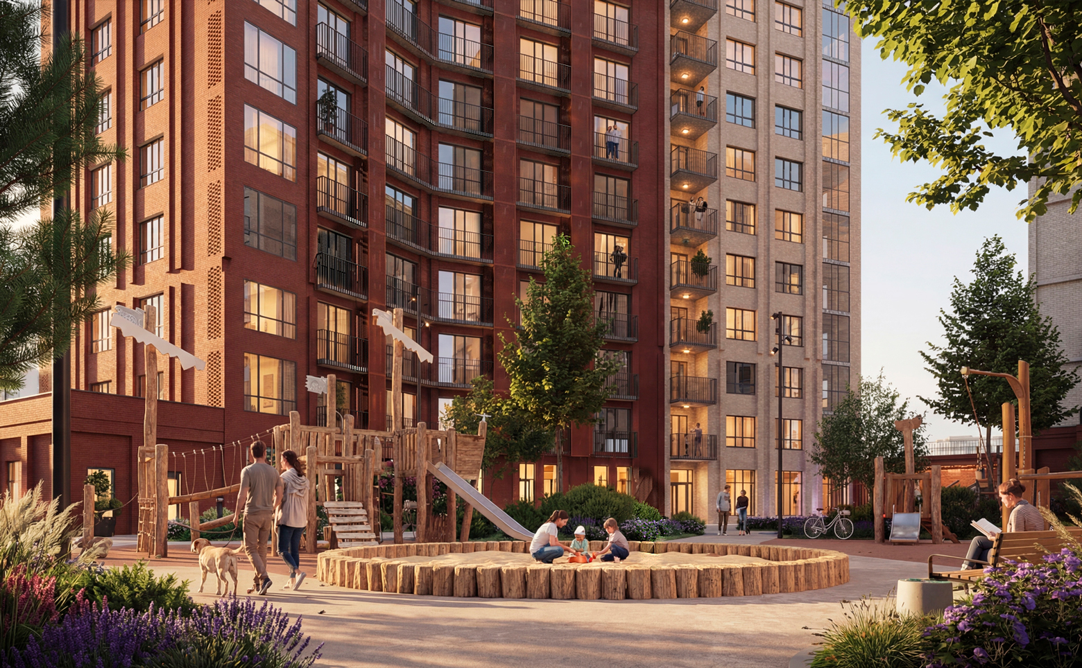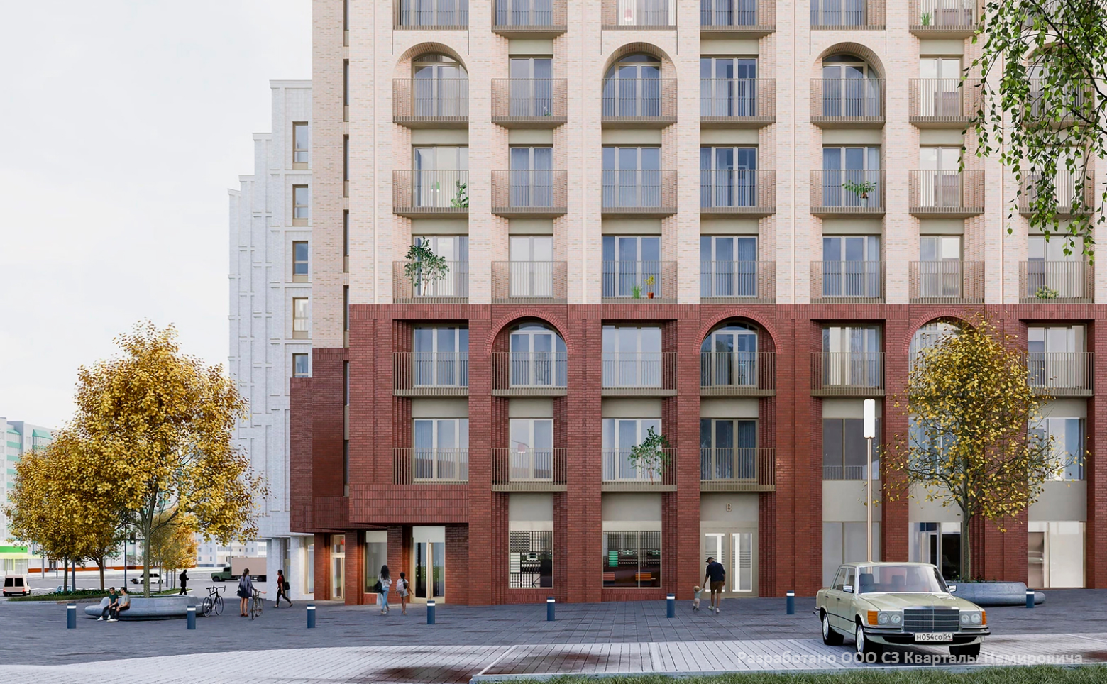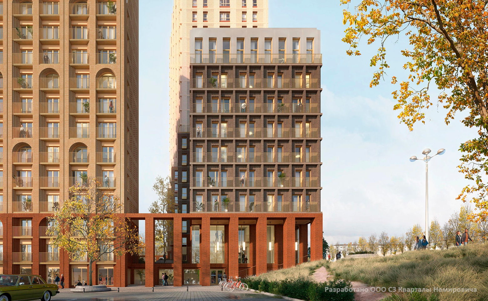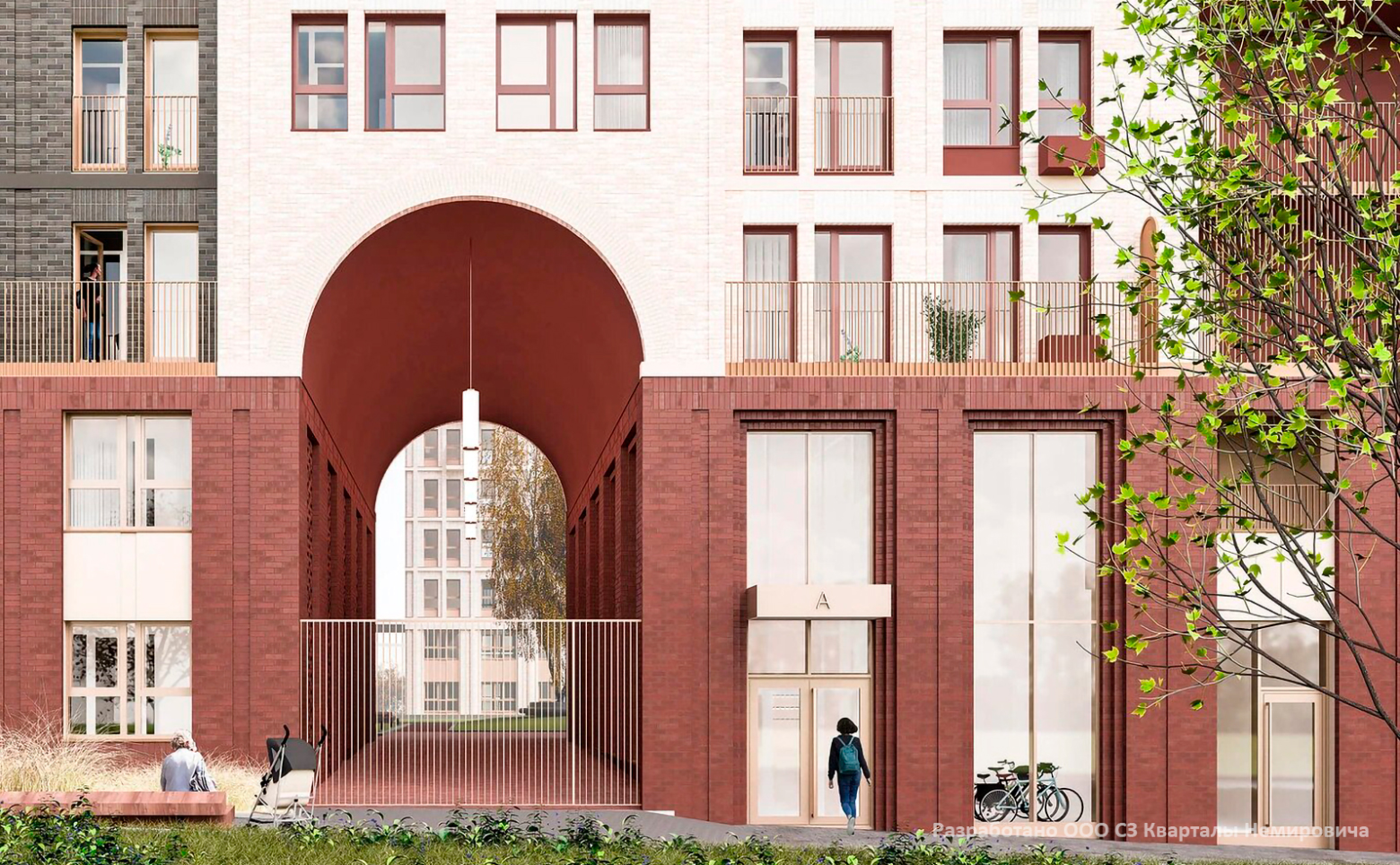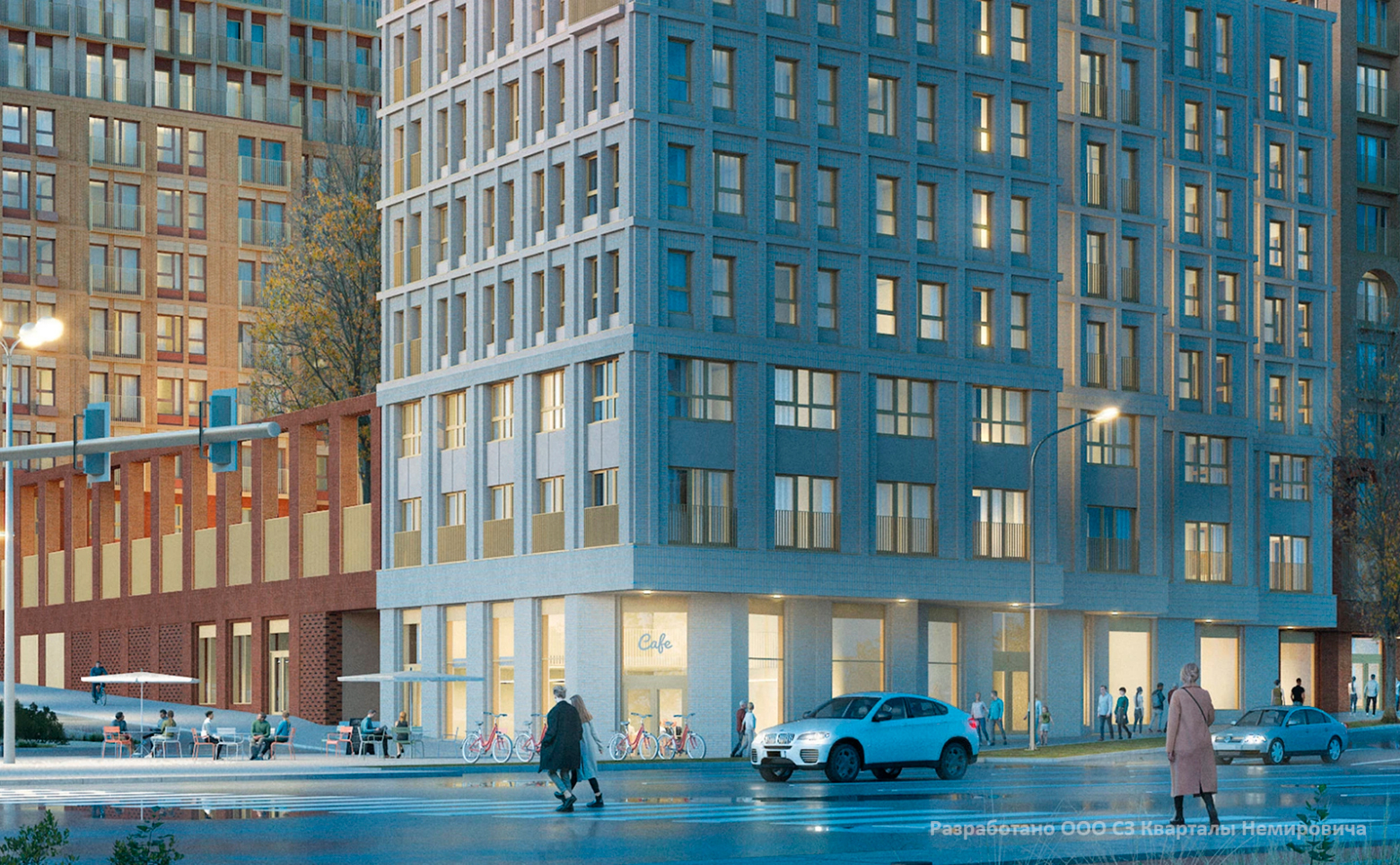 В жилом комлексе реализован двор в формате семейного пространства. Рекреация разделена на тематические зоны. Внутренний двор поднят на стилобат подземного паркинга на несколько метров над уровнем земли. На первых этажах дома находятся коммерческие помещения.