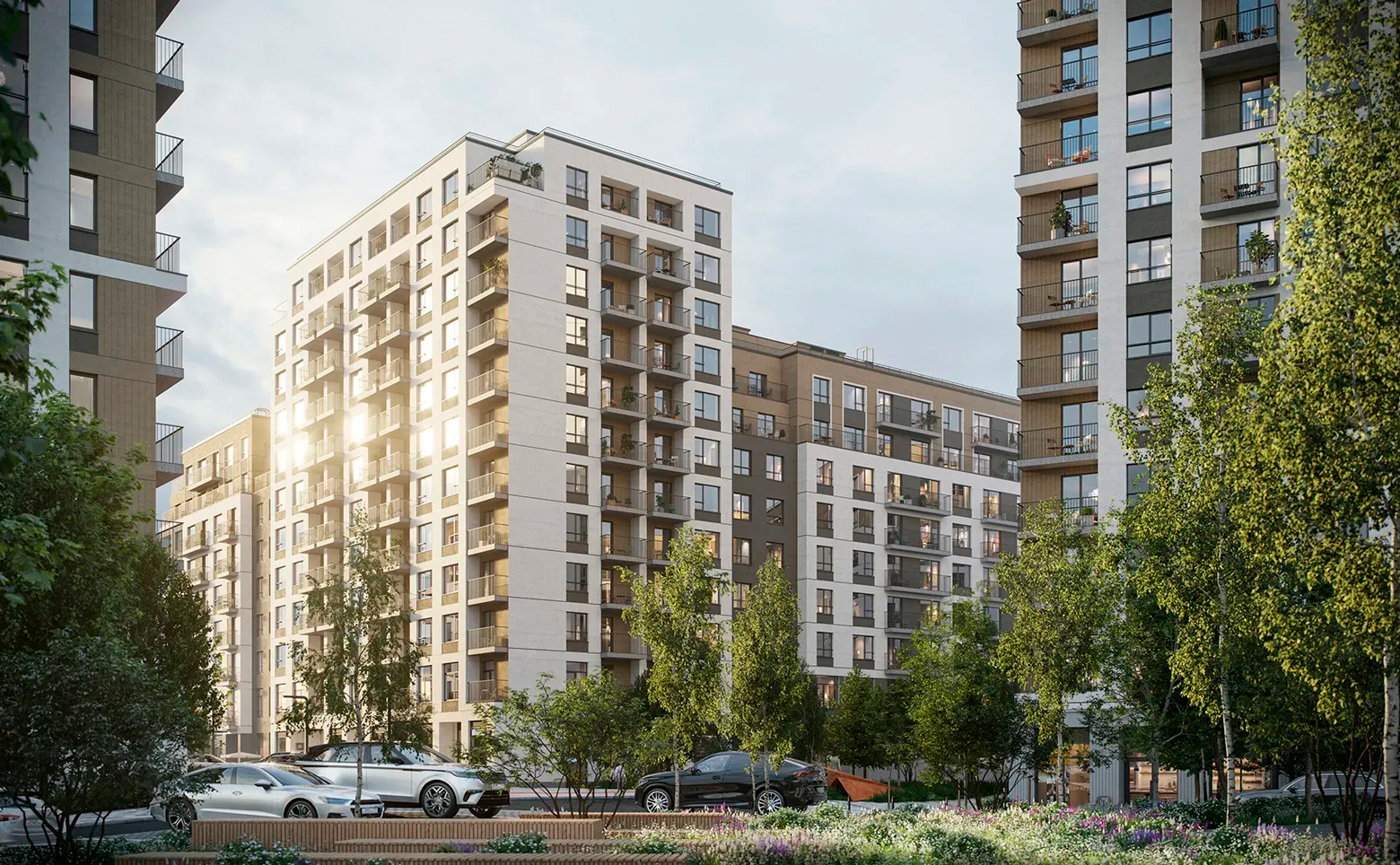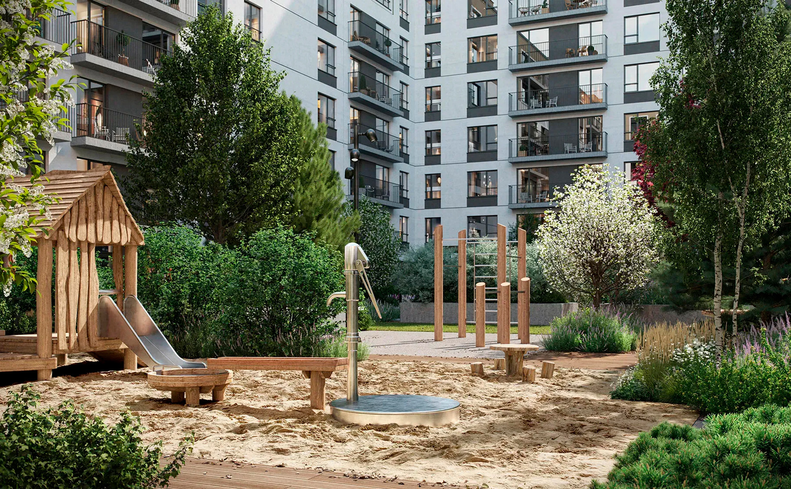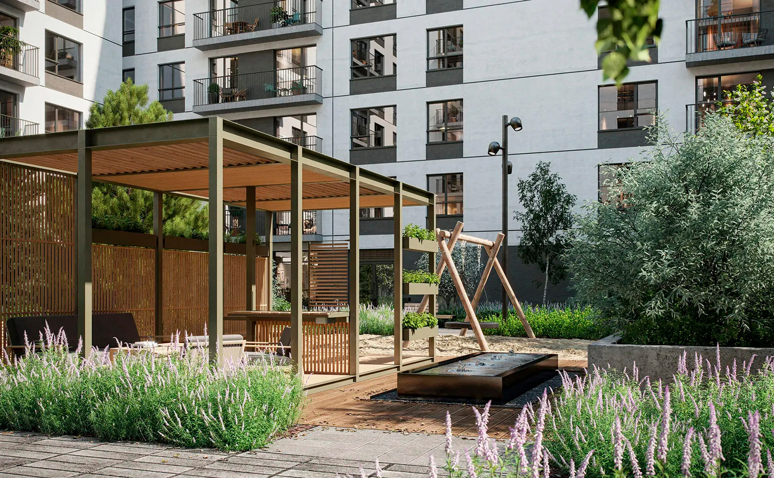 Во внутреннем дворе обустроены пространства для прогулок, спорта и отдыха. Камерные дворы предназначены для отдыха жителей и закрыты для других горожан. Они приподняты над уровнем земли, а доступ автомобилей на их территорию ограничен. На первых этажах расположены коммерческие помещения. Для владельцев автомобилей предусмотрен подземный паркинг.