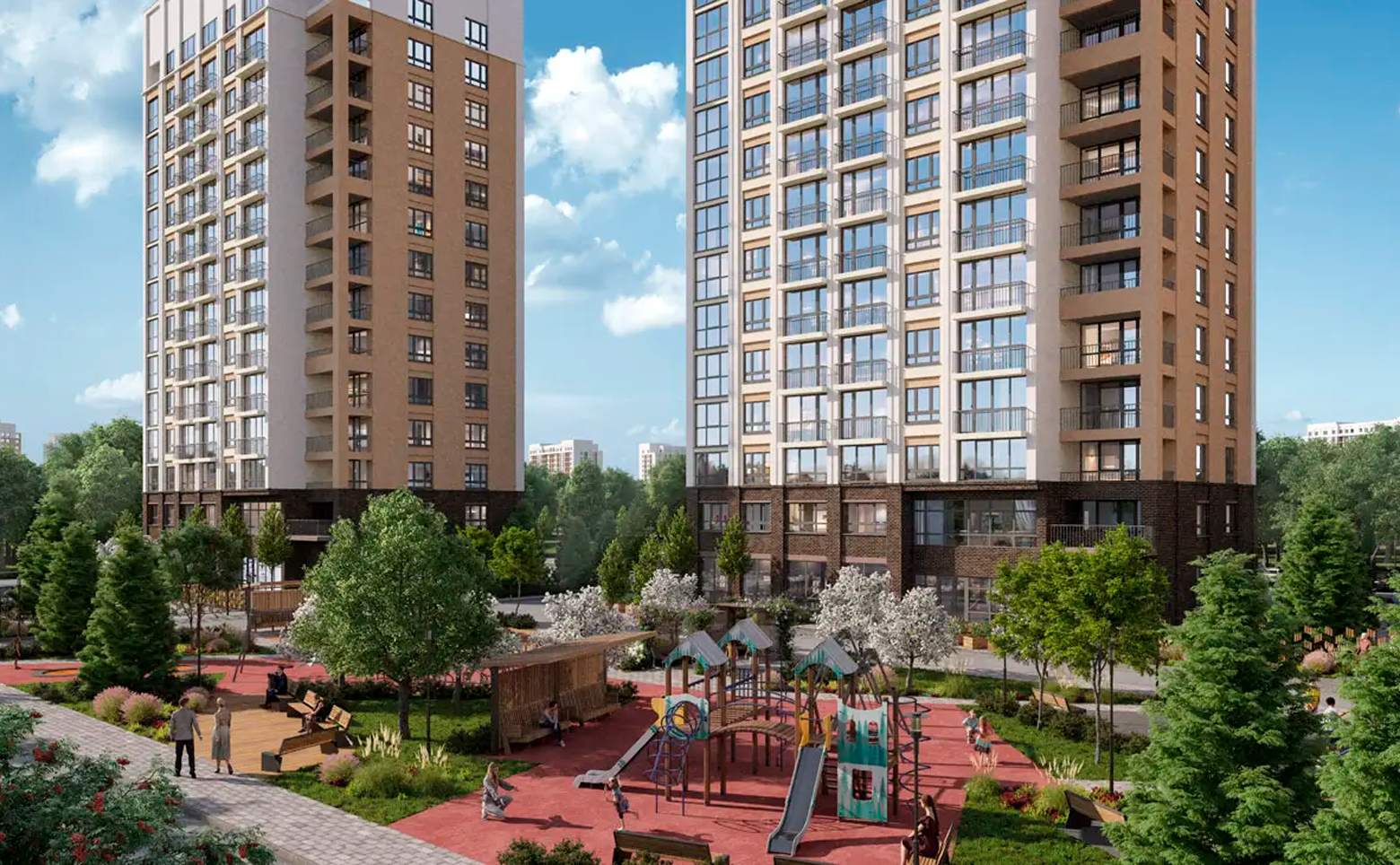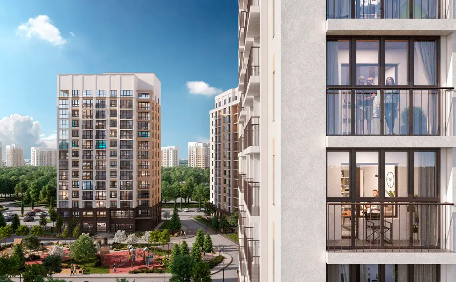 Общая территория проекта насчитывает 215 гектар и подразумевает концепцию «город в городе» с собственной развитой территорией. Дома построены по долговечной кирпично-монолитной технологии. Во всех корпусах выполнена дизайнерская отделка входных групп и установлены скоростные лифты.
