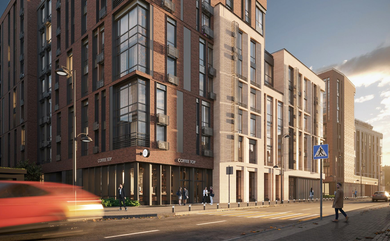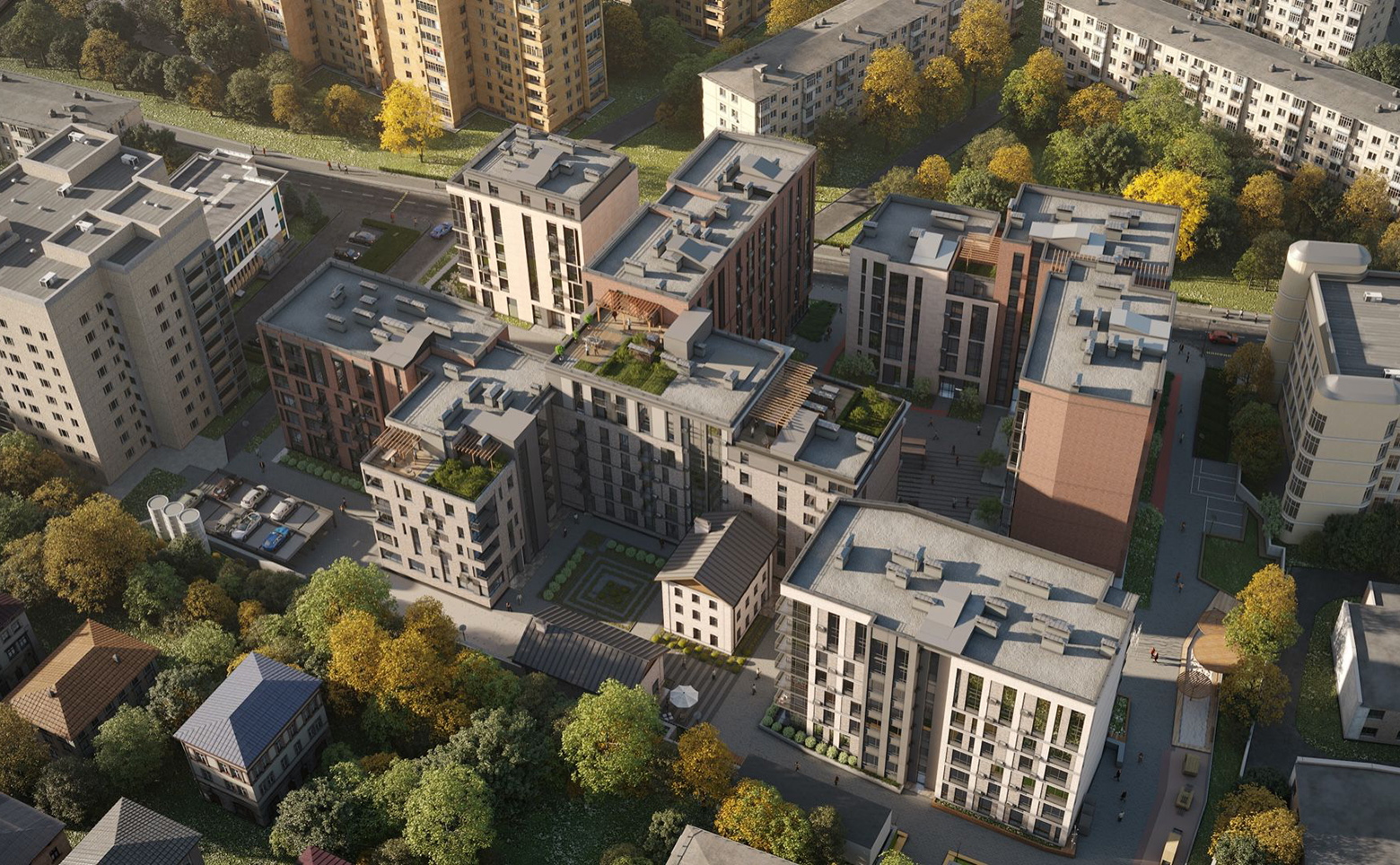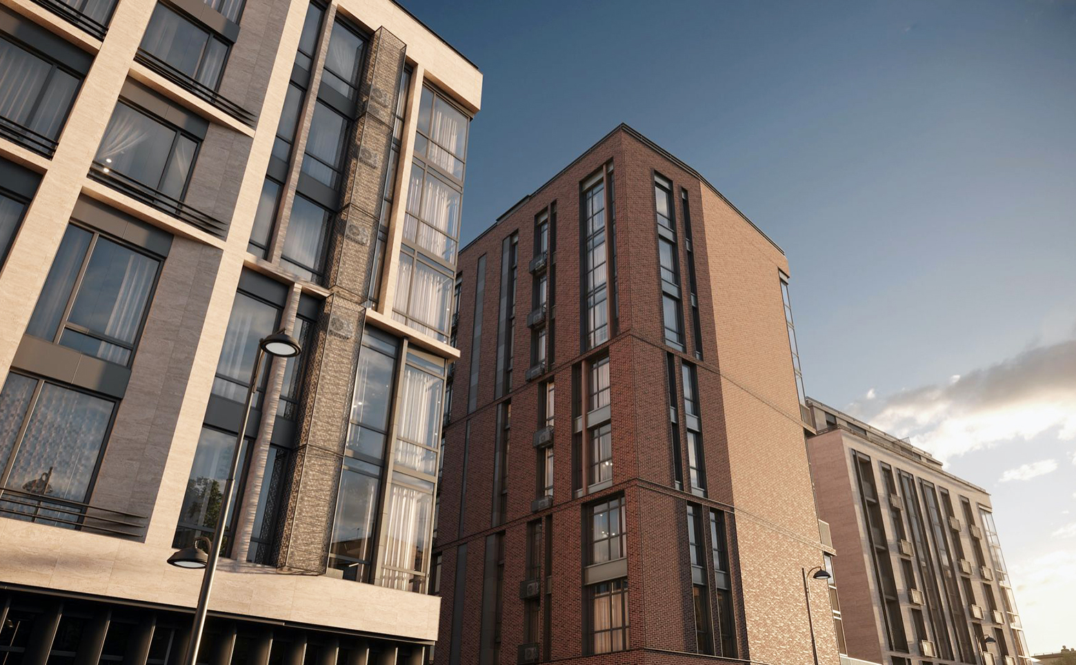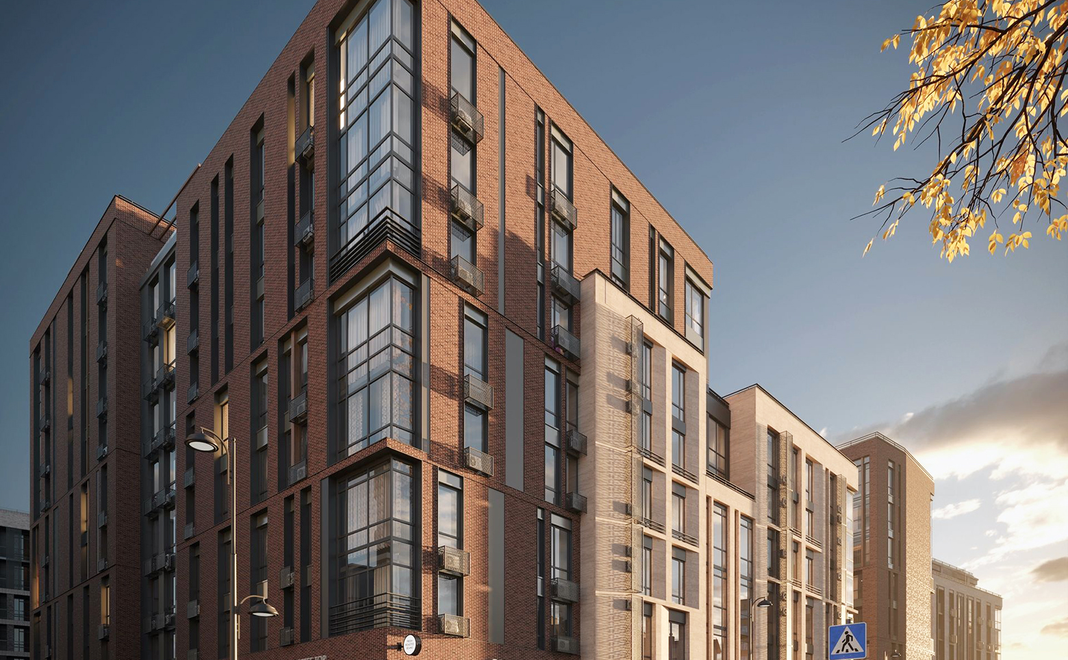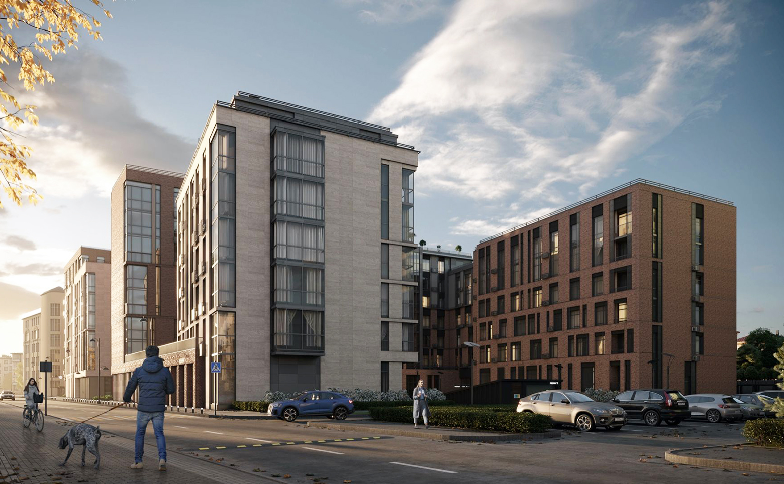 Концепт-комплекс состоит из нескольких корпусов переменной этажности: от 6 до 9 этажей. Дома построены из керамического кирпича и облицованы кирпичом или натуральным камнем. В отделке фасада преобладают природные цвета. Общие дизайнерские холлы наполнены полезными функциями: уютное лобби для жильцов и гостей, лифты бизнес класса из паркинга, сан узел и лапомойка, колясочные, витражное остекление, теплый тамбур, IP домофония, Face ID, автоматические счетчики в холлах.