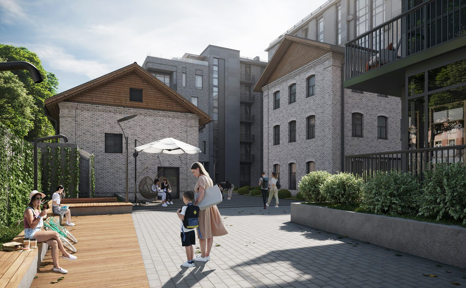 Внутренний двор разделен на функциональные зоны, плавно перетекающие друг в друга. На закрытой территории проекта предусмотрены: ландшафтный дизайн, озеленение многолетними деревьями и кустарниками, 3 концептуальных сада, места для отдыха, уникальная детская площадка с каменным ручьем и кварцевым песком и трехуровневое освещение двора.
