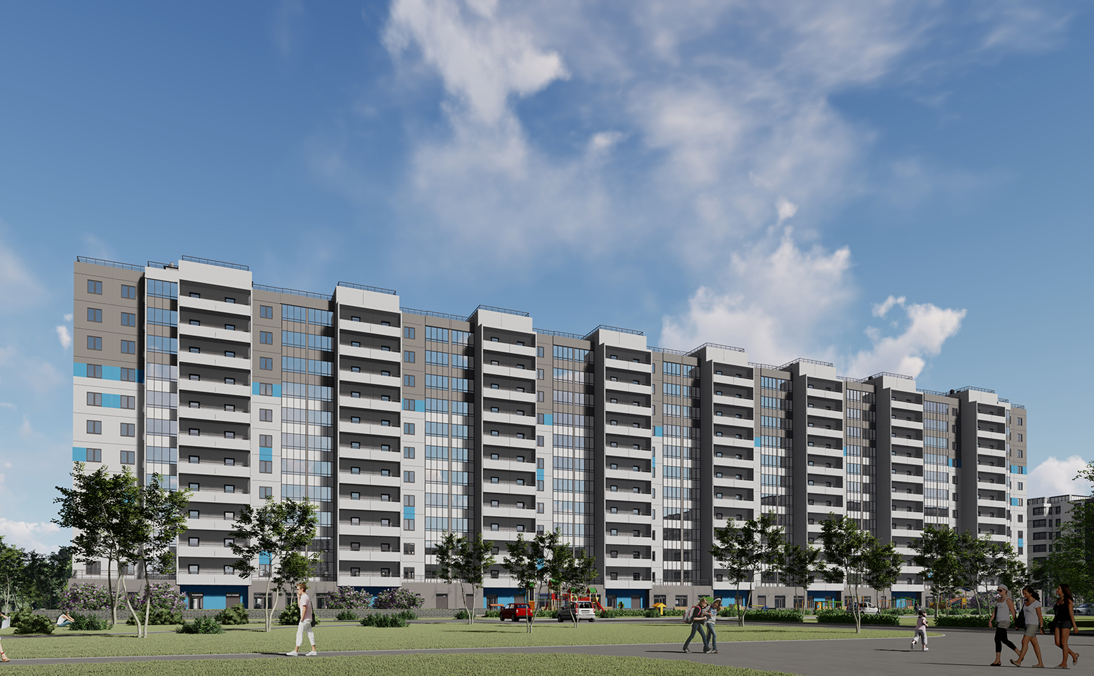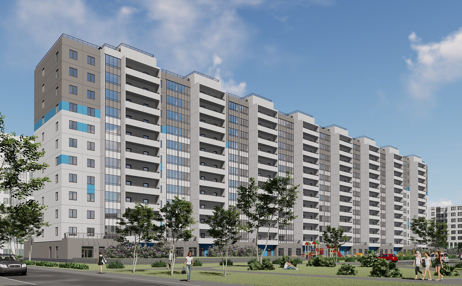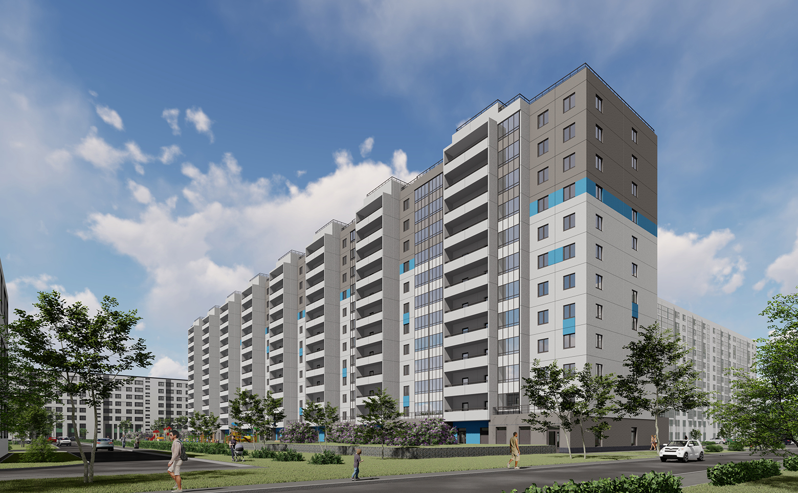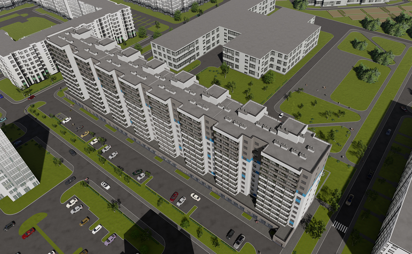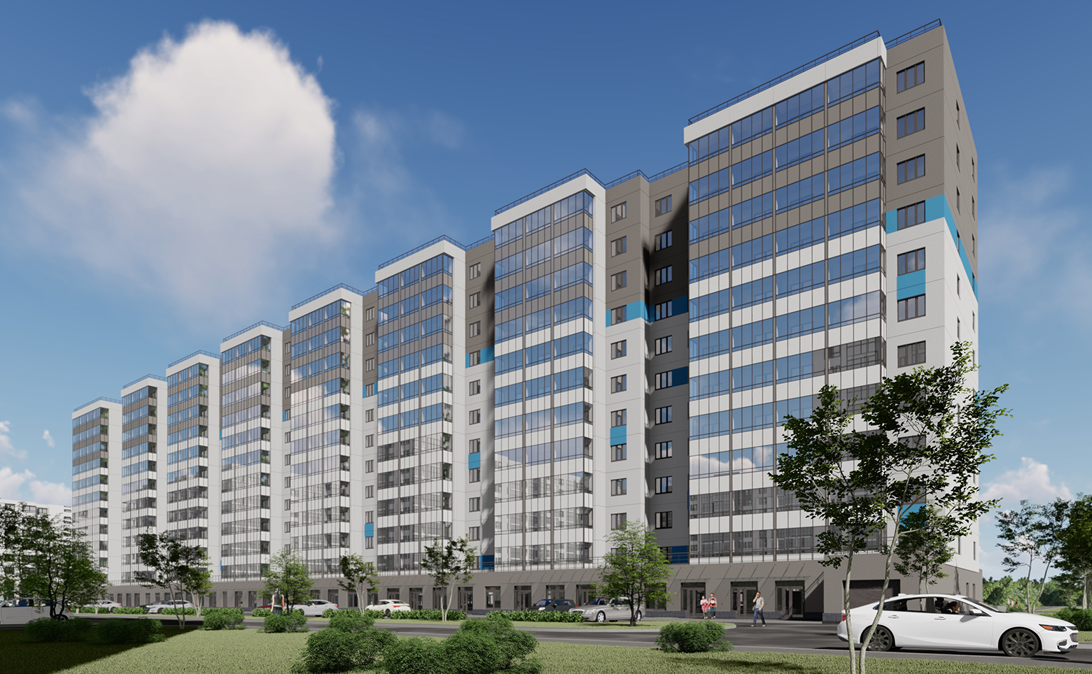 Проект представляет собой монолитный дом высотой 12 этажей. Фасады выполнены из панелей и покраски в светлые, серые и голубые оттенки. Предусмотрено 2 входа в парадные с фасада здания и со двора.