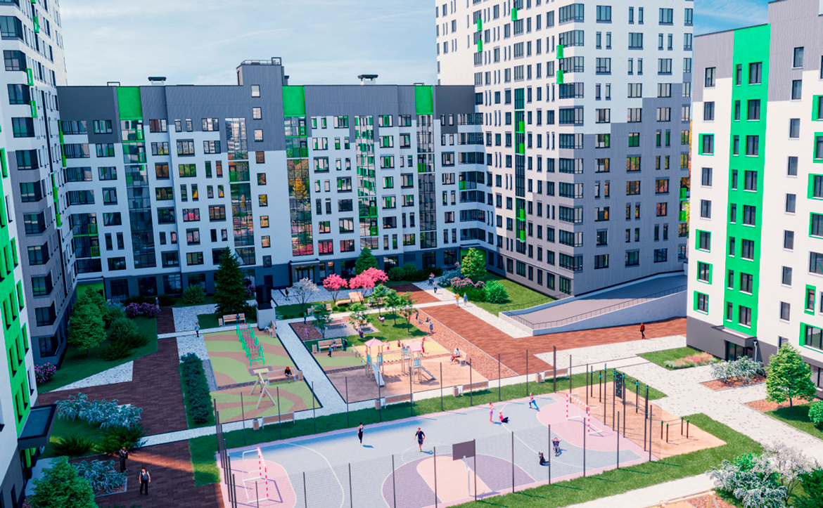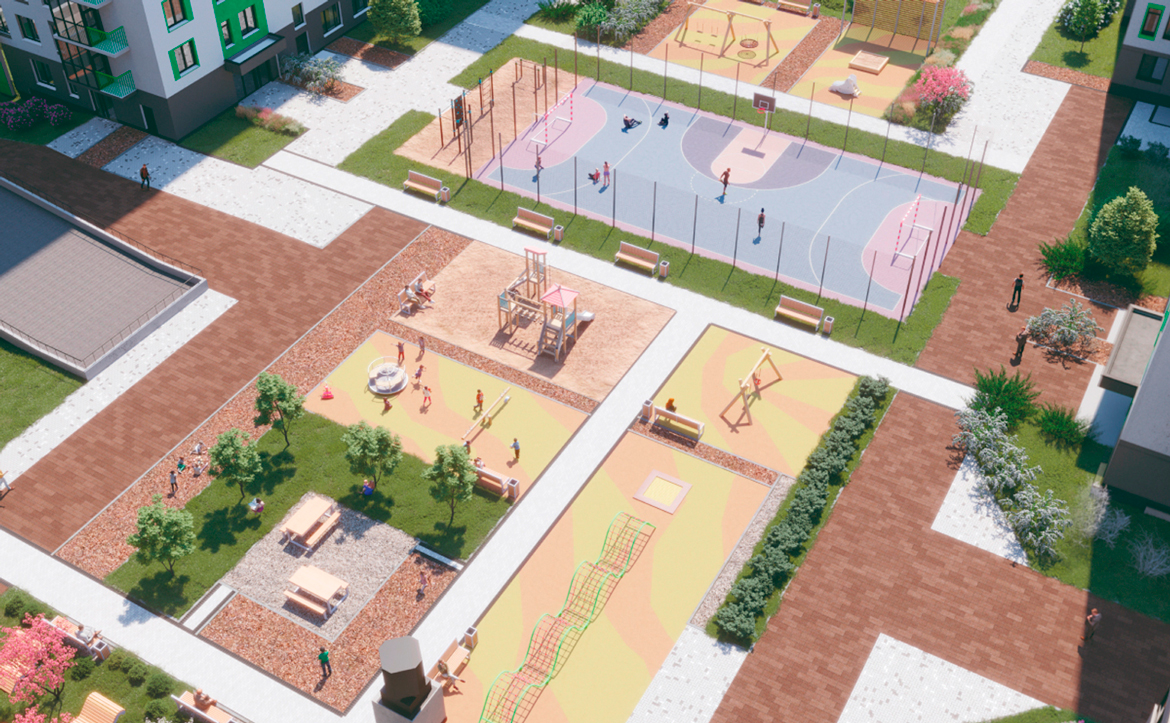 Внутренняя инфрастуктура проекта предлагает жителям удобства для комфортной жизни. Одна треть территории — это ухоженные зеленые зоны. Двор оснащен скамейками, дорожками для прогулок, футбольным и стритбольным полем, а также игровыми площадками. Дома располагаются по периметру и создают приватную территорию, защищенную от шума. Спроектирован большой внутренний двор без автомобилей, с круглосуточной охранной и видеонаблюдением. На первых этажах расположены помещения под коммерцию. Для автомобилей предусмотрен подземный паркинг.