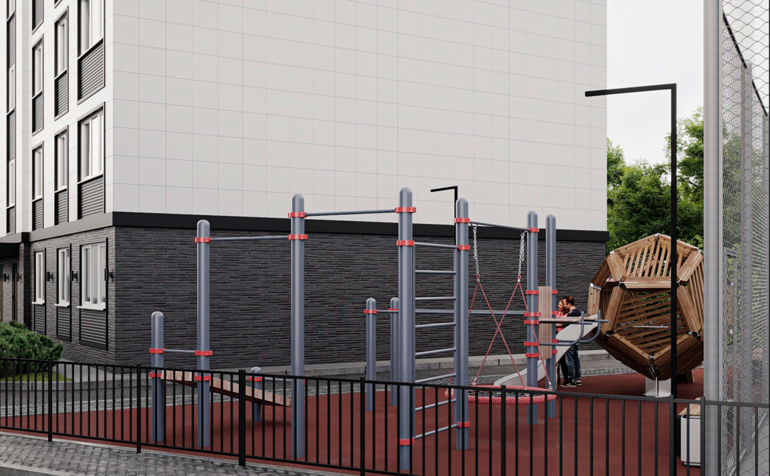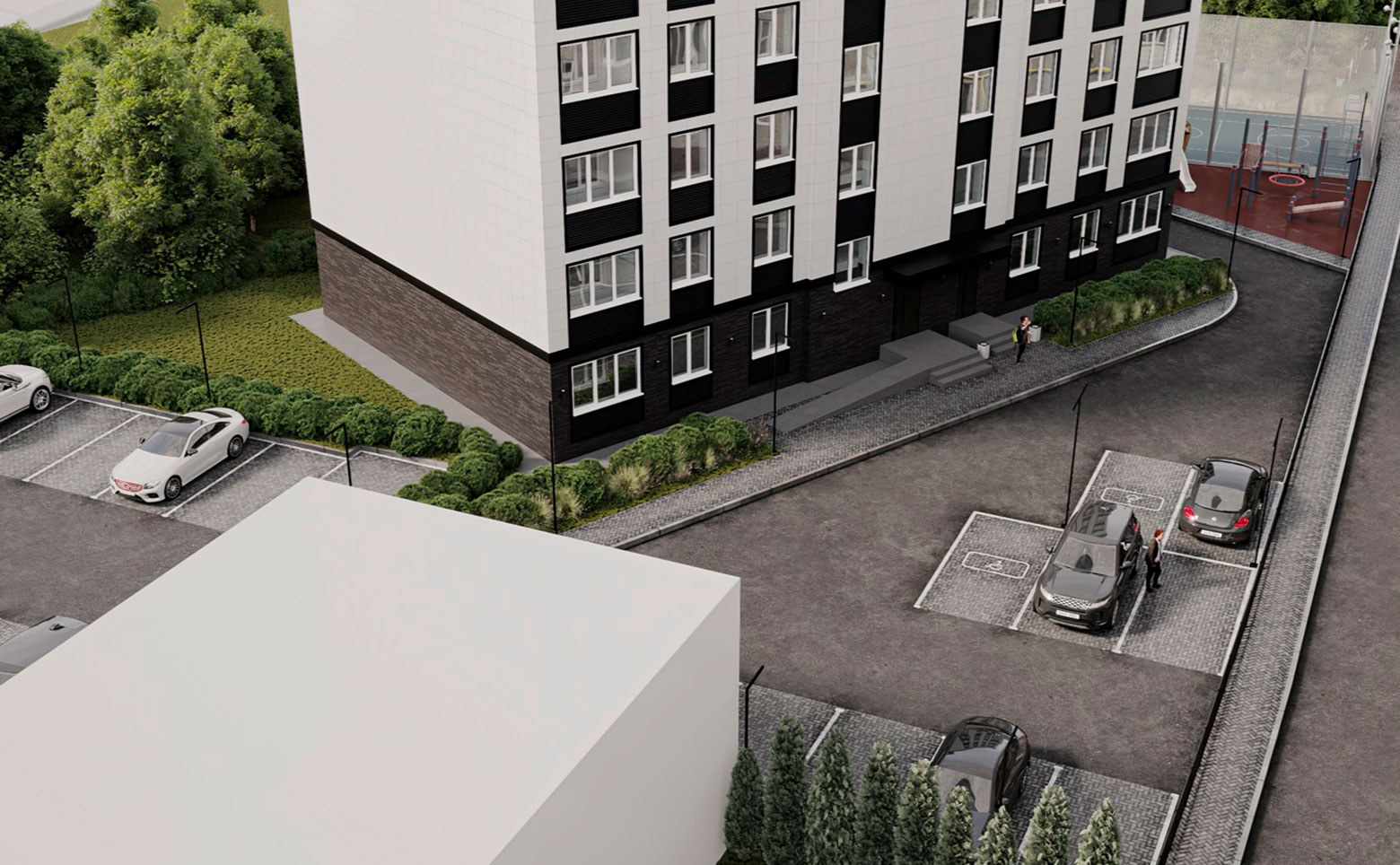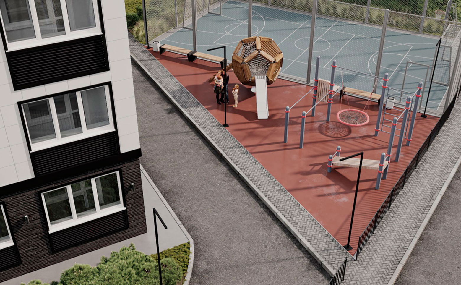 На территории жилого комплекса выполнены ландшафтный дизайн и озеленение. Двор оснащен детской и спортивной площадками. Для владельцев авто организована стоянка. Установлено видеонаблюдение и видеодомофоны.