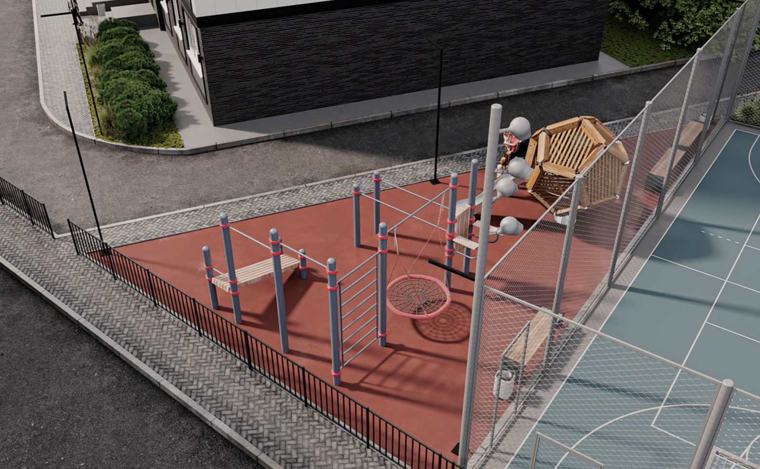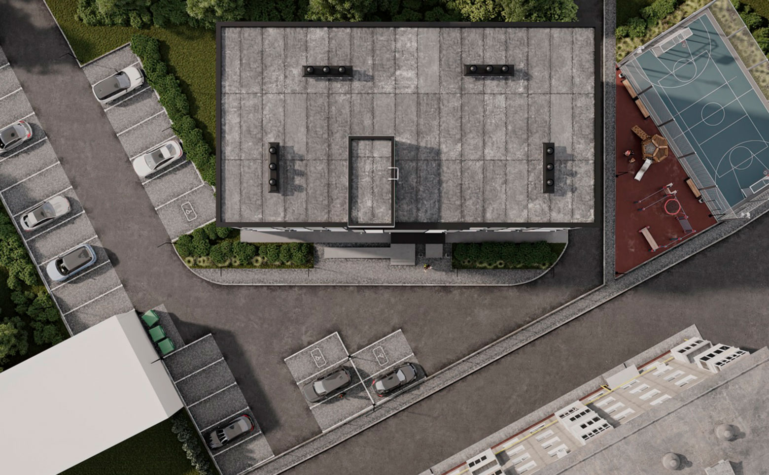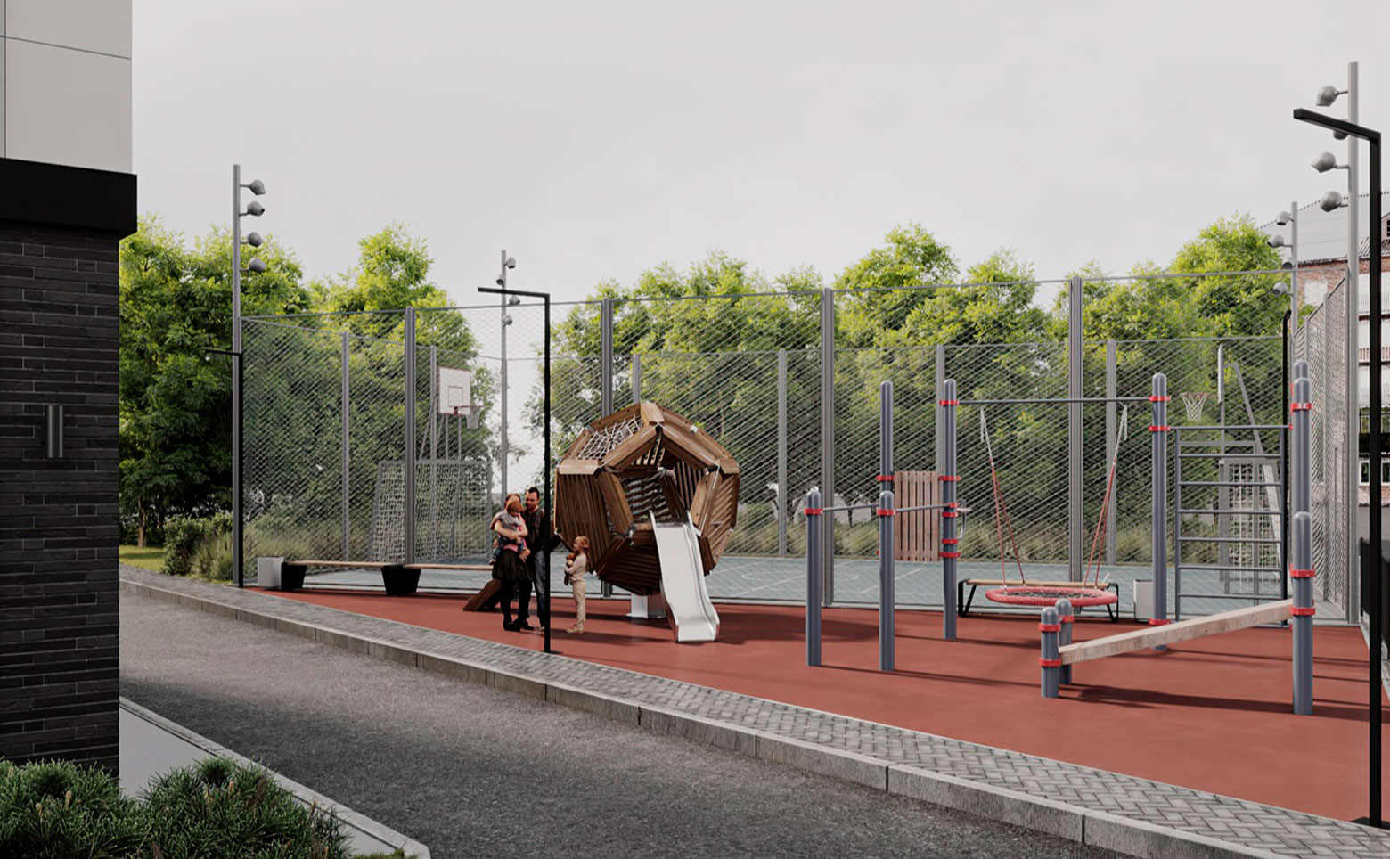 На территории жилого комплекса выполнены ландшафтный дизайн и озеленение. Двор оснащен детской и спортивной площадками. Для владельцев авто организована стоянка. Установлено видеонаблюдение и видеодомофоны.