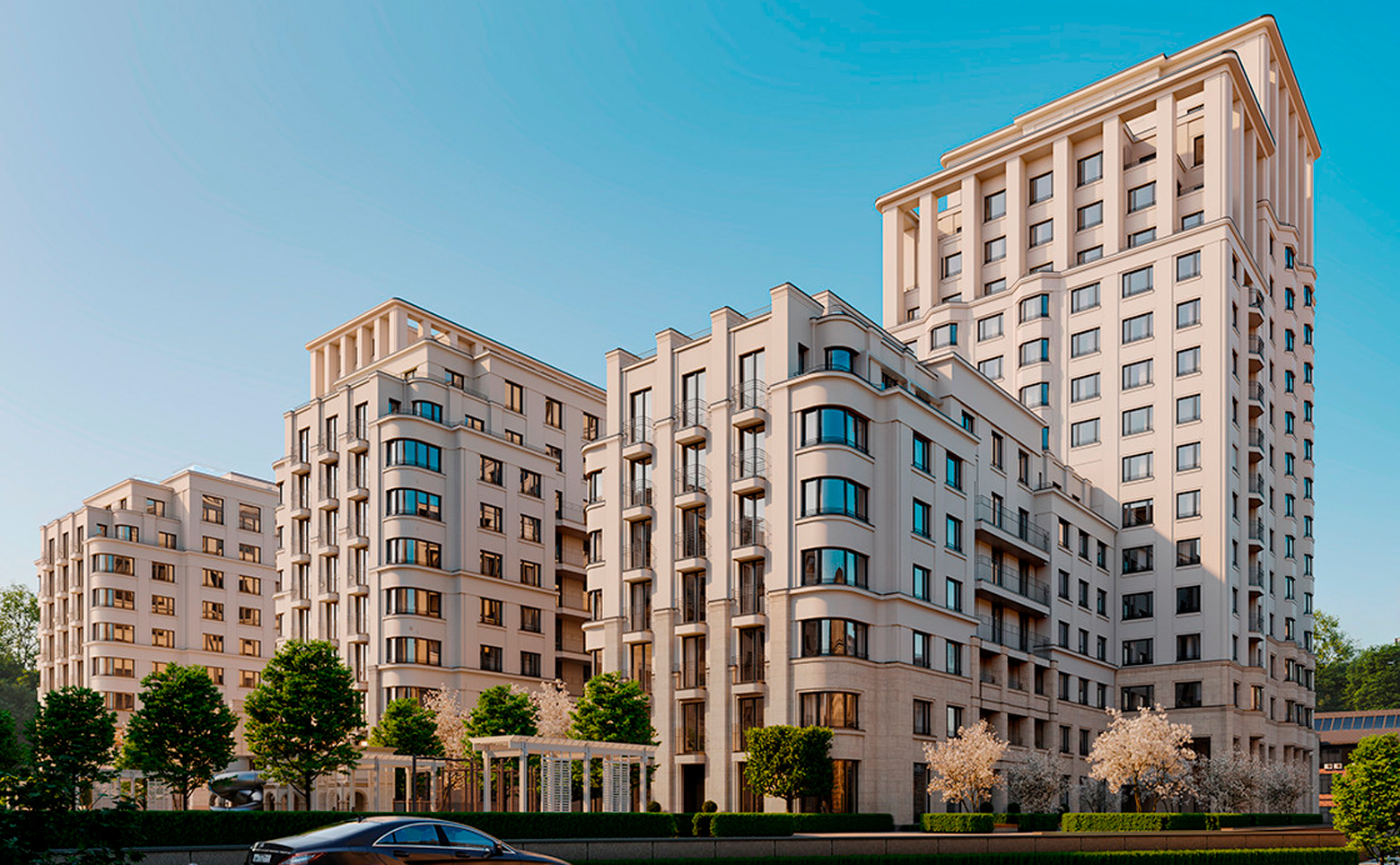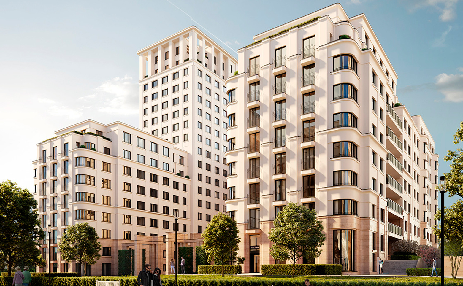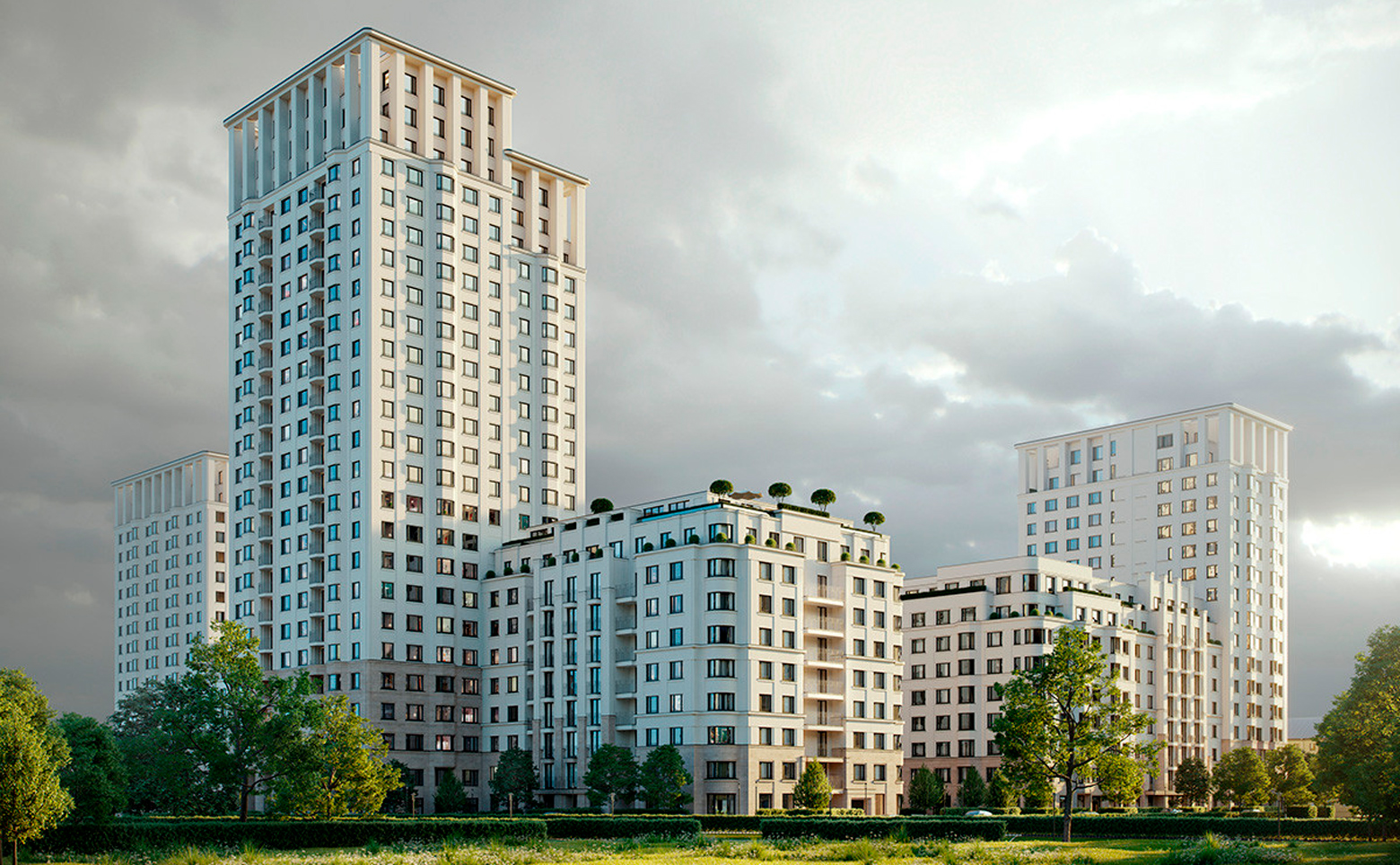 Жилой комплекс состоит из 4 домов переменной высотности от 7 до 25 этажей, возведенных по долговечной кирпично-монолитной технологии строительства с вентилируемыми фасадами из керамогранита. Проект разработан немецким архитектурным бюро в стиле неоклассики. В домах прозрачные входные группы со вторым светом, выполненные в стиле современной классики с элементами модерна. В вестибюле первого этажа организованы зоны отдыха и ожидания гостей, организованы колясочные комнаты, установлены современные лифты.