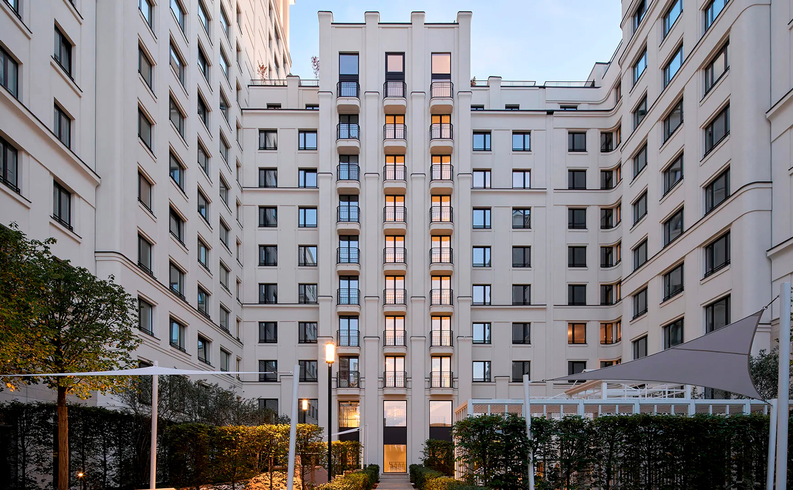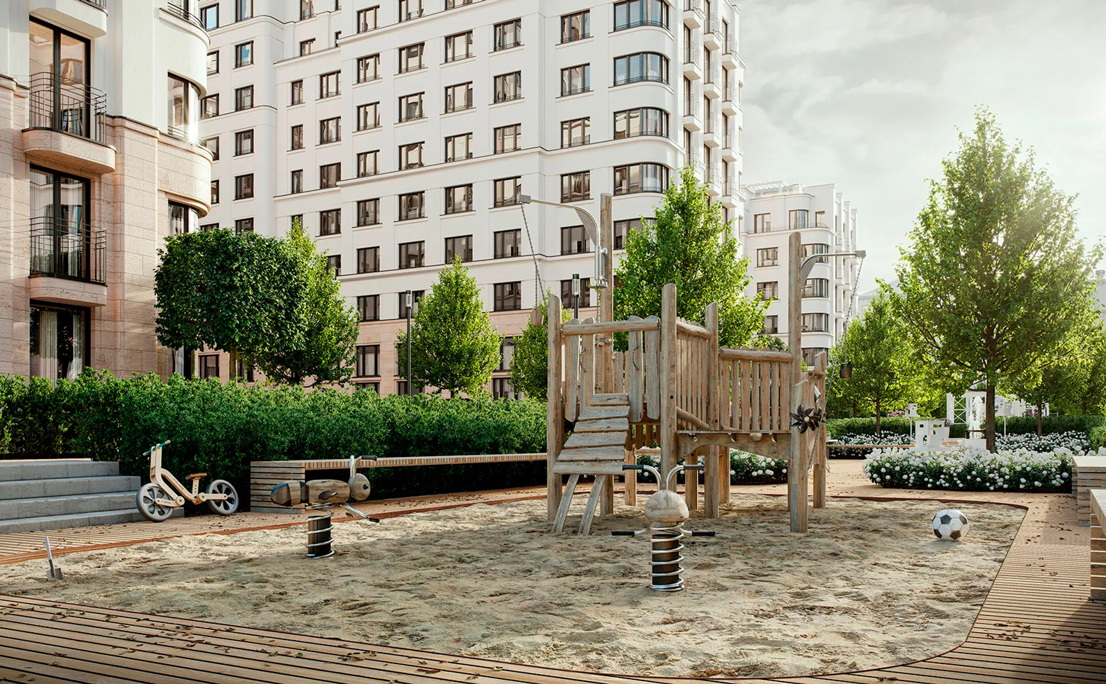 На первом этаже комплекса предусмотрены торгово-офисные помещения. В них располагаются магазины, аптеки, кафе, с отдельным выходом на улицу. Вход во двор организован через колоннаду. Двор украшен большим количеством растений, фонтанами, цветущими кустарниками. В центре двора — две детские площадки, одна из которых представляет собой полосу препятствий с геопластикой и травяным покрытием. Также во дворе размещены беседка-пергола для отдыха и патио с деревянными настилами и уличной мебелью.