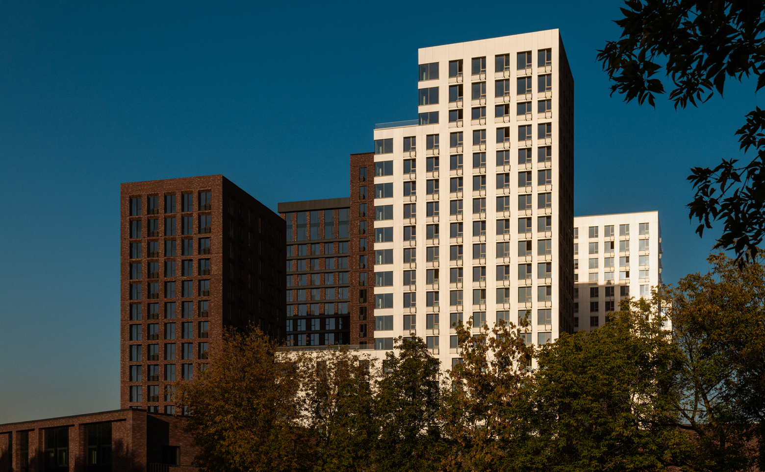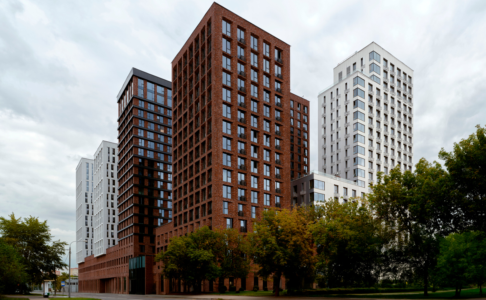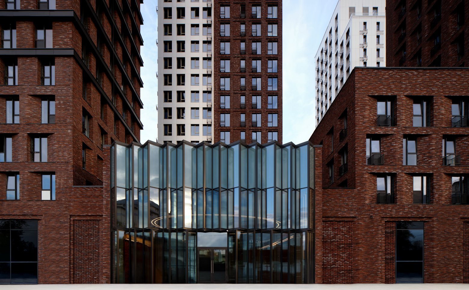 Проект представляет собой комплексную застройку с современной архитектурой, разработанной бюро APEX. Высота зданий варьируется от 4 до 21 этажа, фасады оформлены в контрастных сочетаниях антрацитового, угольно-терракотового и светло-серого оттенков. Для облицовки использованы бетонная плитка под клинкерный кирпич, алюминиевые композитные панели и фиброцемент. Входные группы выполнены в формате авторских лобби с потолками до 9 м, природными элементами, зонами отдыха, кофе-поинтом и ресепшеном. В центре расположено стеклянное лобби-куб от пола до потолка.