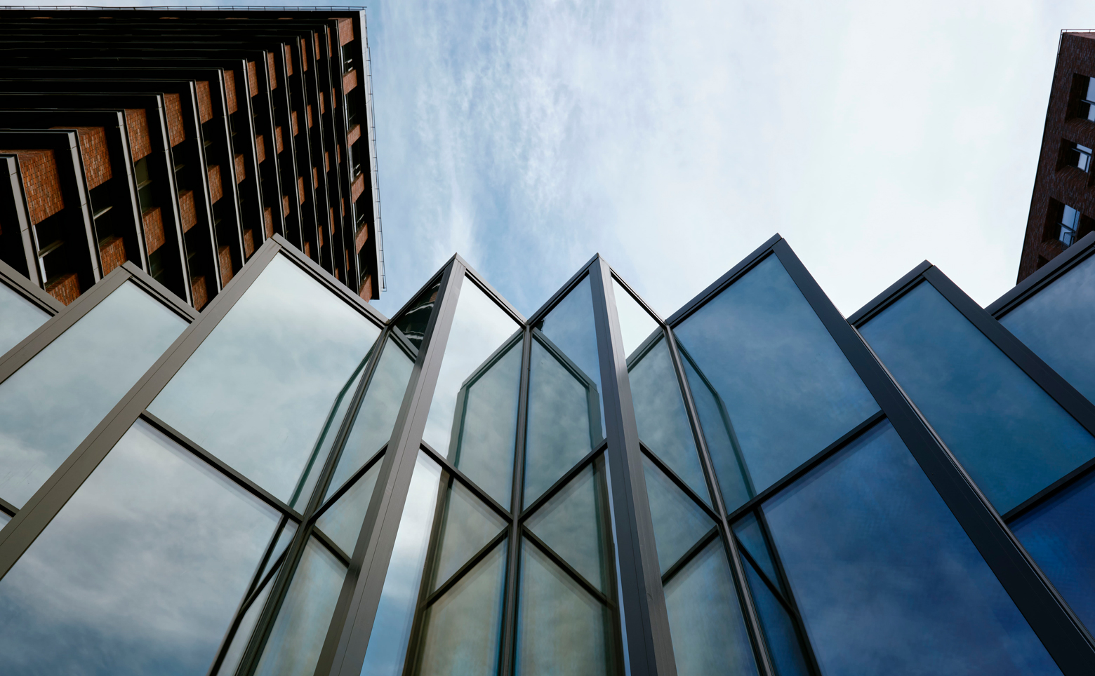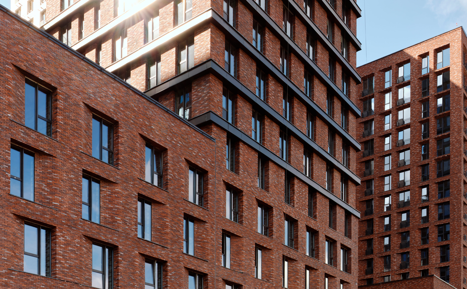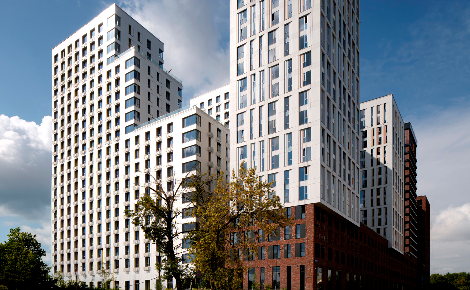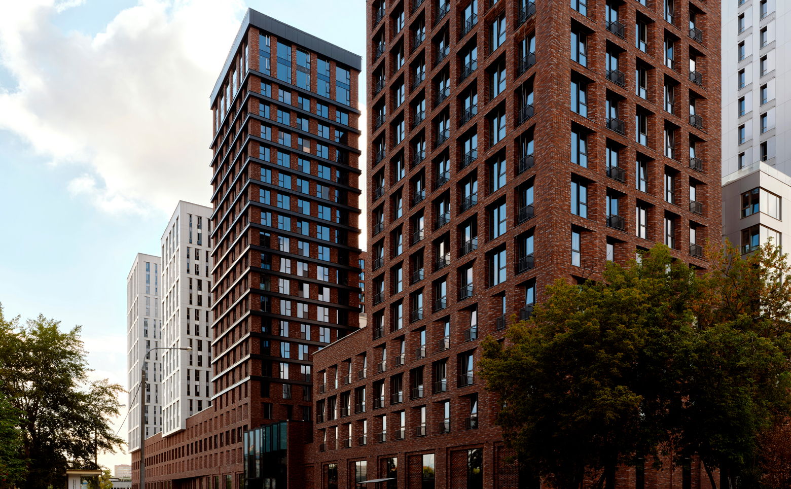 Проект представляет собой комплексную застройку с современной архитектурой, разработанной бюро APEX. Высота зданий варьируется от 4 до 21 этажа, фасады оформлены в контрастных сочетаниях антрацитового, угольно-терракотового и светло-серого оттенков. Для облицовки использованы бетонная плитка под клинкерный кирпич, алюминиевые композитные панели и фиброцемент. Входные группы выполнены в формате авторских лобби с потолками до 9 м, природными элементами, зонами отдыха, кофе-поинтом и ресепшеном. В центре расположено стеклянное лобби-куб от пола до потолка.
