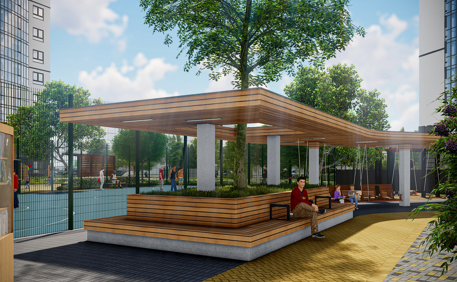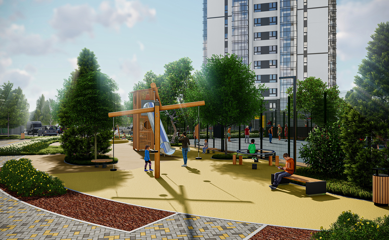 Жилой комплекс имеет просторную парковую зону площадью около 1 000 кв. м. На территории внутреннего двора-парка нет автомобильных проездов, тщательно продуман ландшафтный дизайн с природными холмами, множеством зеленых насаждений и цветников. Экостиль прослеживается во всех деталях: деревянные беседки с качелями, натуральный материал детских игровых площадок, декоративные природные элементы. В проекте предусмотрены многофункциональная спортивная площадка и велодорожки.