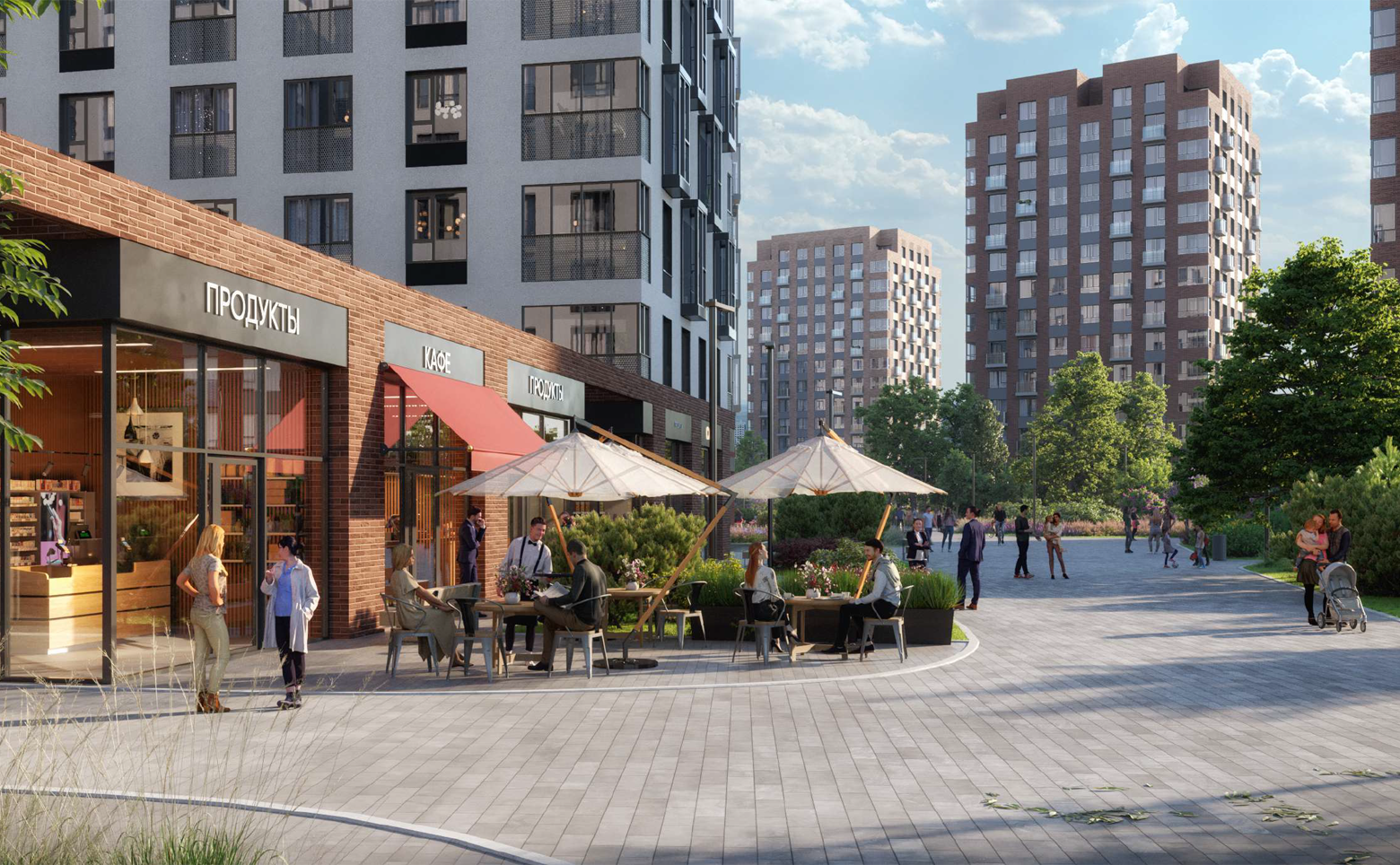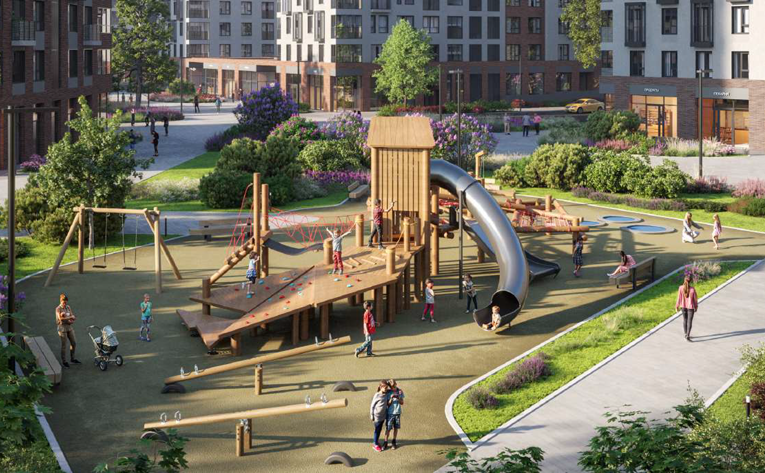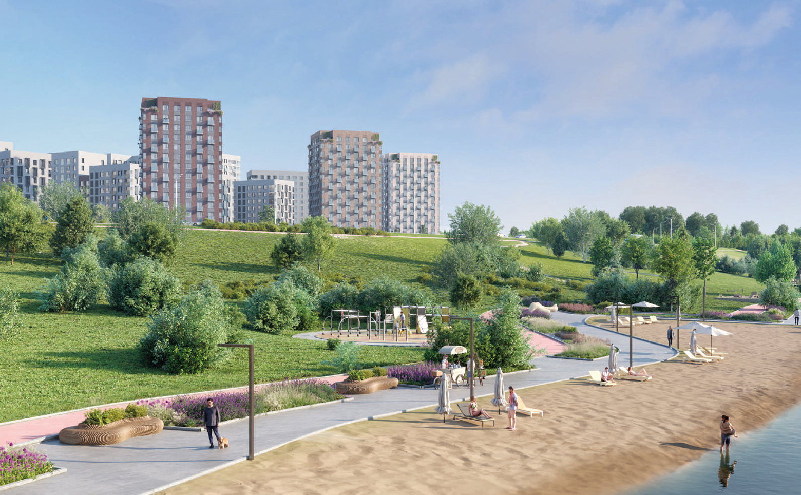 Благоустройство территории комплекса отличается выразительным рельефом, озеленением, приподнятыми клумбами и современными игровыми площадками для детей всех возрастов. Во дворах акцент делается на тихий отдых и игры для детей, а основная активность будет сосредоточена на масштабных плейхабах в зонах общественных пространств. Через весь микрорайон до набережной и парка проходит бульвар с миниплазами, садами и скверами.