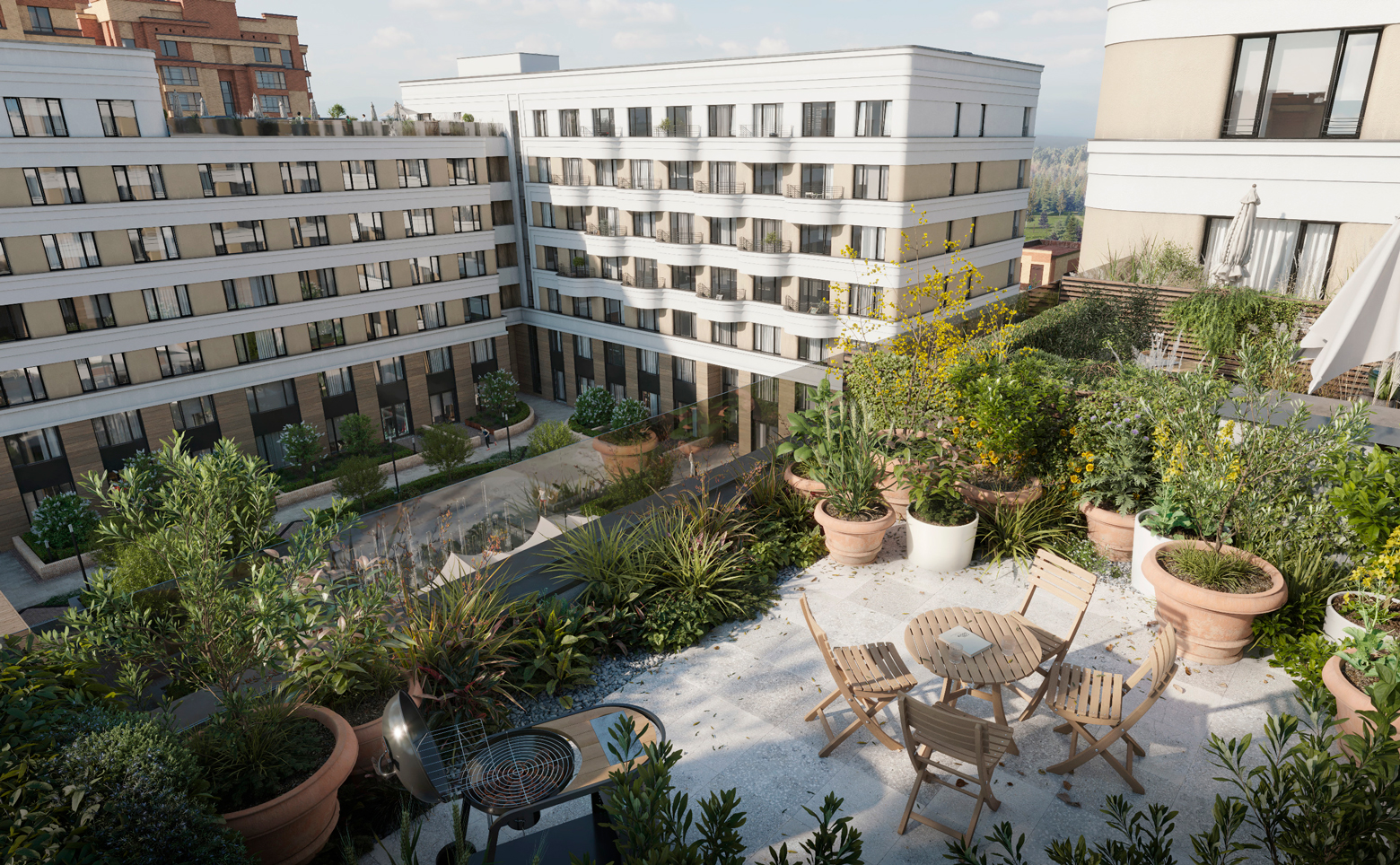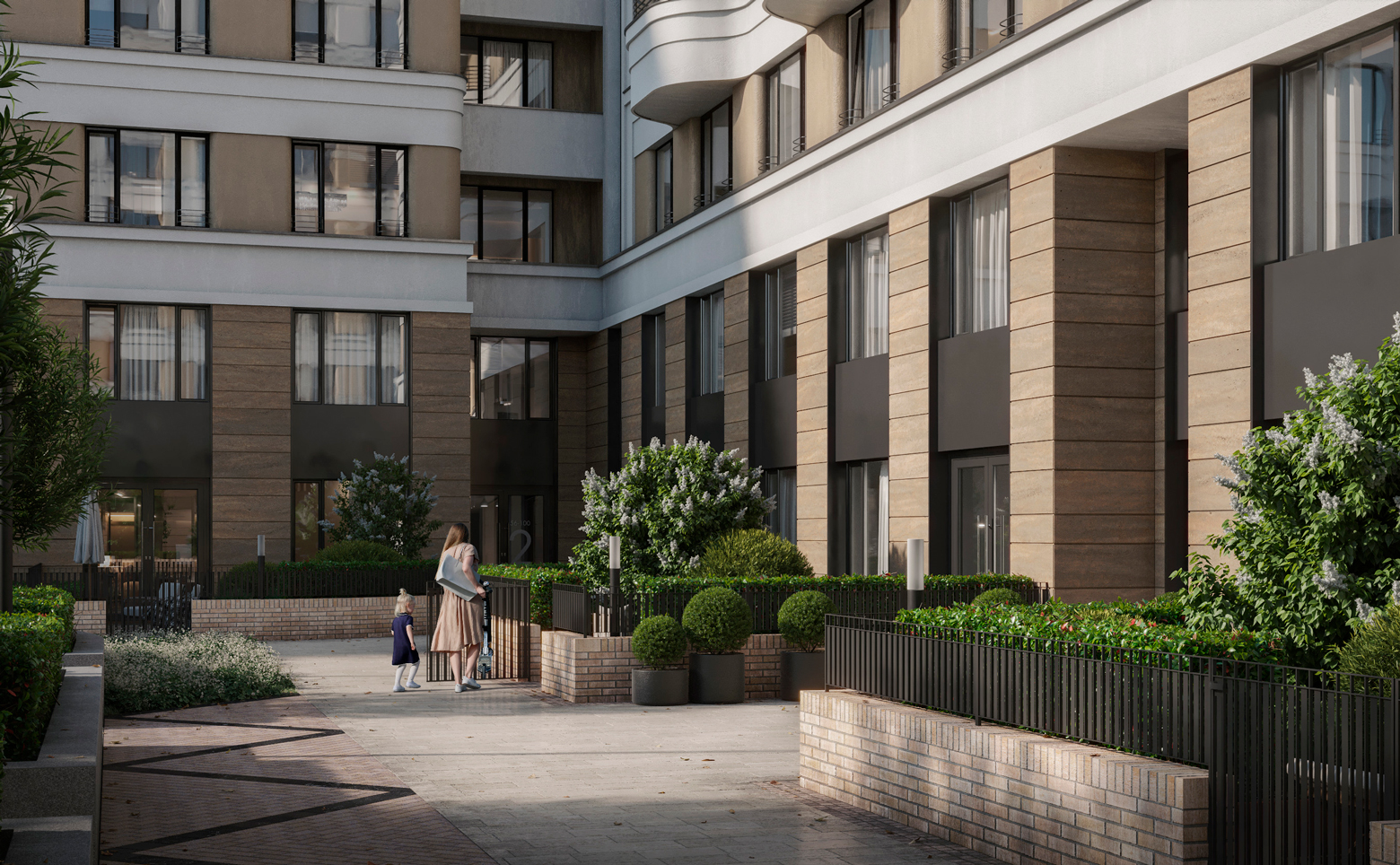 Территория проекта благоустроена, на ней ведется видеонаблюдение. Во дворе выполнен ландшафтный дизайн, озеленение и спроектированы зоны отдыха. Для владельцев автомобилей предусмотрен подземный паркинг.