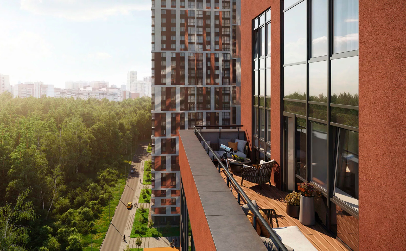 Внутренний двор закрыт от машин. Оборудованы детские игровые, спортивные площадки, амфитеатр. Для владельцев автомобилей предусмотрен подземный паркинг.
