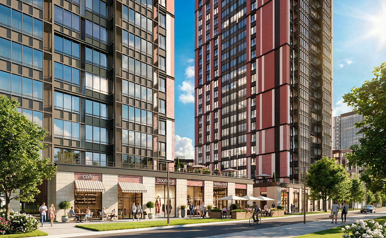 Жилой квартал бизнес-класса представлен 7-этажными домами с точечными высотными зданиями до 25 этажей. Дома возведены по кирпично-монолитной технологии, фасады выполнены по системе вентилируемых фасадов с облицовкой панелями. Концепция проекта разработана европейским архитектором Рикардо Бофиллом. В зданиях установлены пассажирские и грузовые лифты. Входные группы расположены на уровне земли, предусмотрены помещения для хранения колясок, велосипедов, самокатов и другого инвентаря.