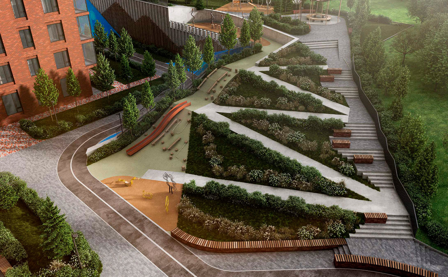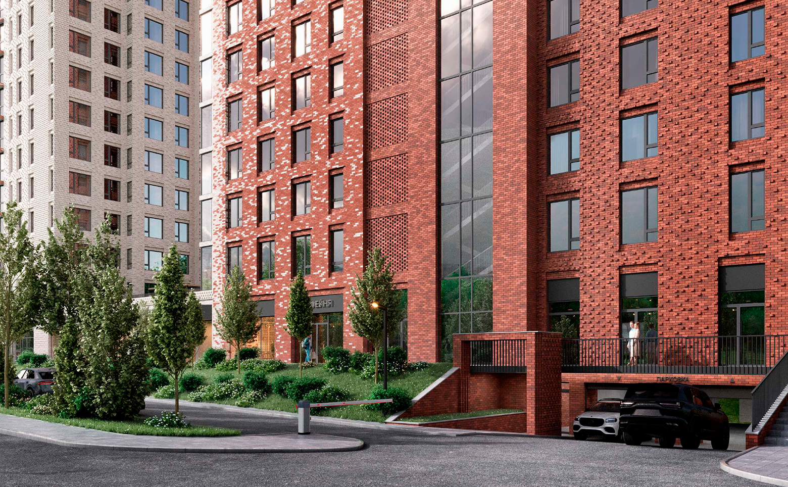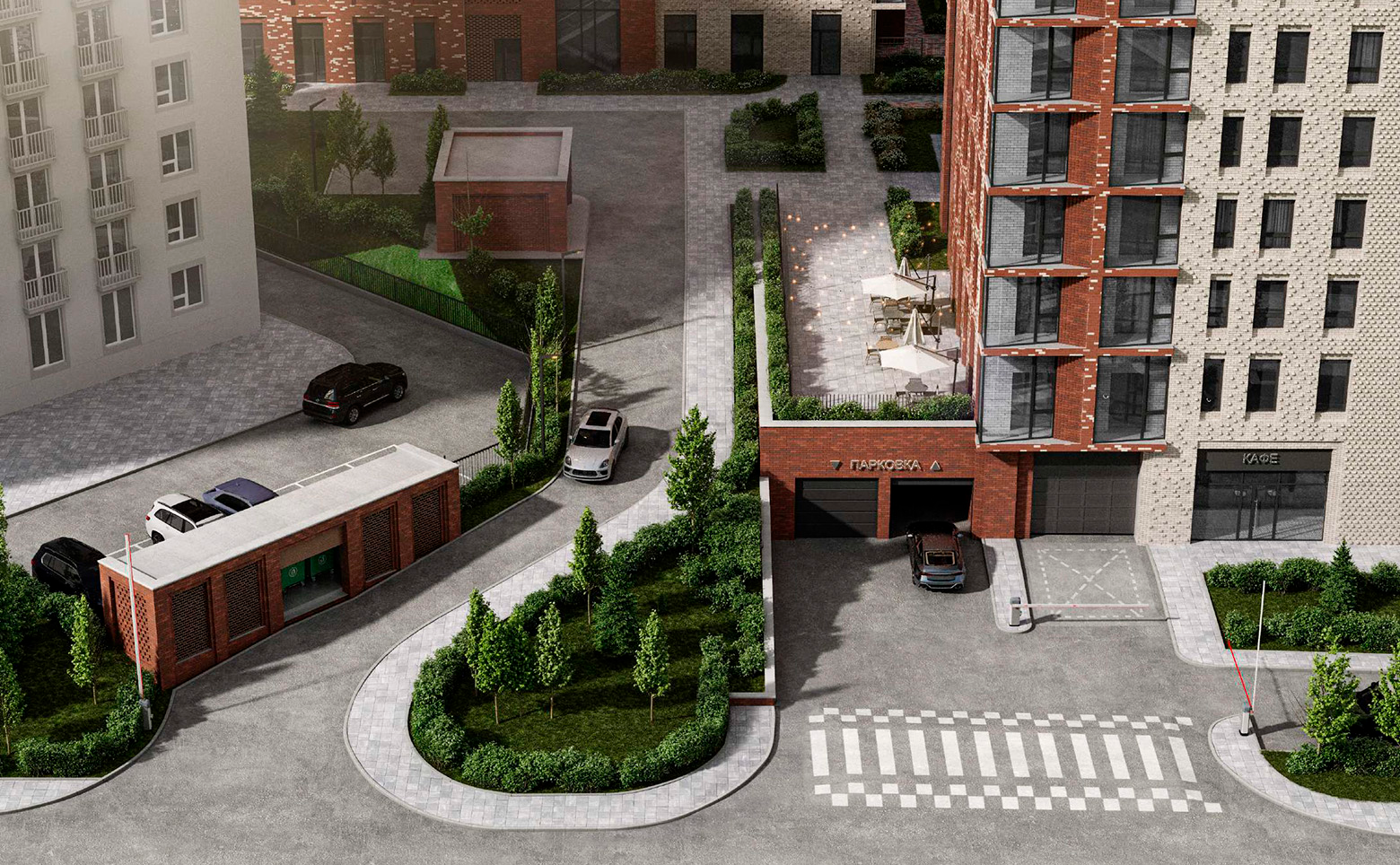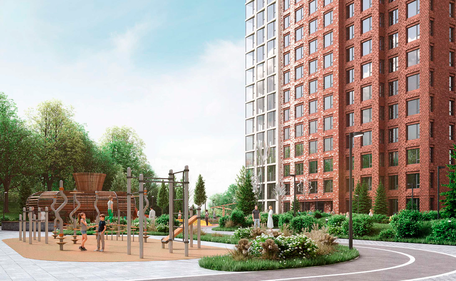 Придомовая территория комплекса спроектирована с элементами ландшафтного дизайна и зонами для активного и спокойного отдыха. Во дворе обустроены спортивные и детские площадки, кафе с террасой, беседка, большая песочница, зона с качелями и видом на озеро. Для автомобилистов предусмотрен подземный паркинг. Также организованы шахматное поле, турники и детская тематическая дорога.